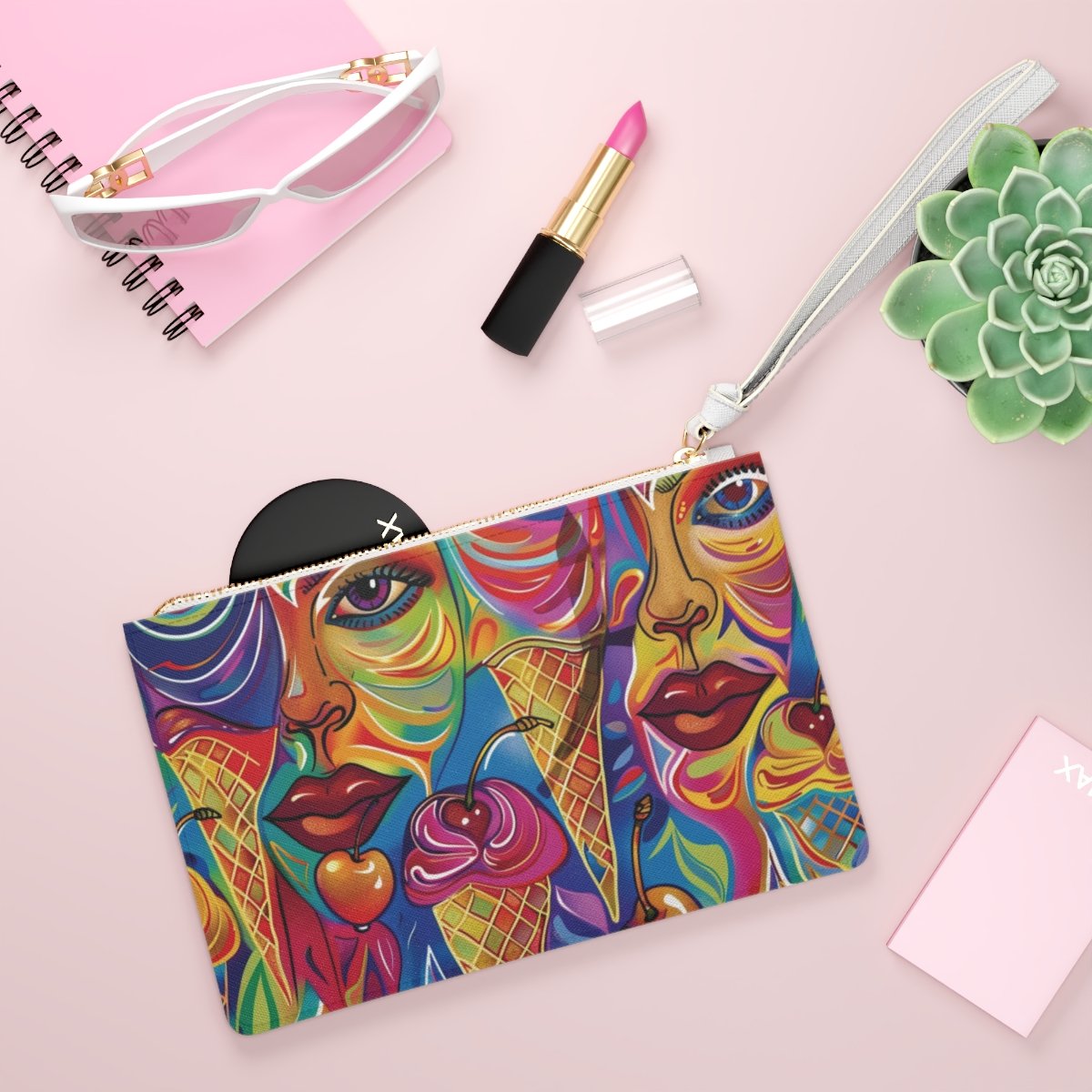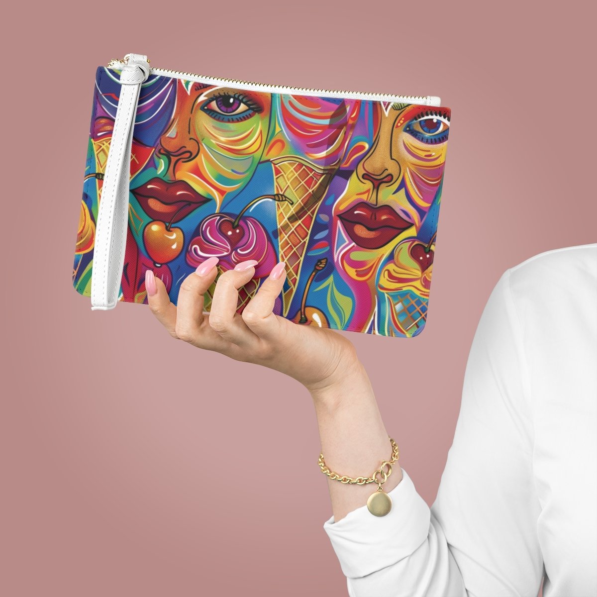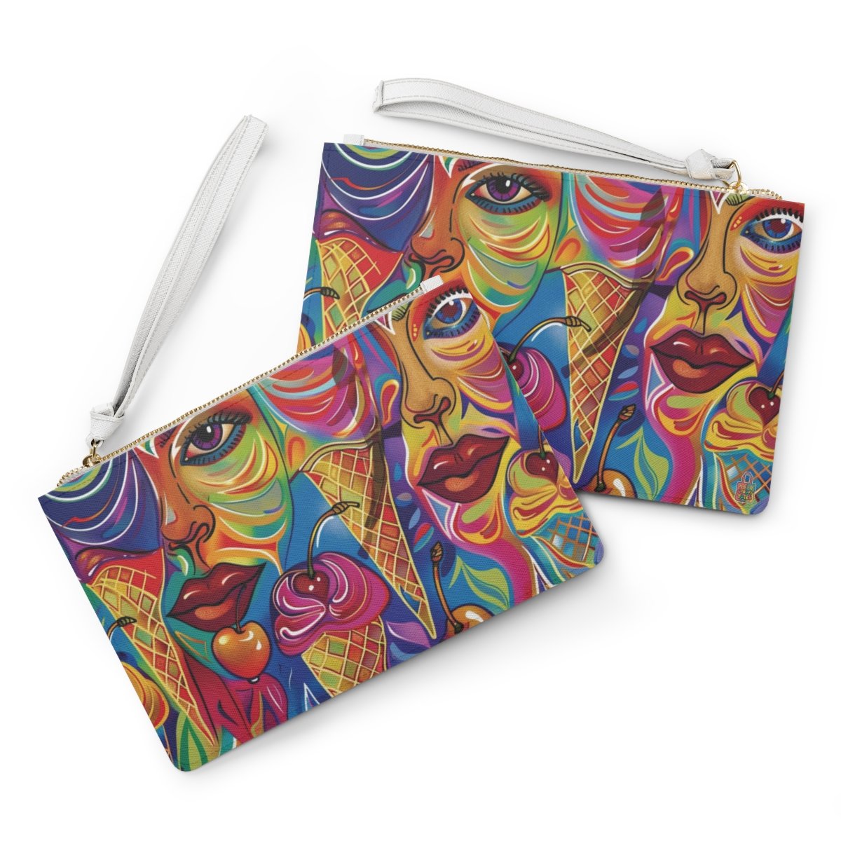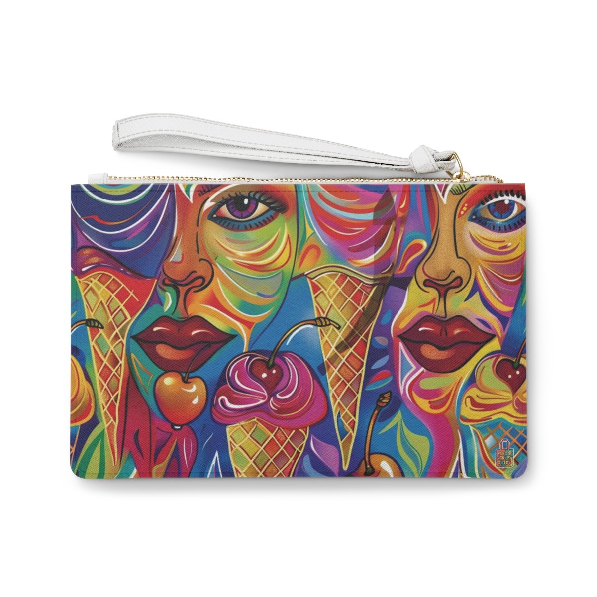 DESIGN: A retro abstract Cherry Dipped Cone with abstract faces. Colors are yellow, green, orange, purple, red, pink, and more. We hope you love it! Super cute little clutch bag.