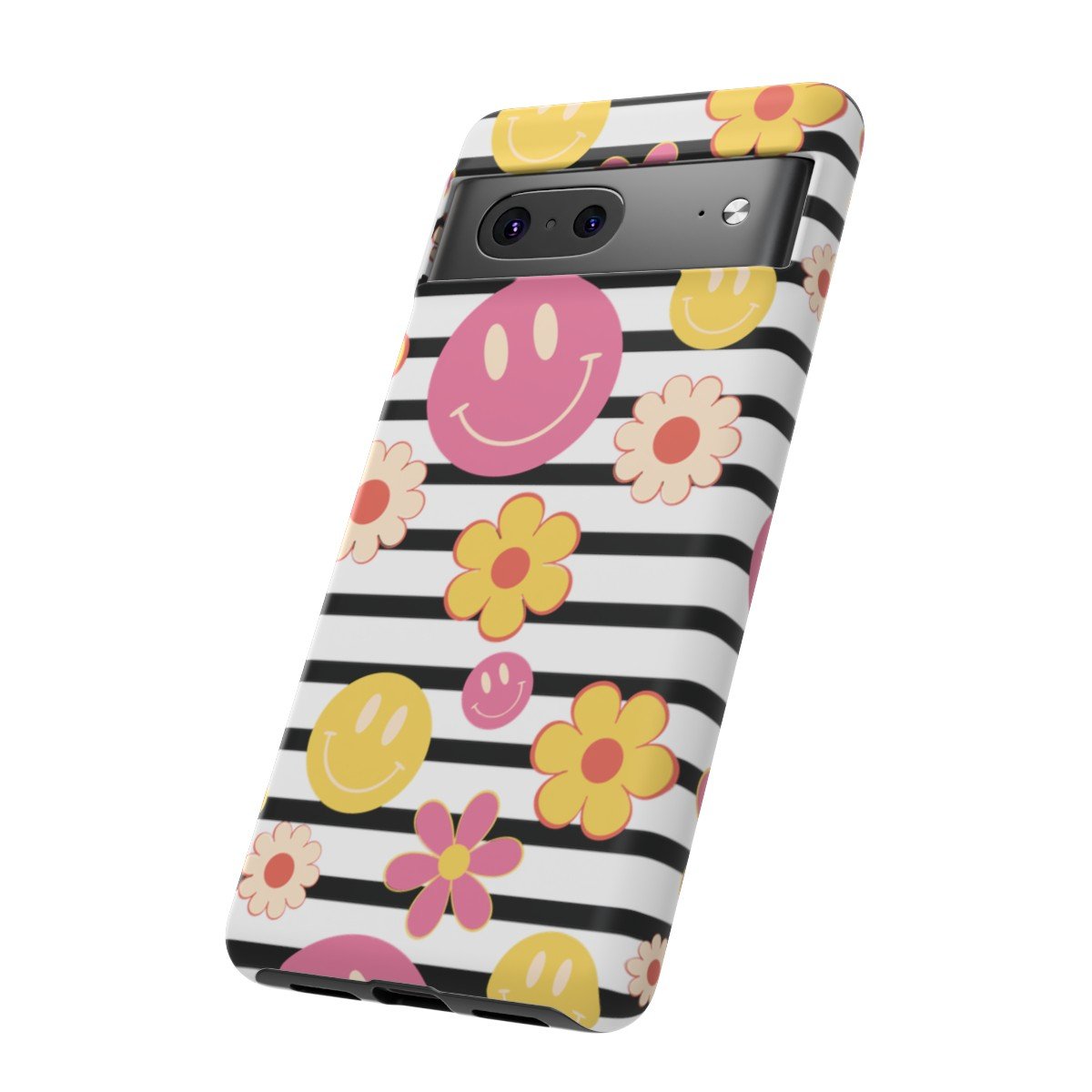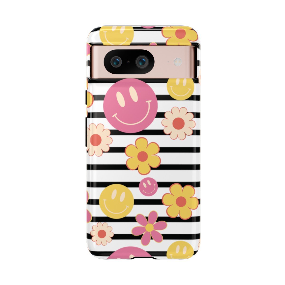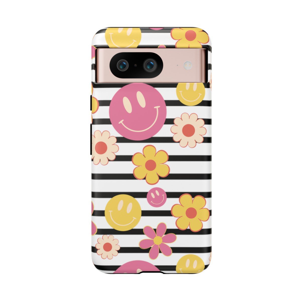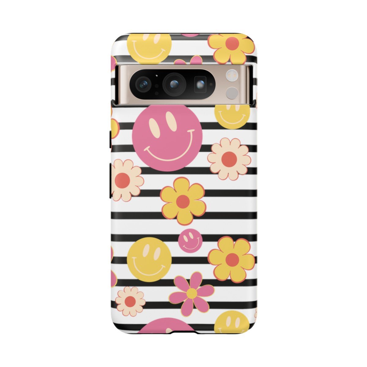 Black and White Stripes with Yellow and Pink Smileys and Retro Flowers  – Google Pixel 5 6 7 8 – Cell Phone – Tough Cases.