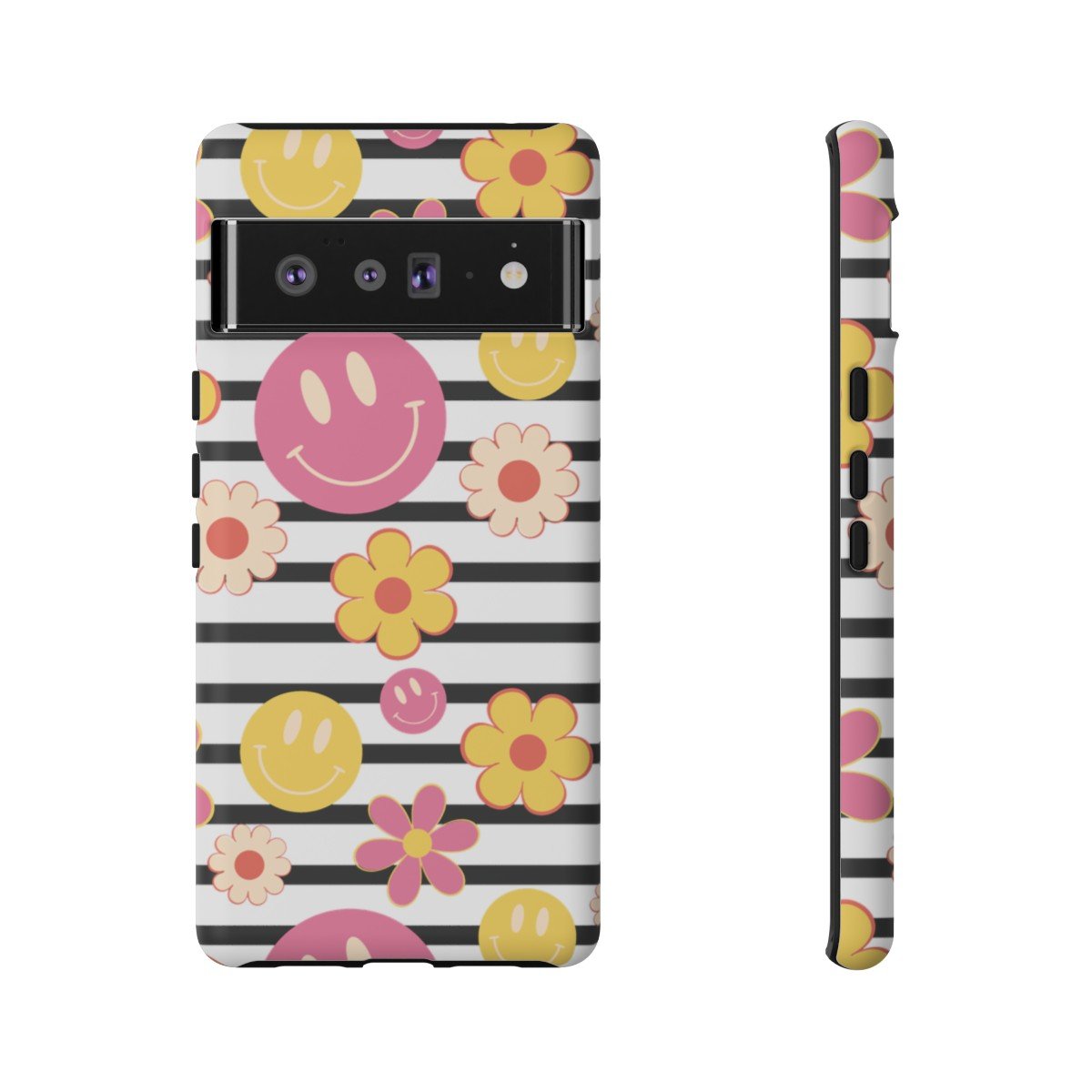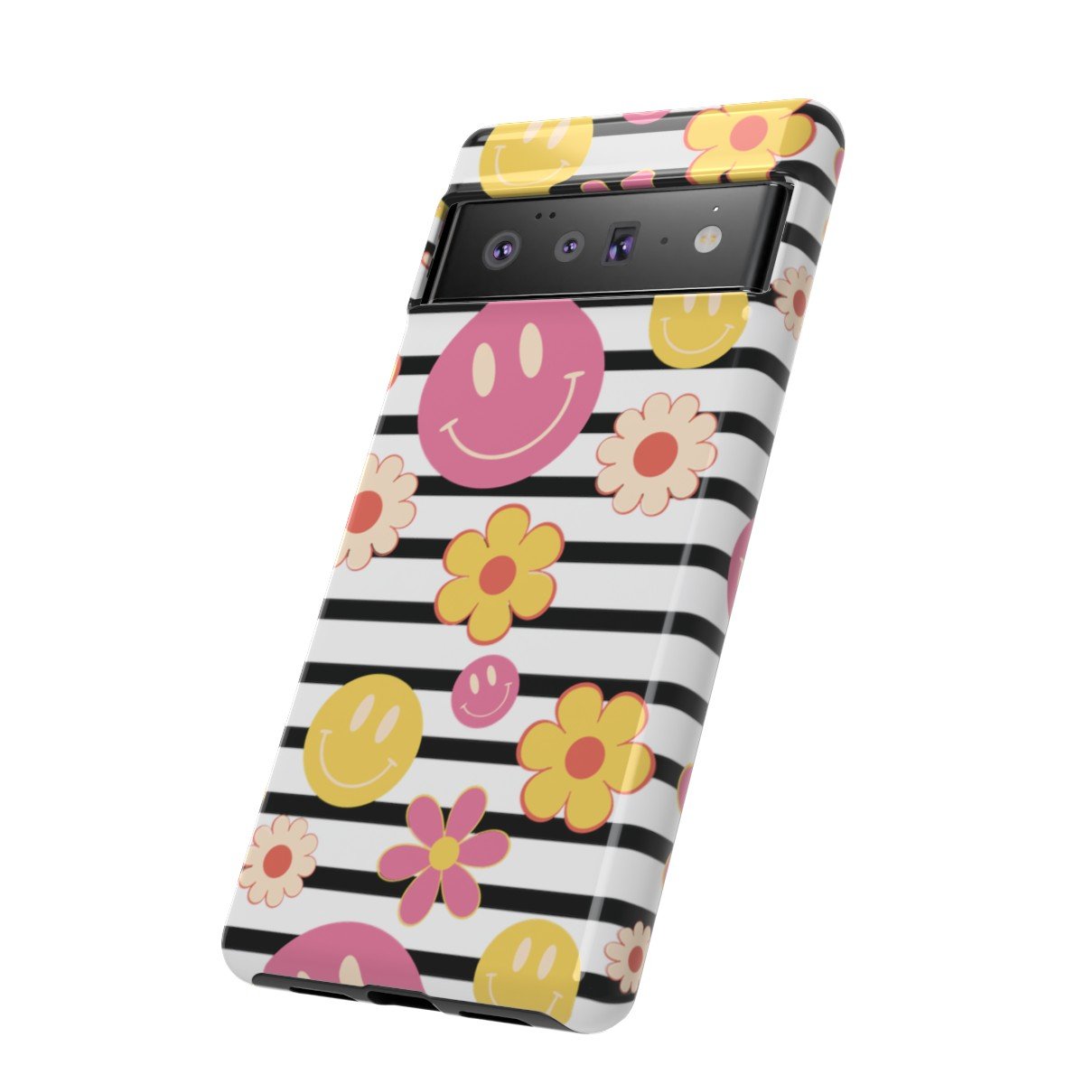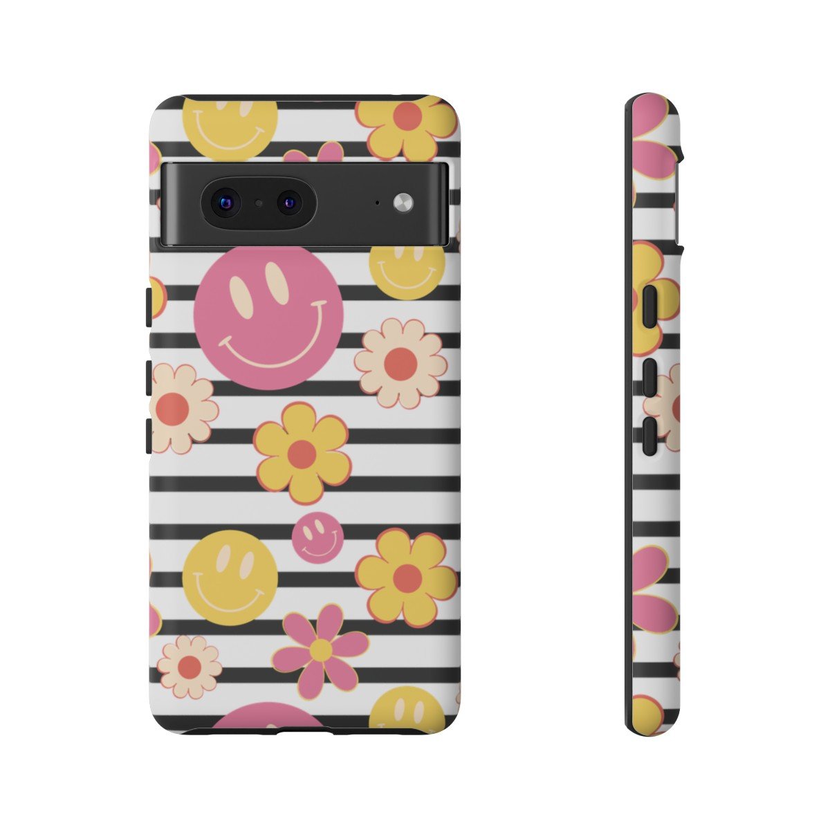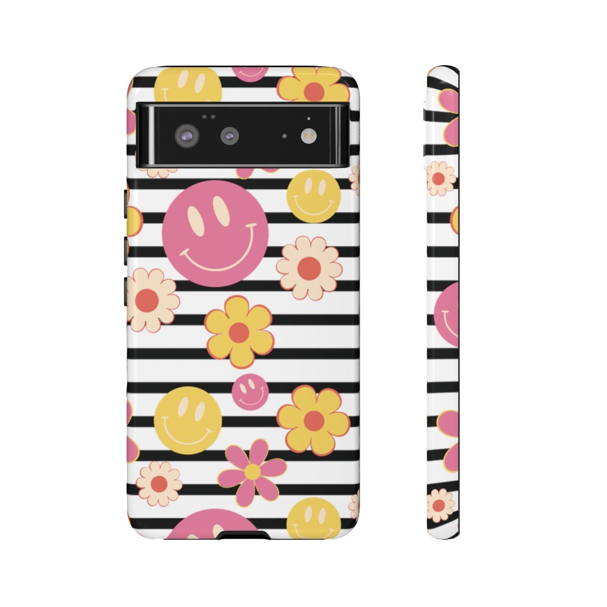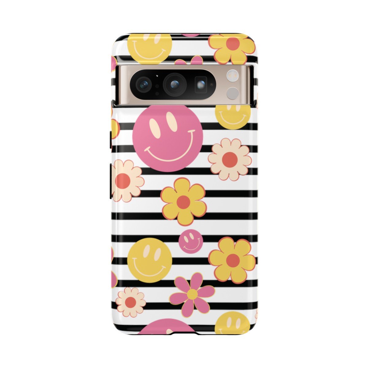 Black and White Stripes with Yellow and Pink Smileys and Retro Flowers  – Google Pixel 5 6 7 8 – Cell Phone – Tough Cases.