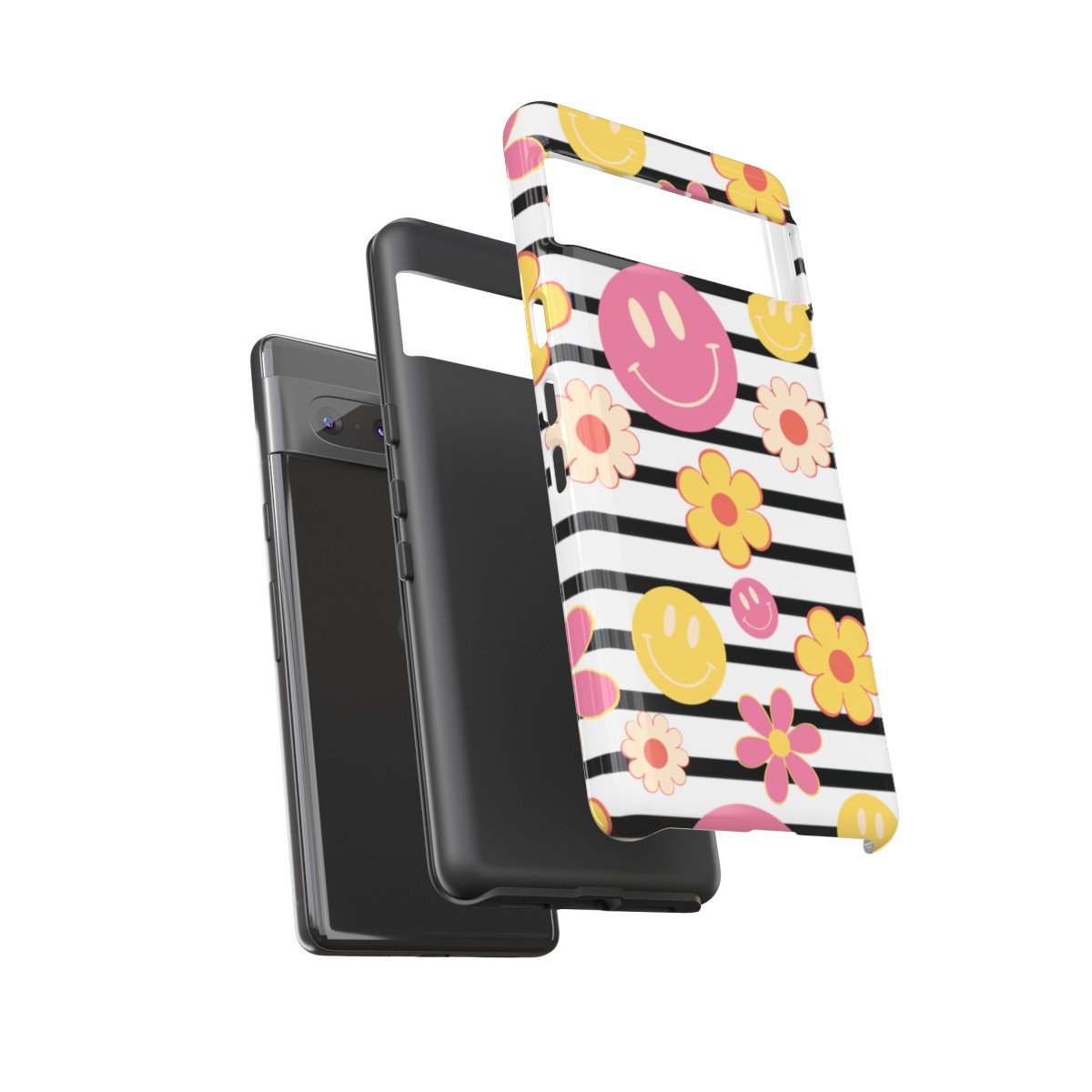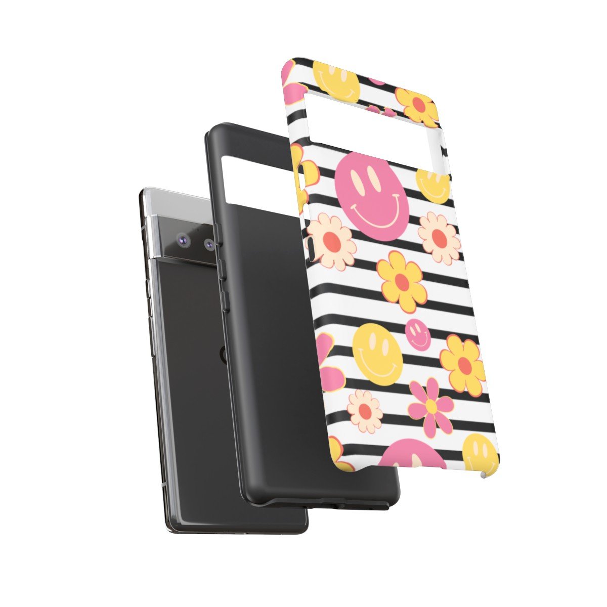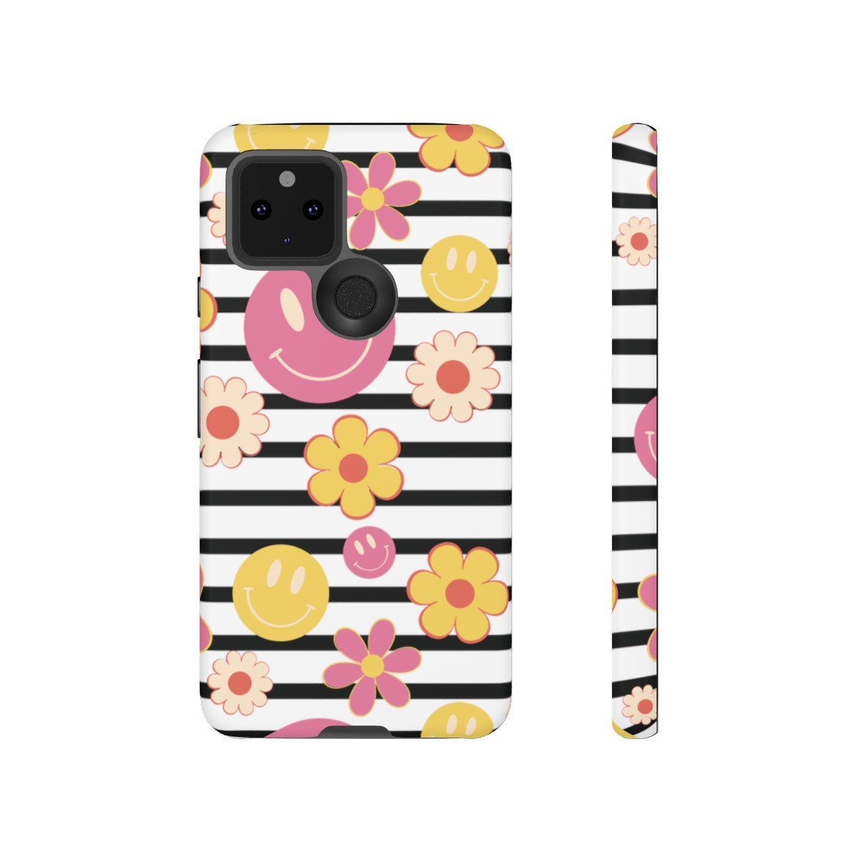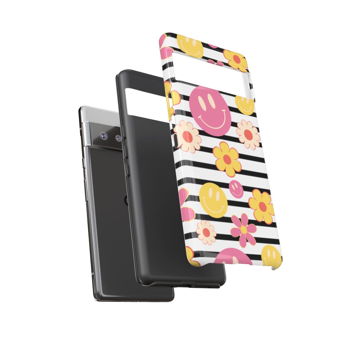 Black and White Stripes with Yellow and Pink Smileys and Retro Flowers  – Google Pixel 5 6 7 8 – Cell Phone – Tough Cases.