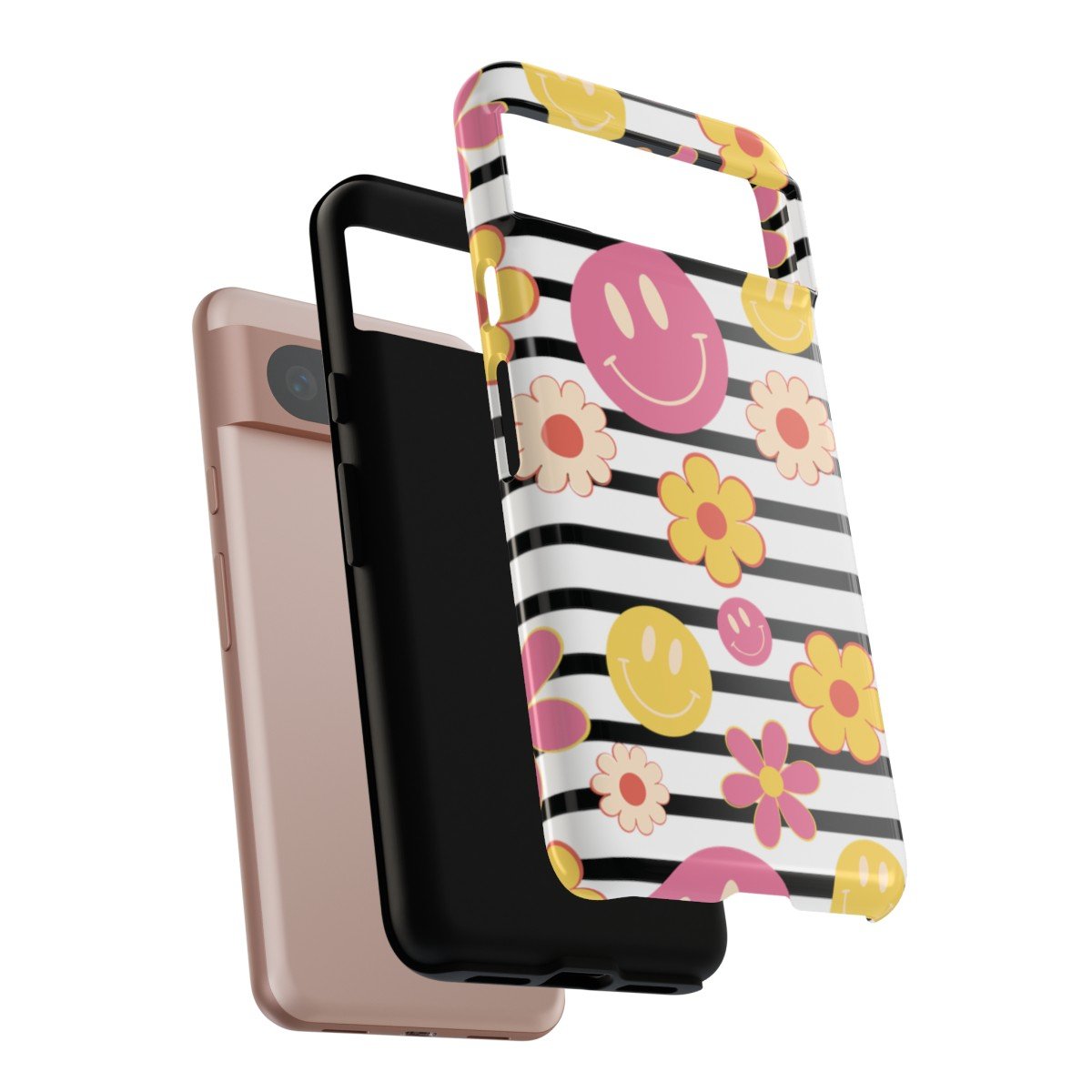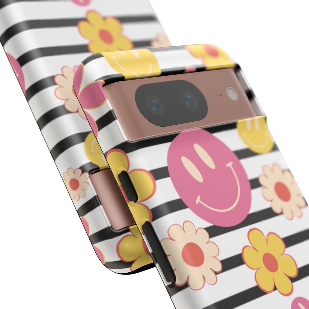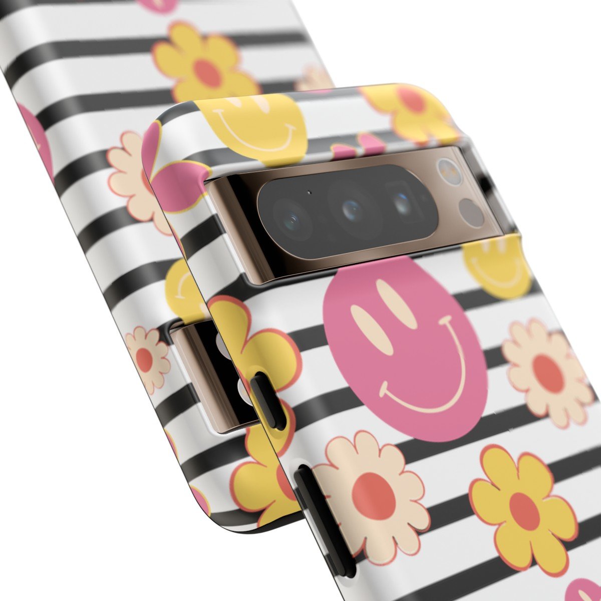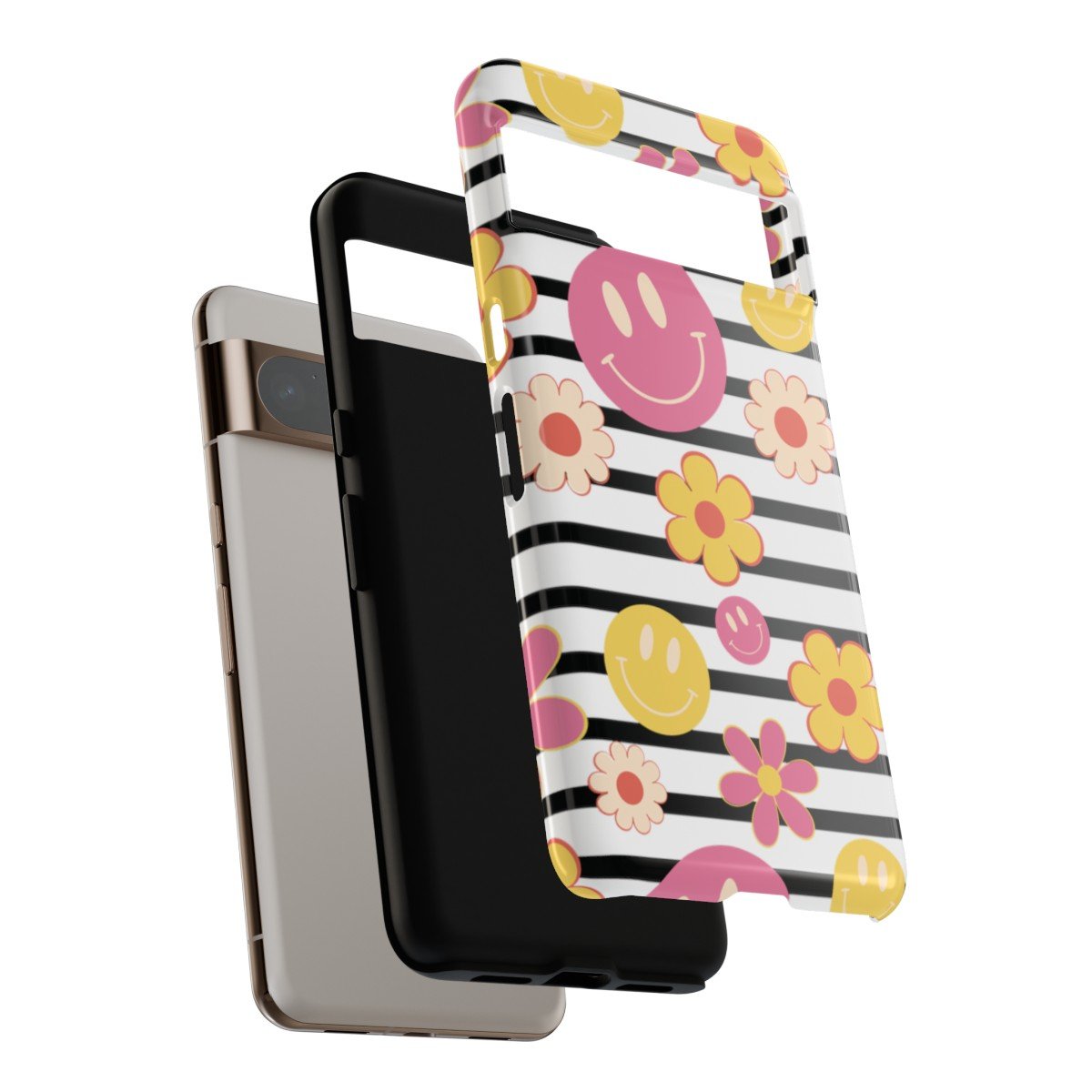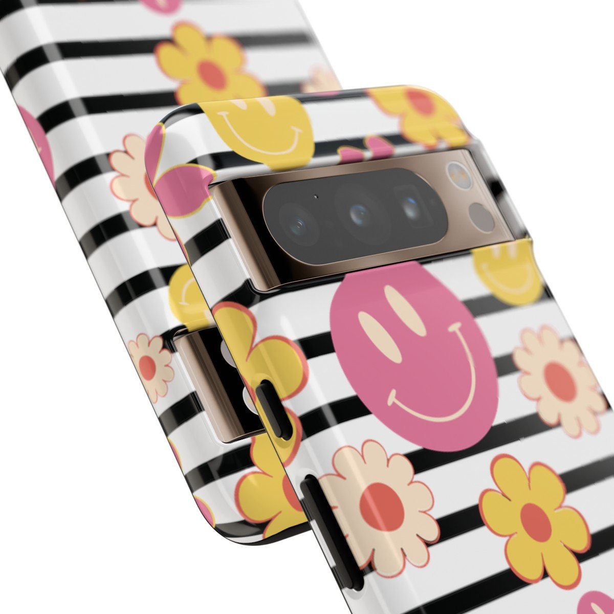 Black and White Stripes with Yellow and Pink Smileys and Retro Flowers  – Google Pixel 5 6 7 8 – Cell Phone – Tough Cases.