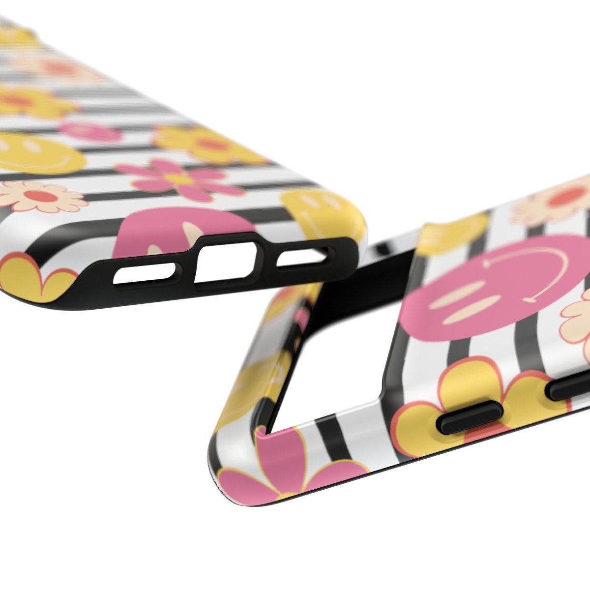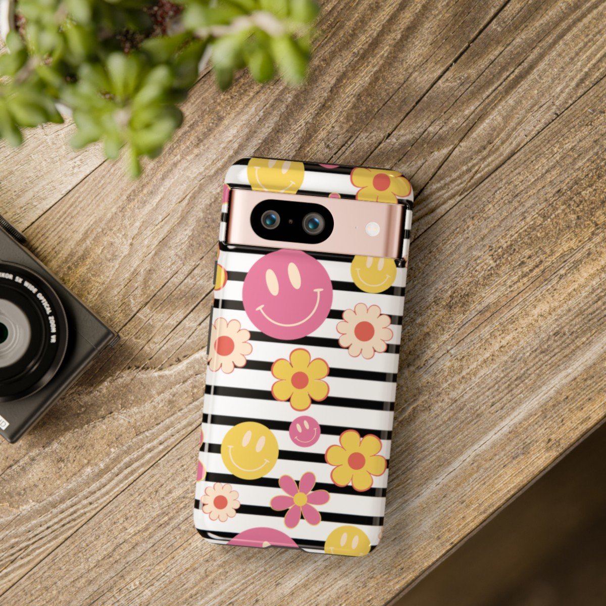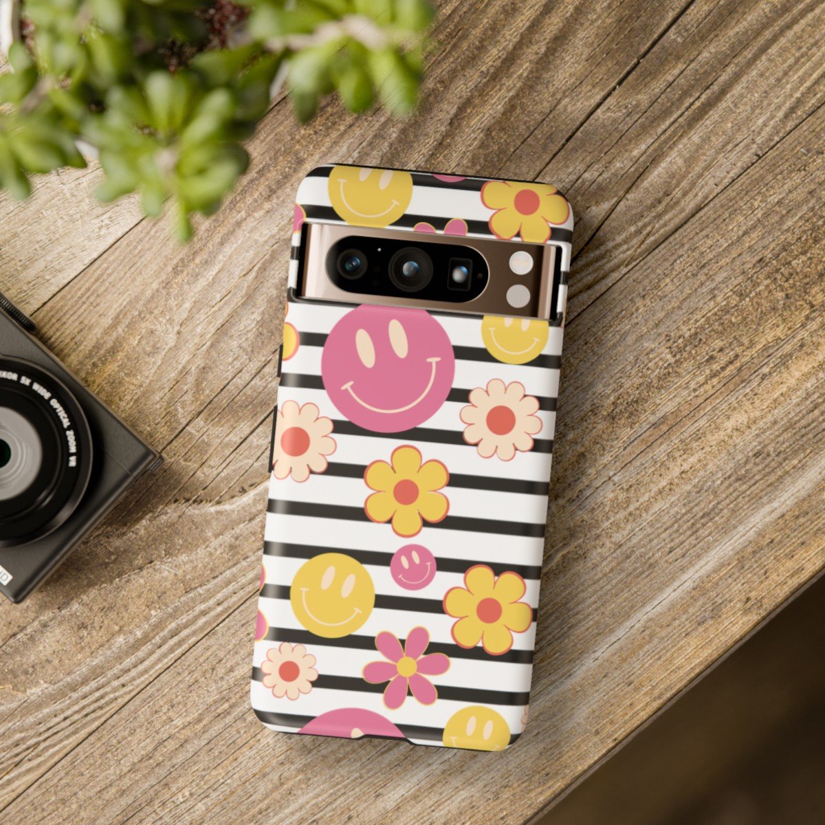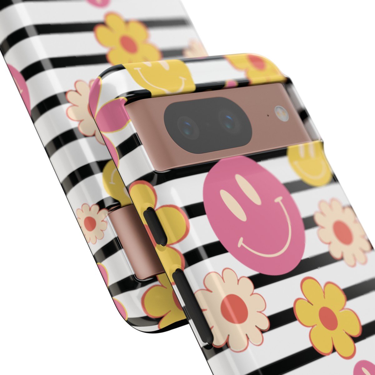 Black and White Stripes with Yellow and Pink Smileys and Retro Flowers  – Google Pixel 5 6 7 8 – Cell Phone – Tough Cases.