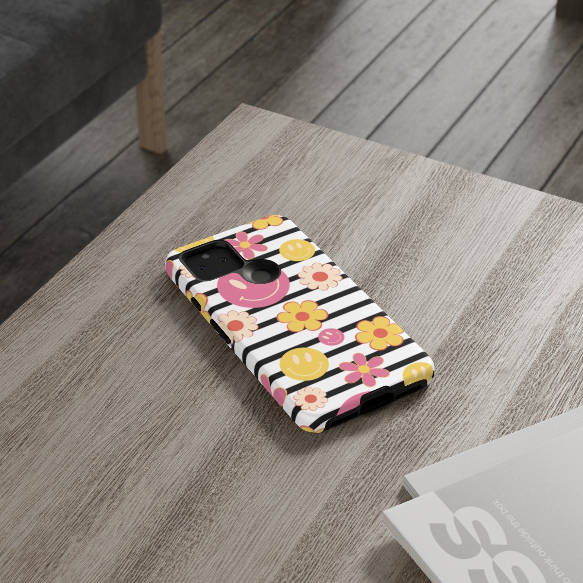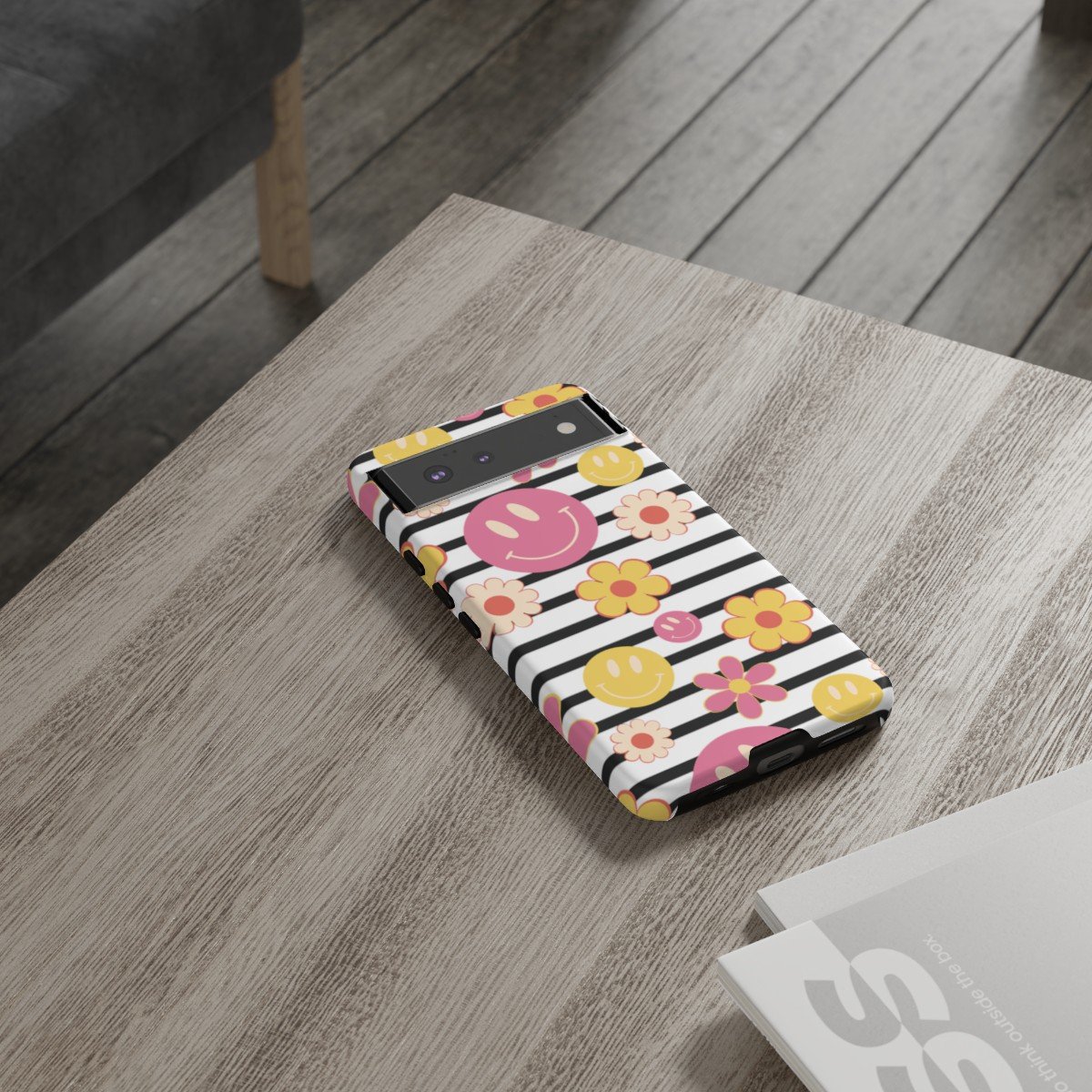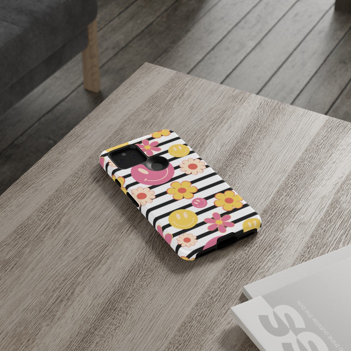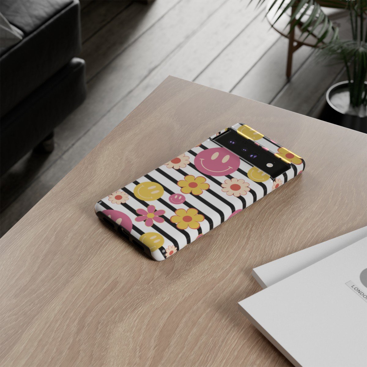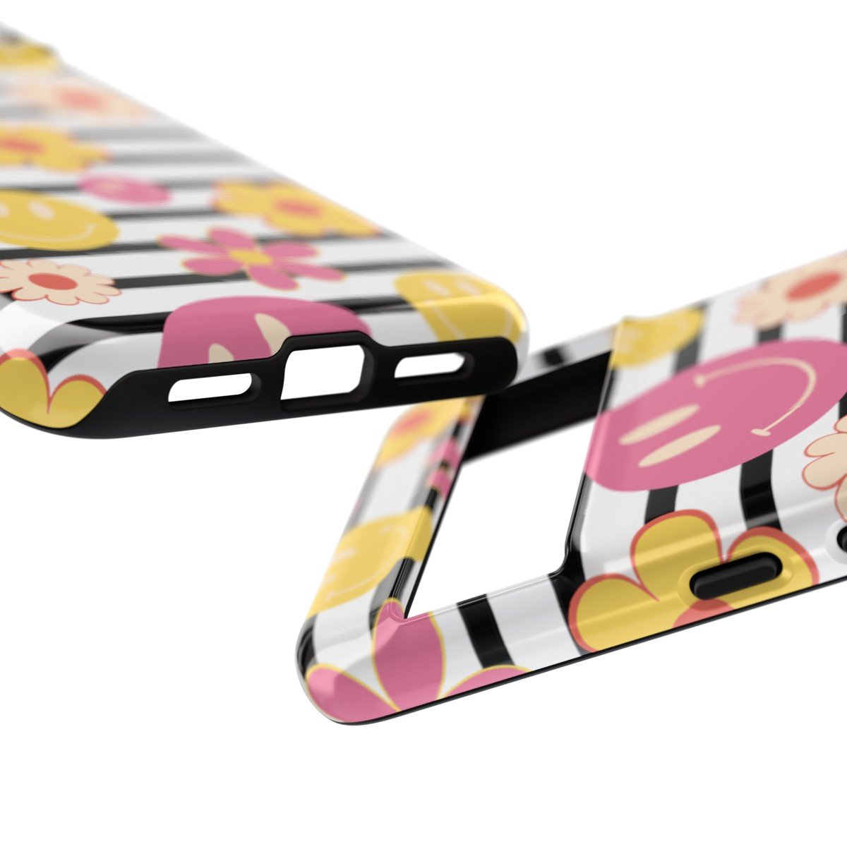 Black and White Stripes with Yellow and Pink Smileys and Retro Flowers  – Google Pixel 5 6 7 8 – Cell Phone – Tough Cases.