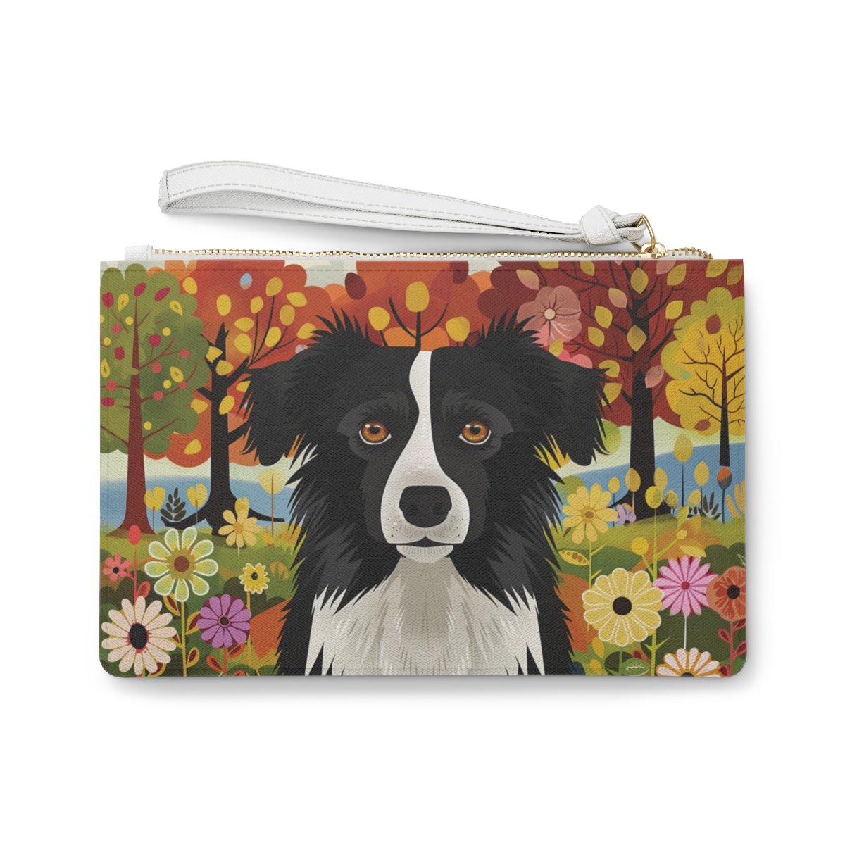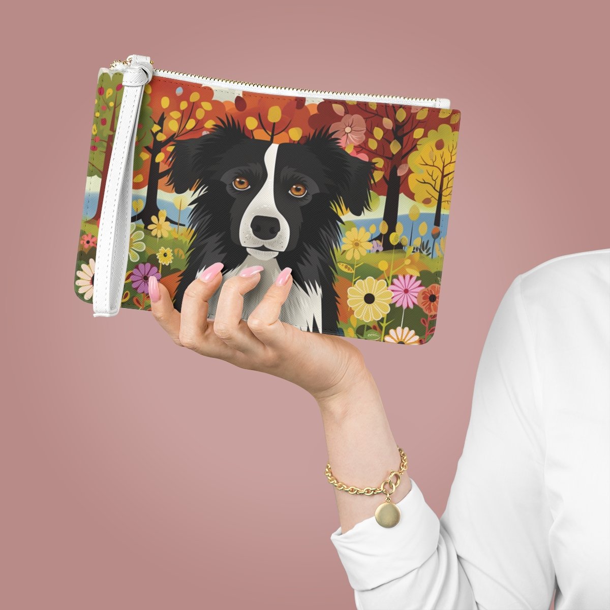 DESIGN: A black and white Border Collie with a background of retro color simple flowers and trees. Colors are black, white, orange, green, blue, pink, yellow, and more. We hope you love it! Super cute little clutch bag.