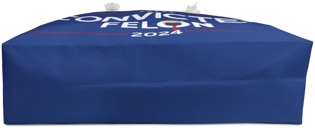 DESIGN: The text “CONVICTED FELON” in white. The O in FELON has Donald Trump’s iconic hairstyle and red tie to add a unique touch. 2024 and five white stars are also on the bag. The bag color is a rich royal blue with white handles. Colors are red, white, blue, and yellow.