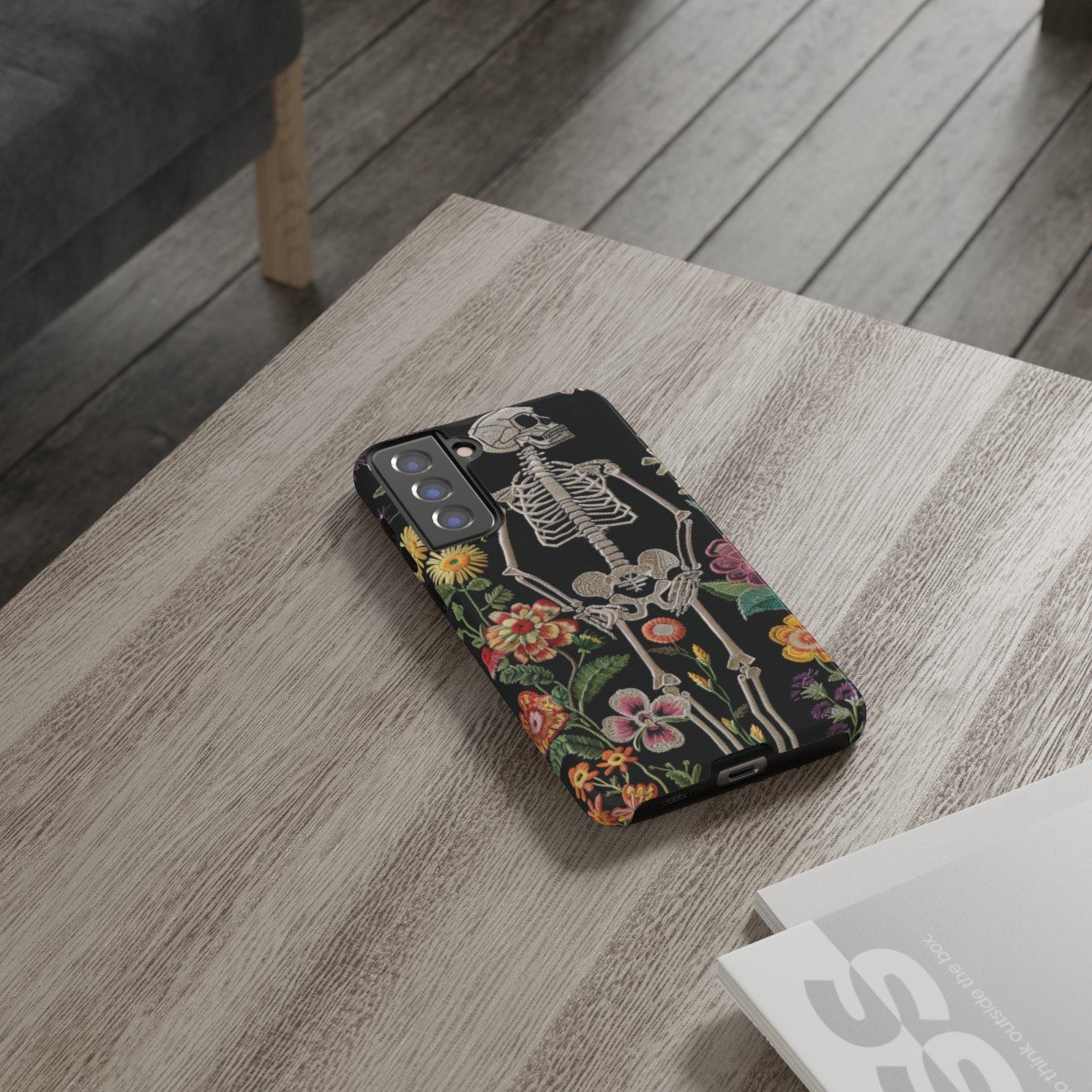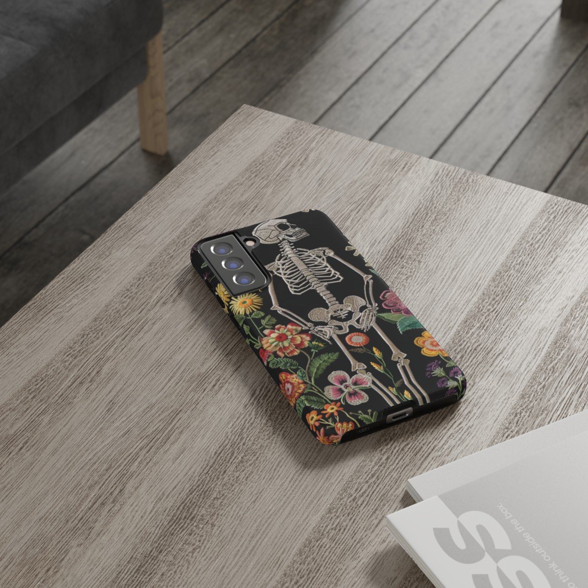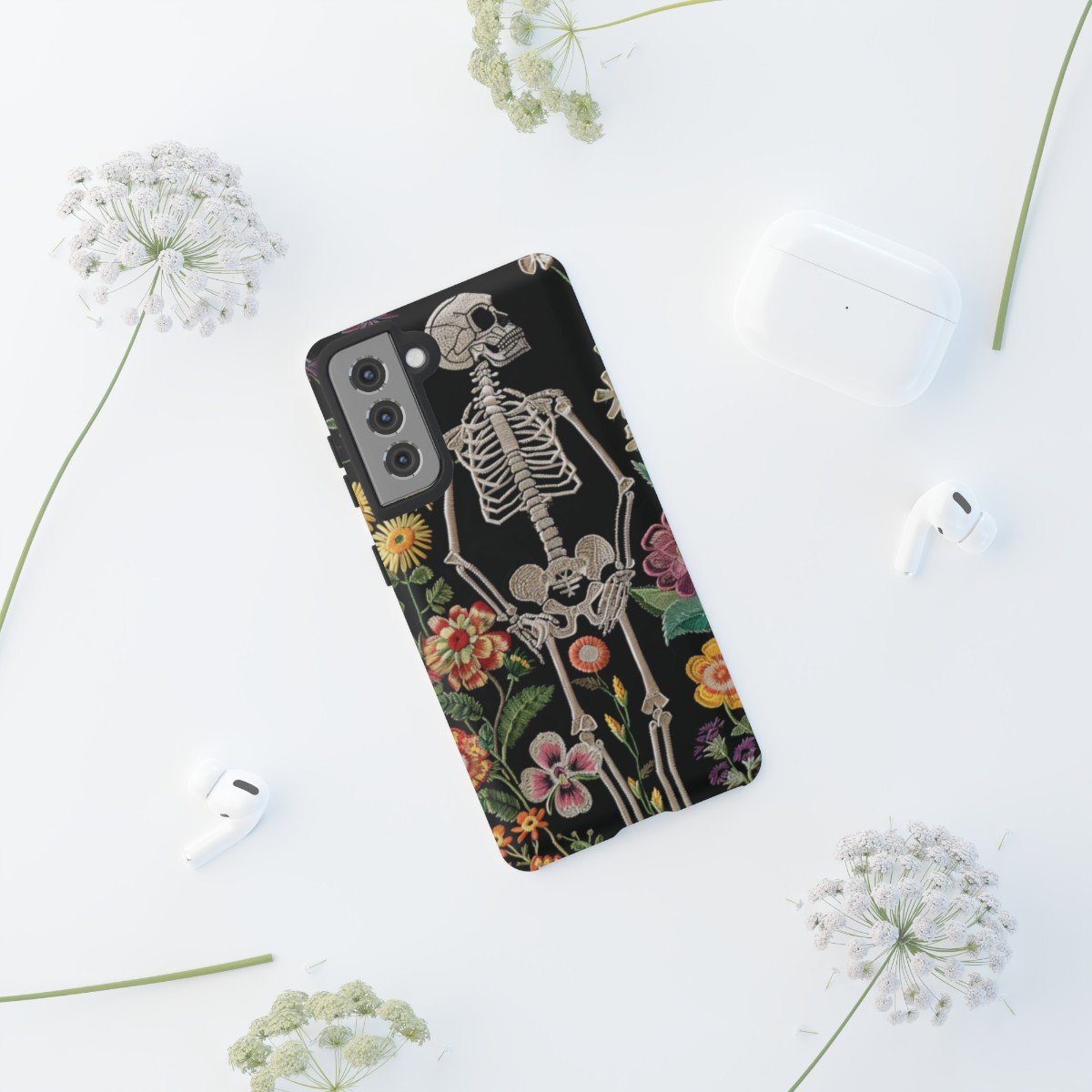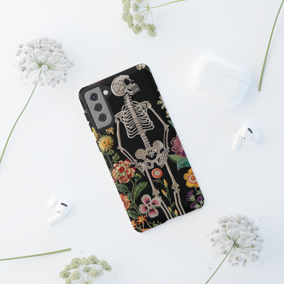 Embroidered Look Skeleton in the Garden – Multi-Colored on Black – Samsung Galaxy S10 S20 S21 – Cell Phone – Tough Cases.