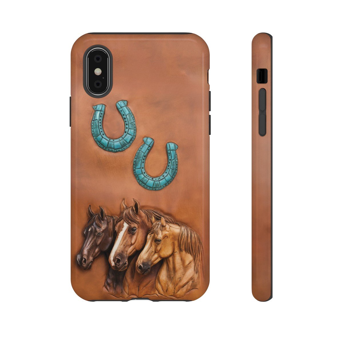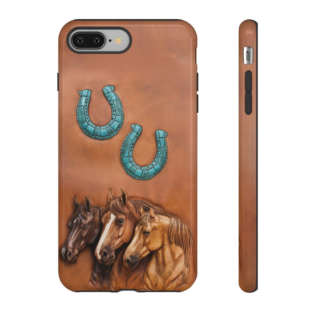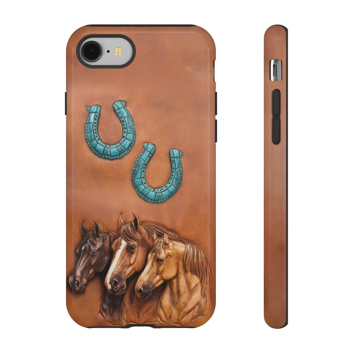 DESIGN: The look of leather PRINTED on this beautiful phone case. There are three horses in various shades of brown and two turquoise horseshoes. Colors are shades of brown and turquoise. The look of leather but there is no leather and no texture, it is smooth and printed on. We hope you love it! Super fresh design and also very cheerful to look at.