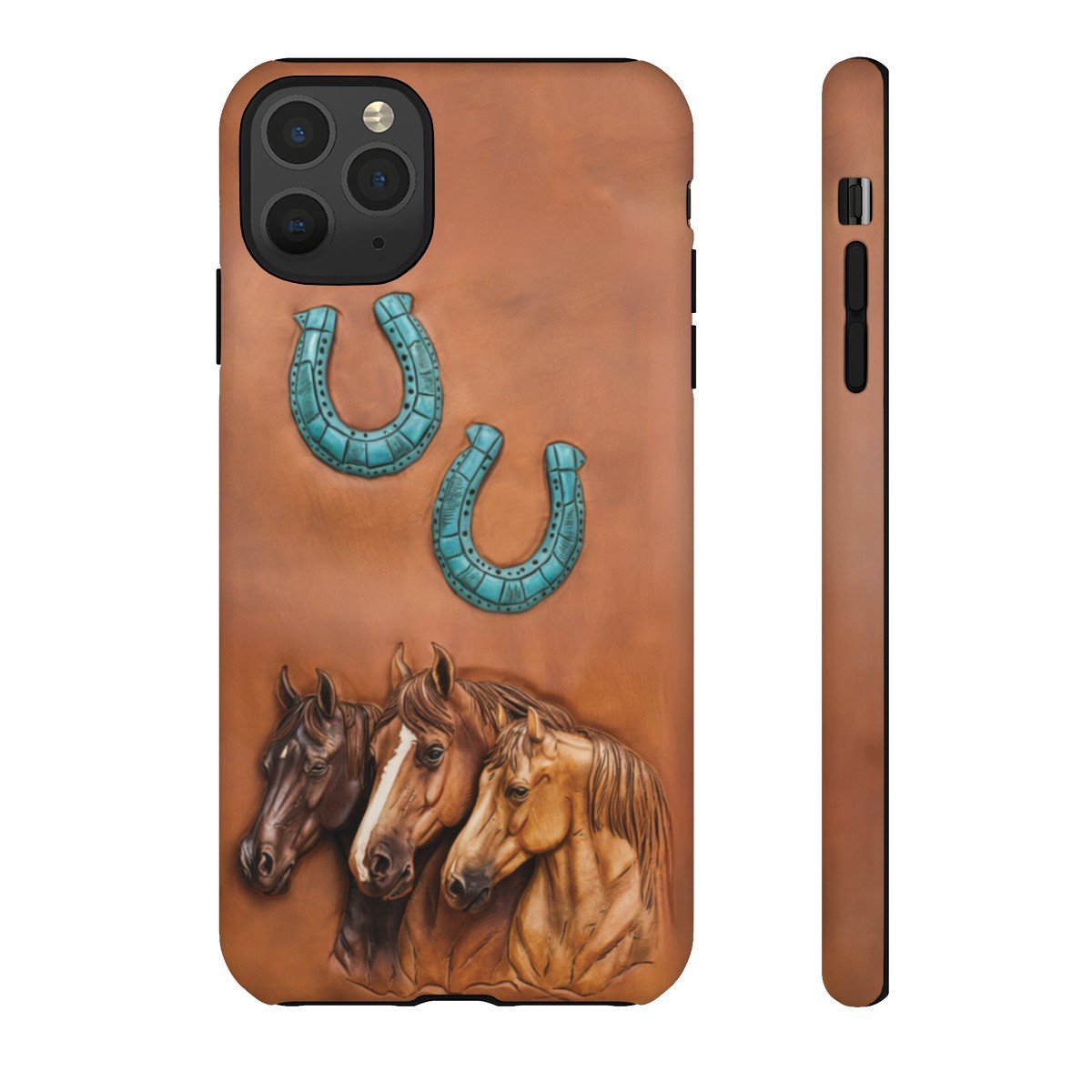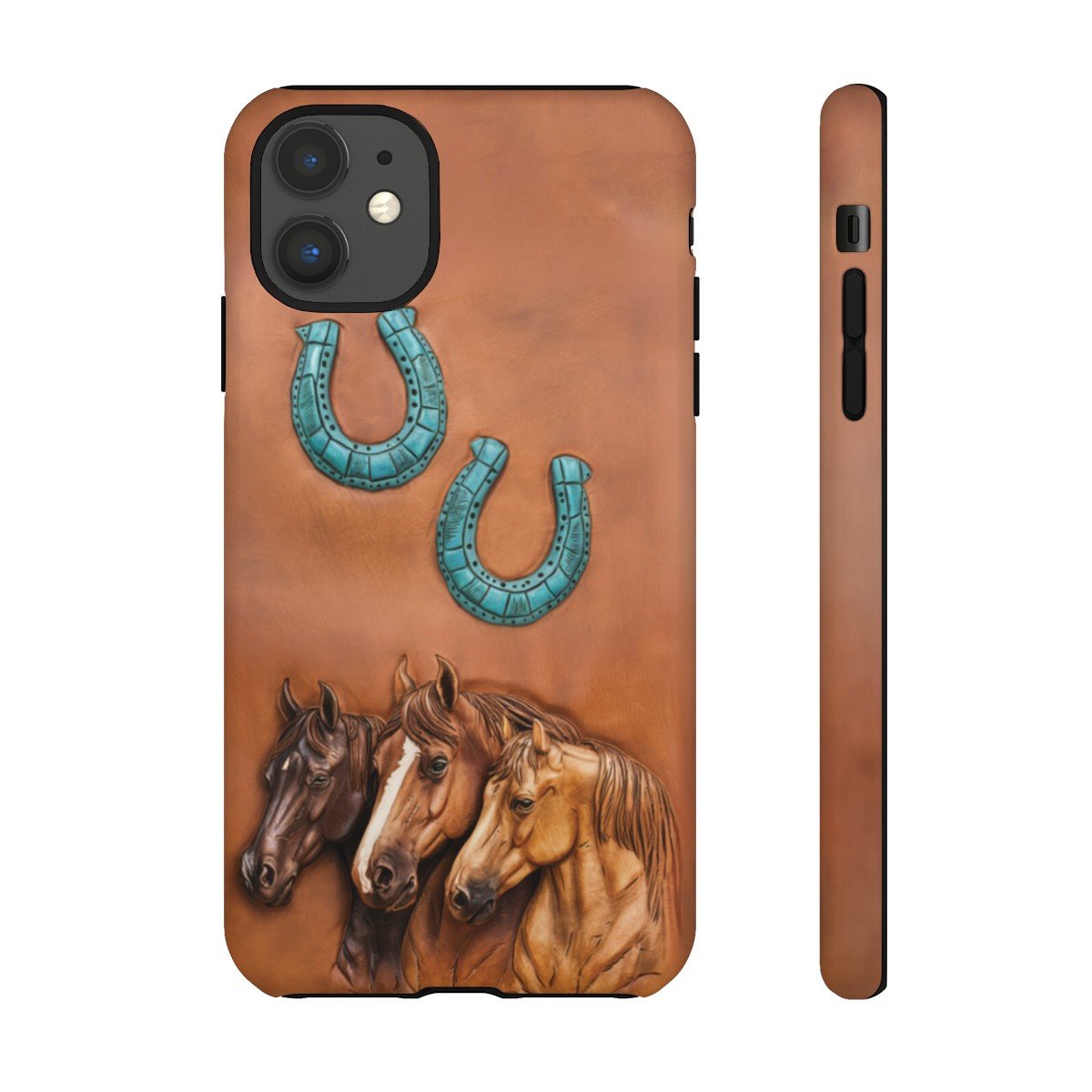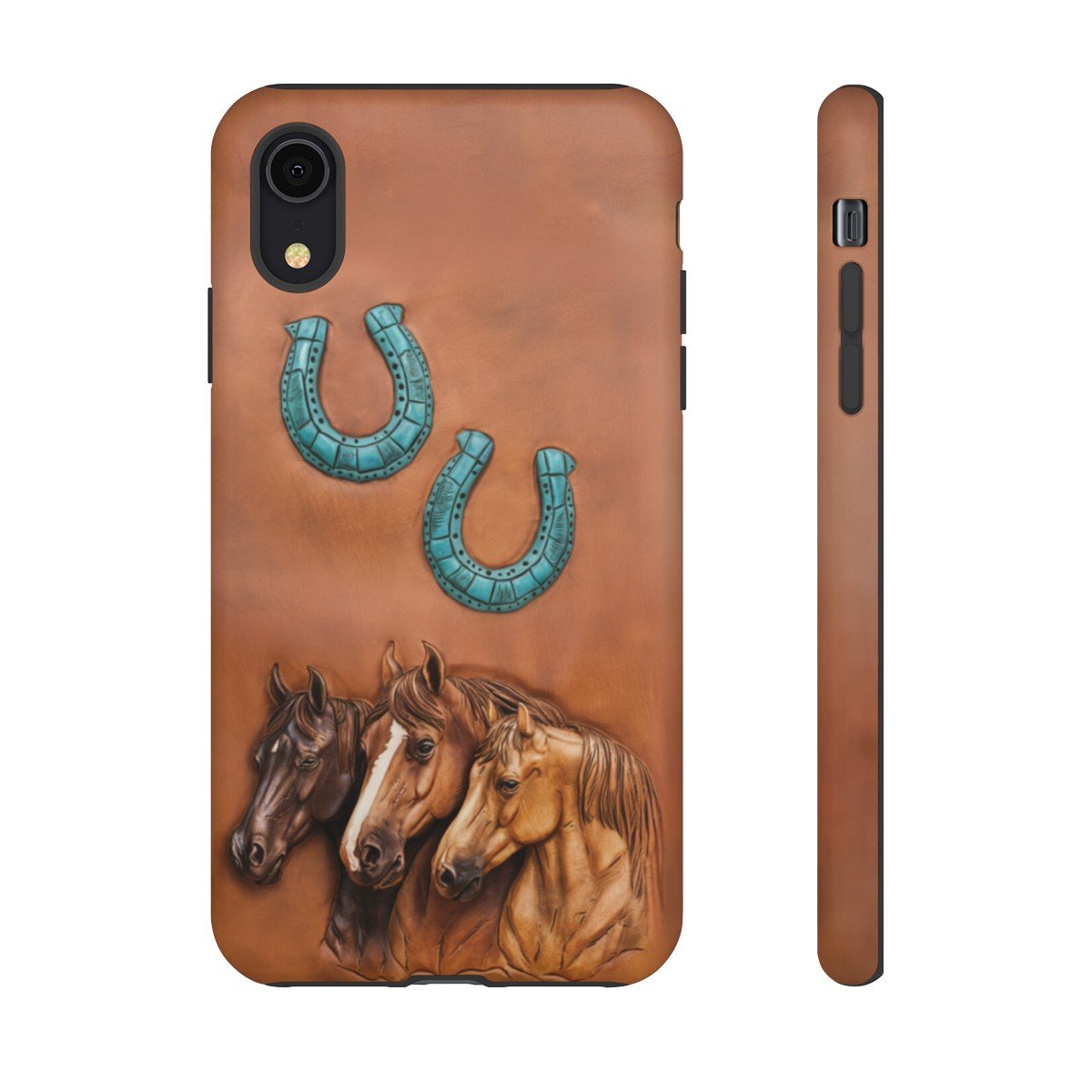 DESIGN: The look of leather PRINTED on this beautiful phone case. There are three horses in various shades of brown and two turquoise horseshoes. Colors are shades of brown and turquoise. The look of leather but there is no leather and no texture, it is smooth and printed on. We hope you love it! Super fresh design and also very cheerful to look at.