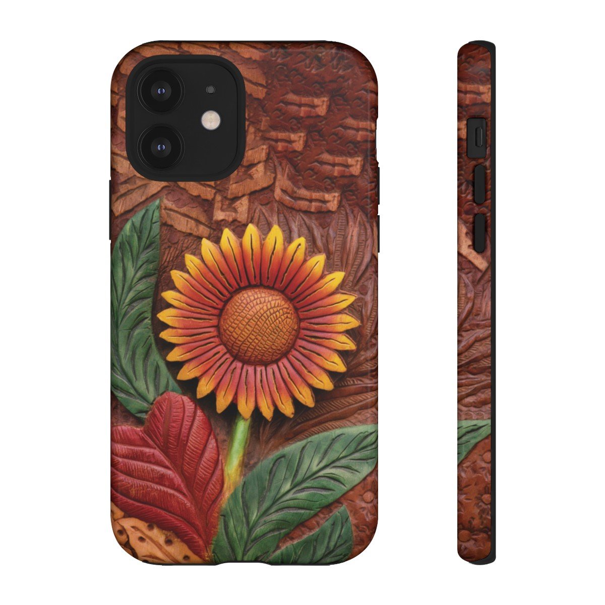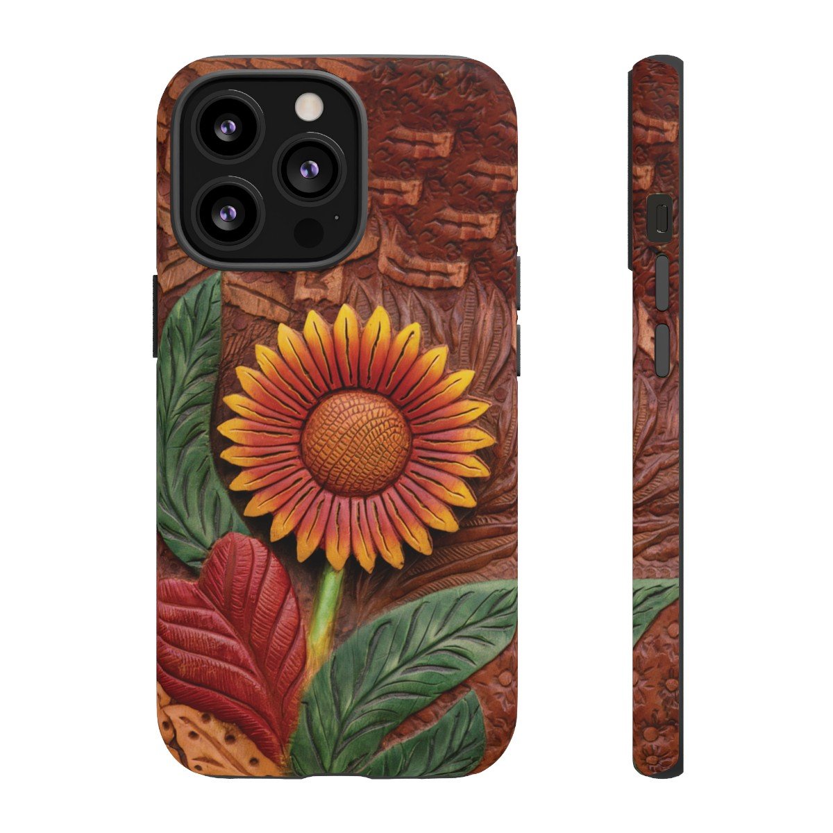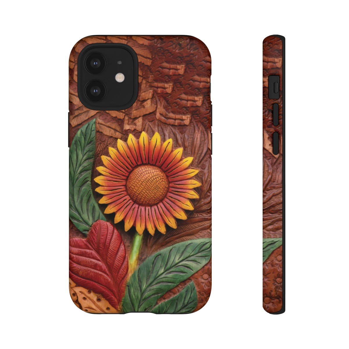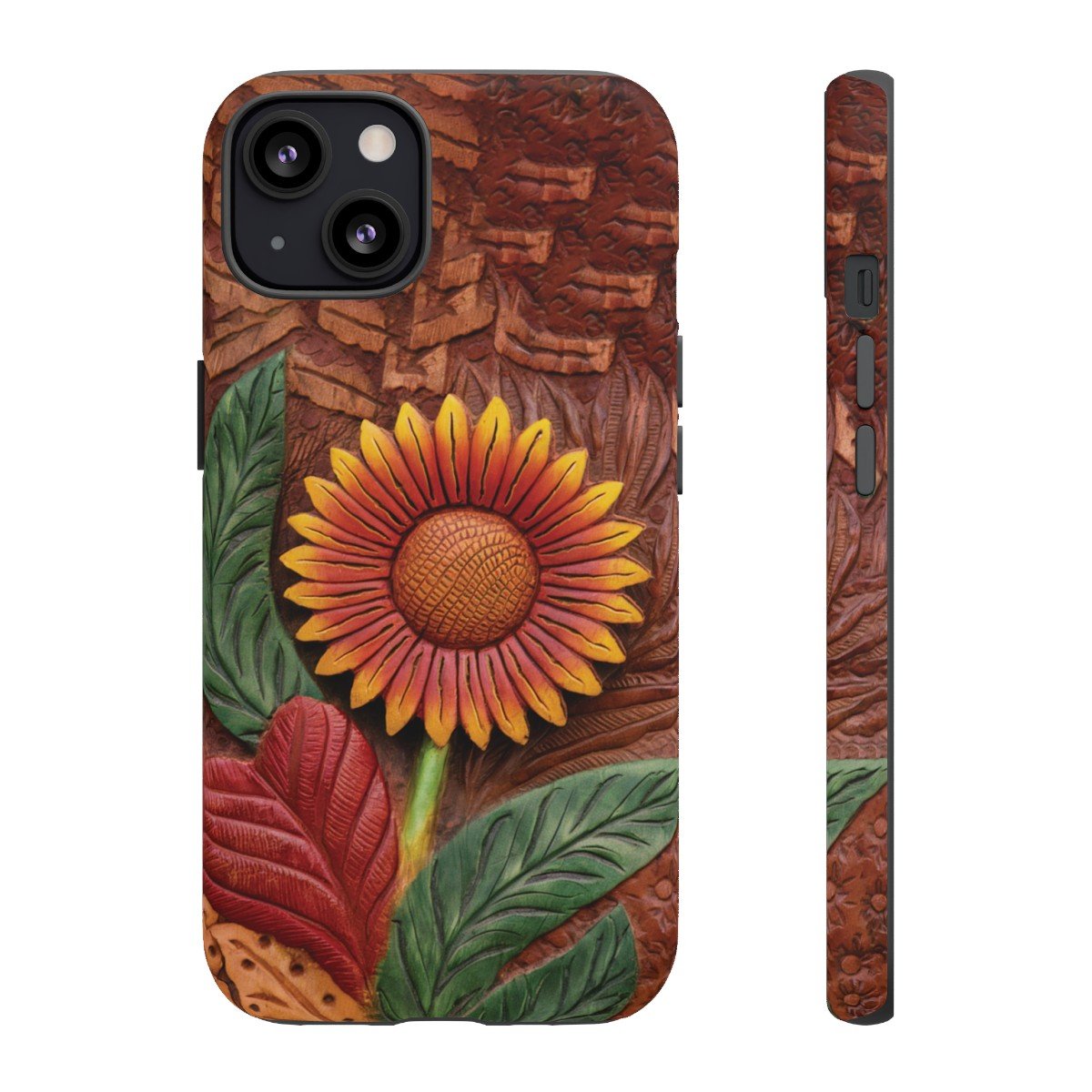 DESIGN: A beautiful hand tooled leather look printed on colorful Sunflower. Colors are yellow, orange, brown, green, and red. These have the look of texture and 3D but this is a print only, the phone case will be smooth.  We hope you love it! Super fresh design and also very cheerful to look at.