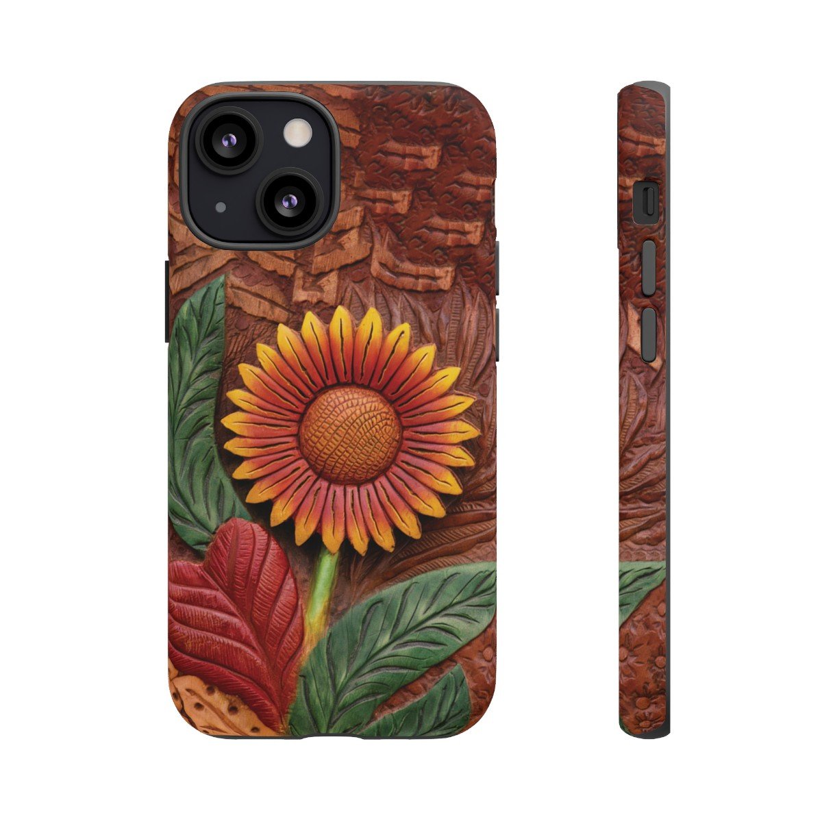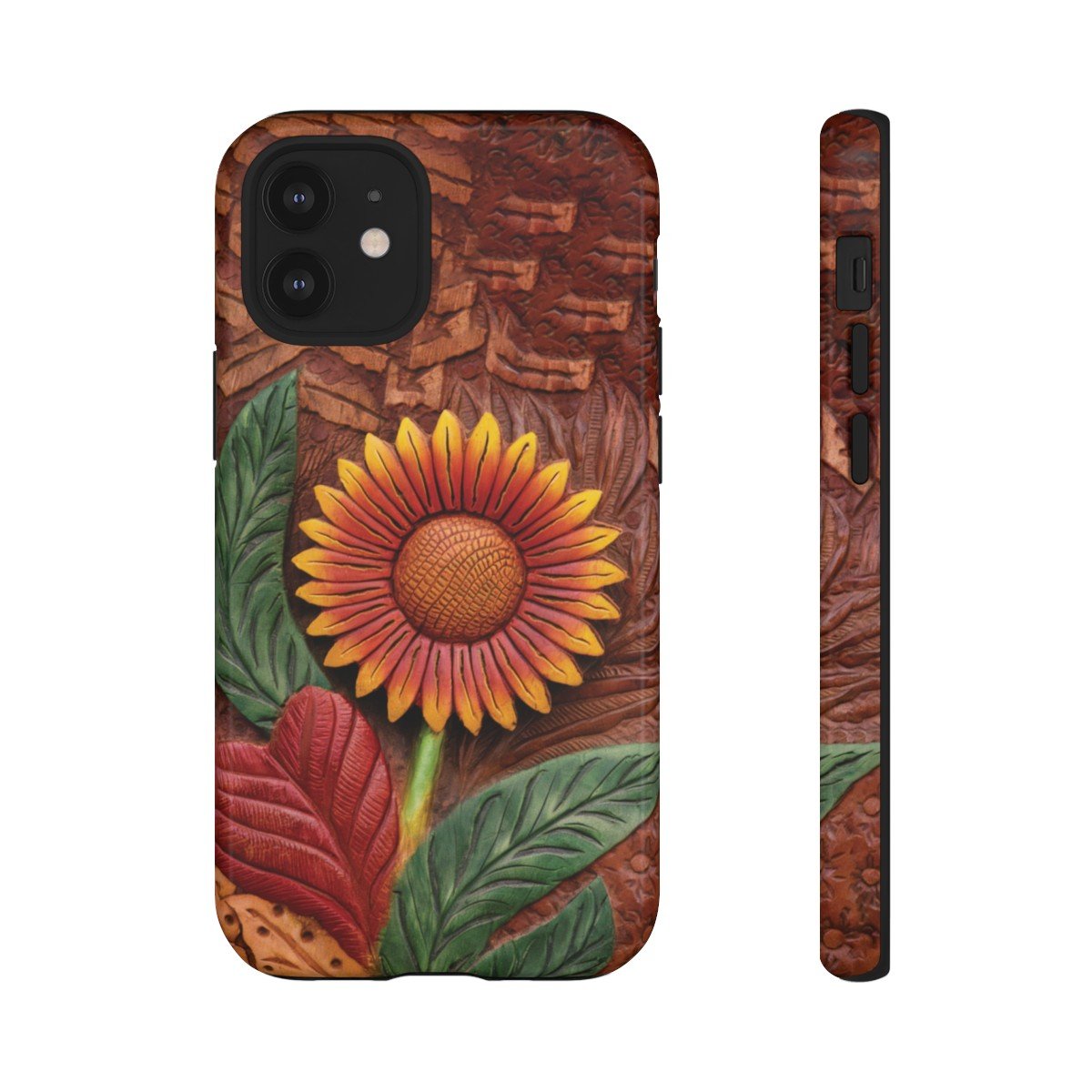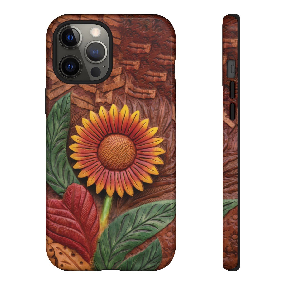 DESIGN: A beautiful hand tooled leather look printed on colorful Sunflower. Colors are yellow, orange, brown, green, and red. These have the look of texture and 3D but this is a print only, the phone case will be smooth.  We hope you love it! Super fresh design and also very cheerful to look at.