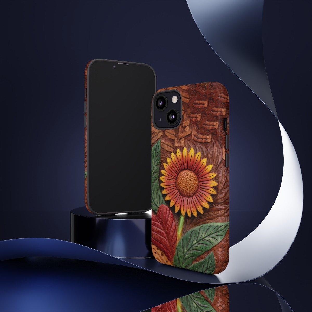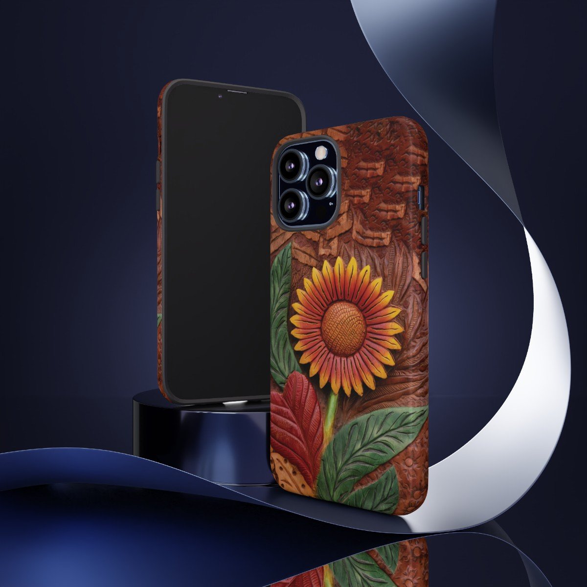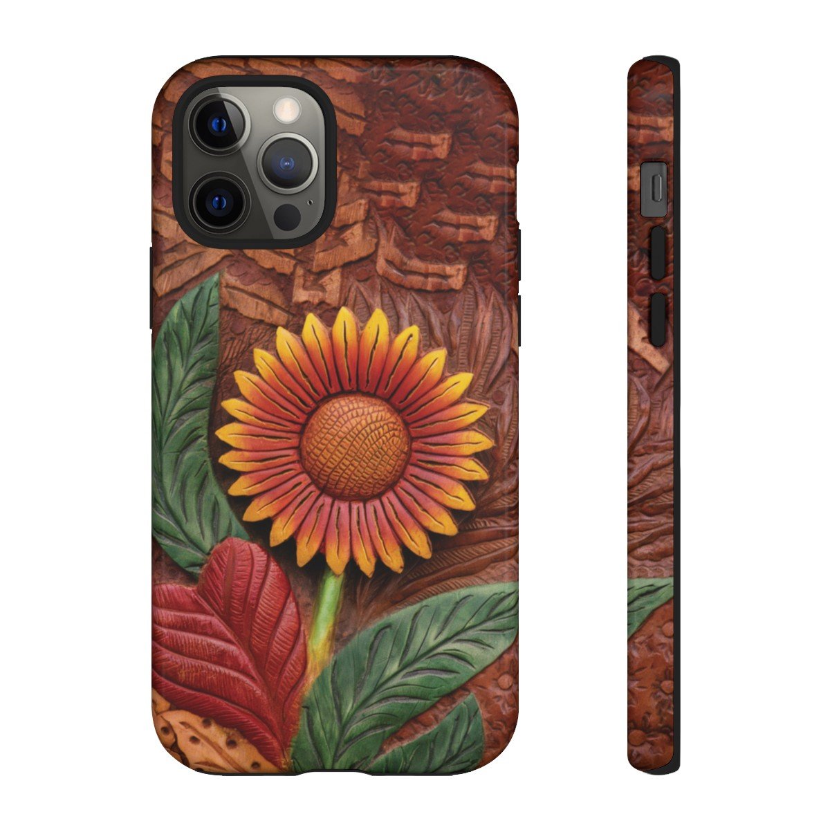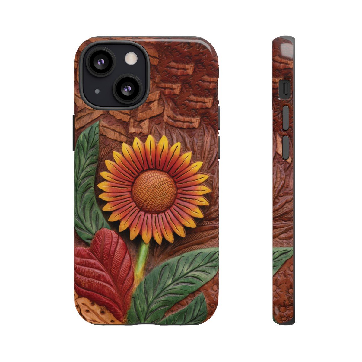 DESIGN: A beautiful hand tooled leather look printed on colorful Sunflower. Colors are yellow, orange, brown, green, and red. These have the look of texture and 3D but this is a print only, the phone case will be smooth.  We hope you love it! Super fresh design and also very cheerful to look at.