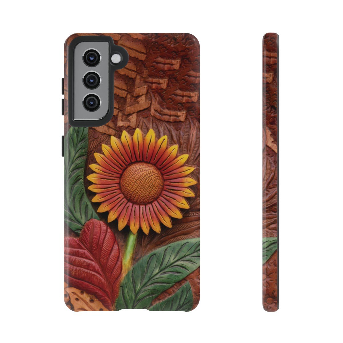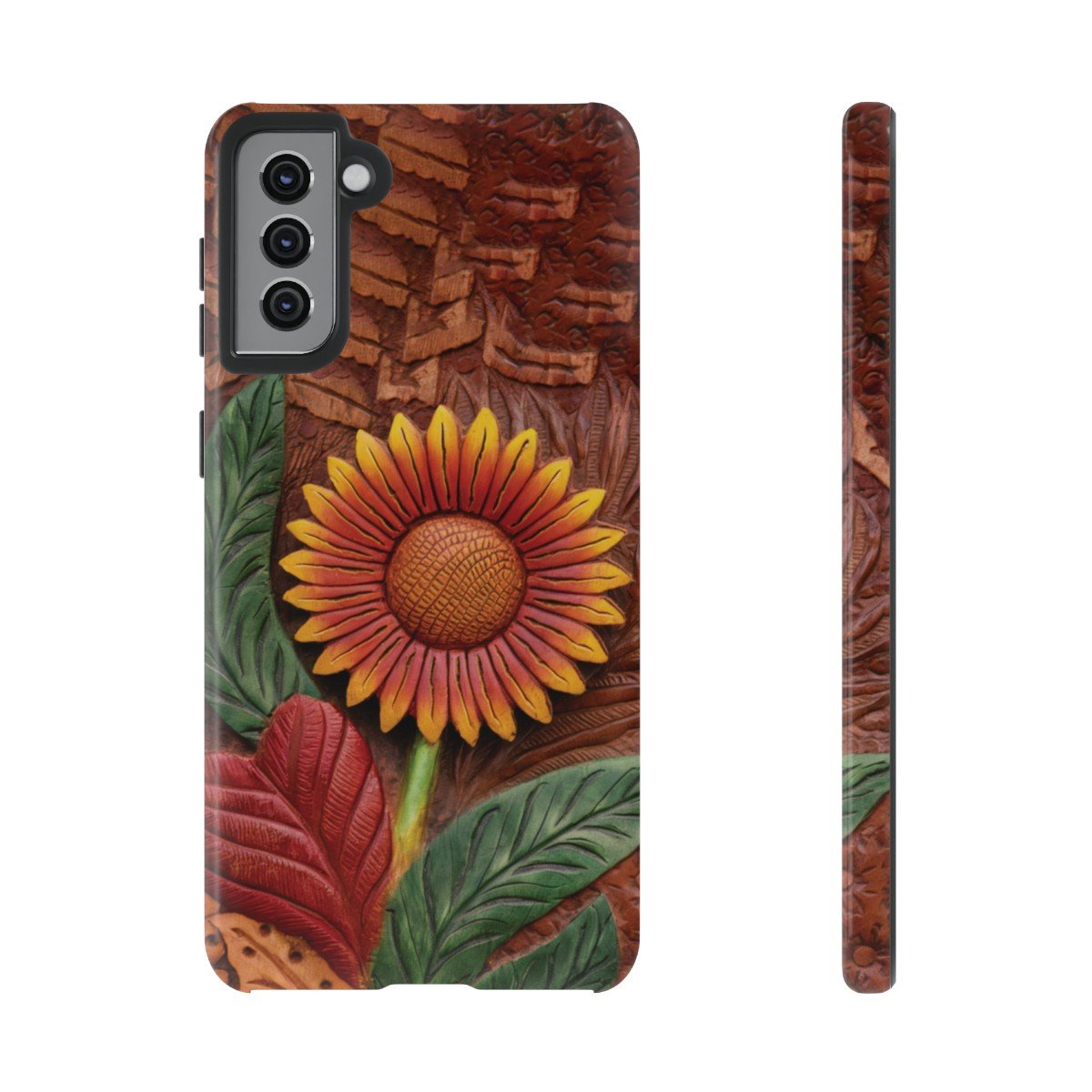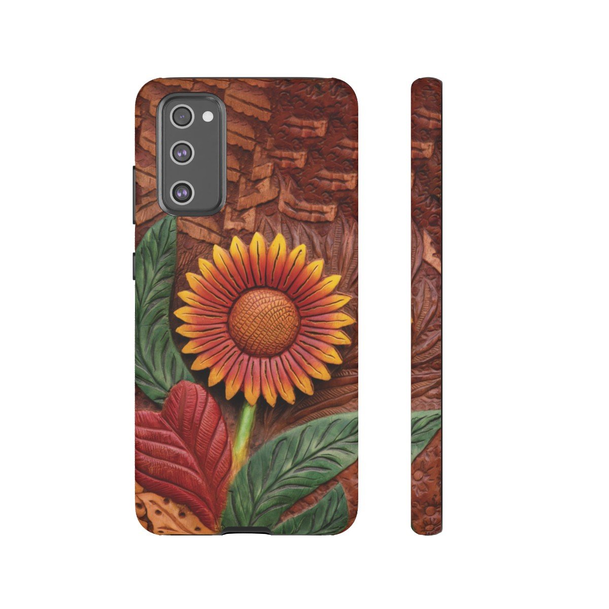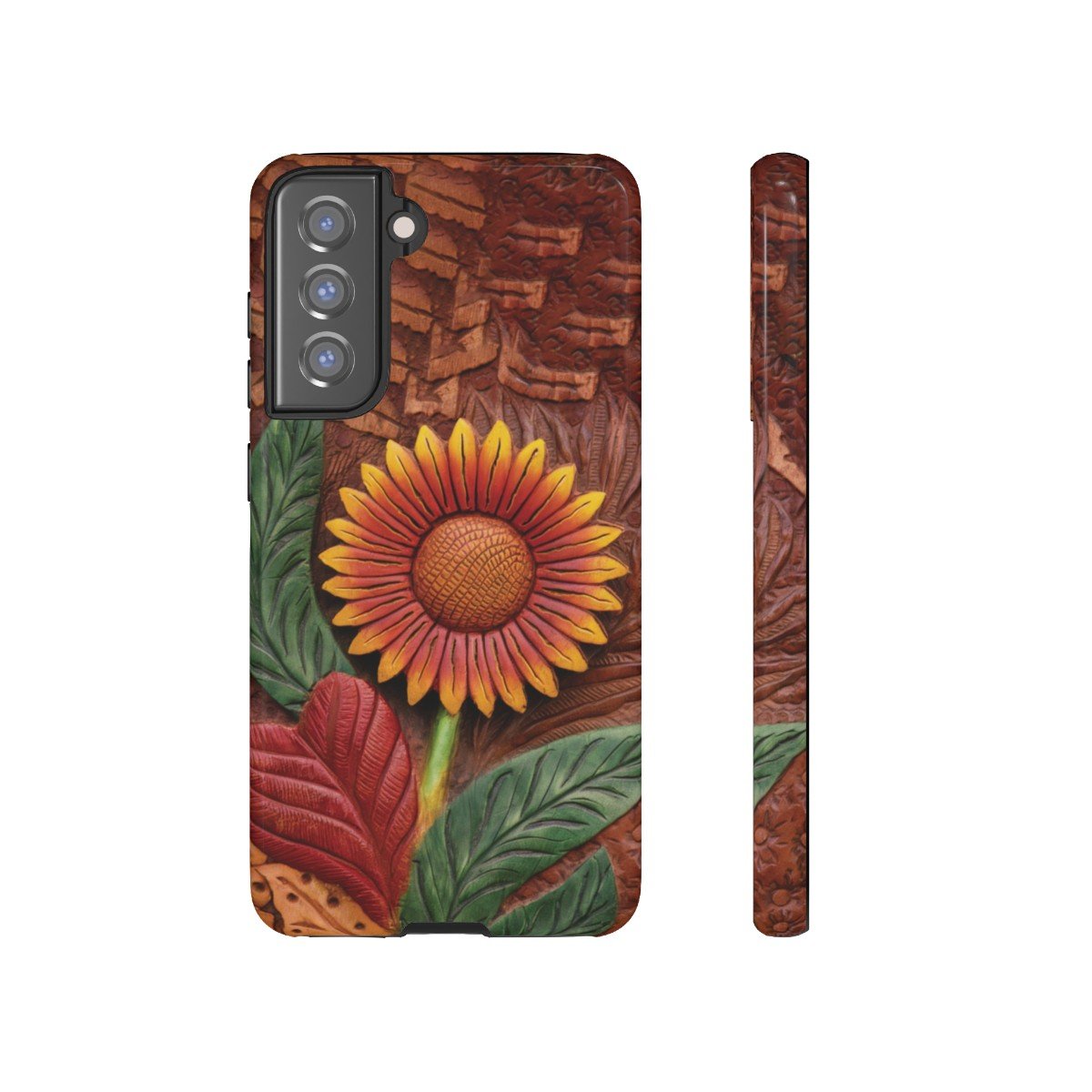 DESIGN: A beautiful hand tooled leather look on this print of a colorful Sunflower. Colors are yellow, orange, red, brown, and green. These have the look of texture and 3D but this is a print only, the phone case will be smooth.  We hope you love it! Super fresh design and also very cheerful to look at.