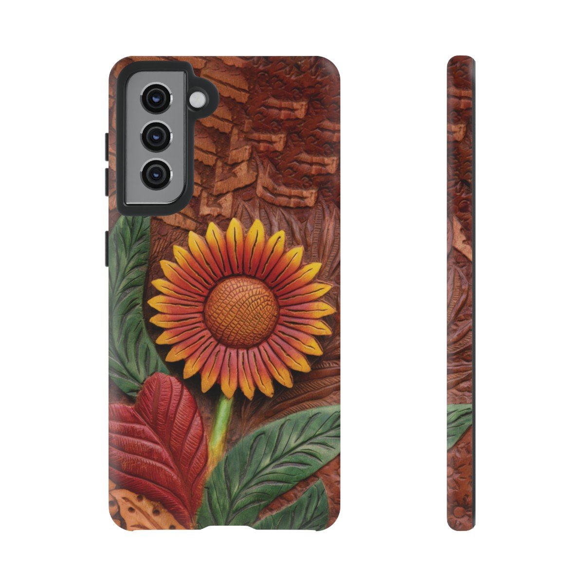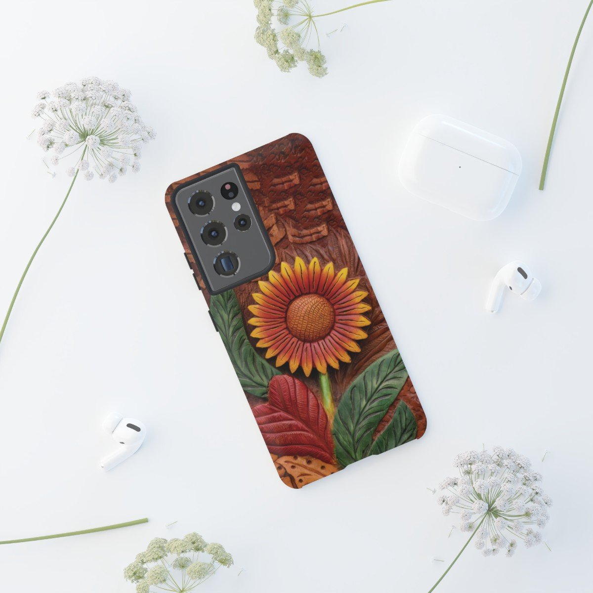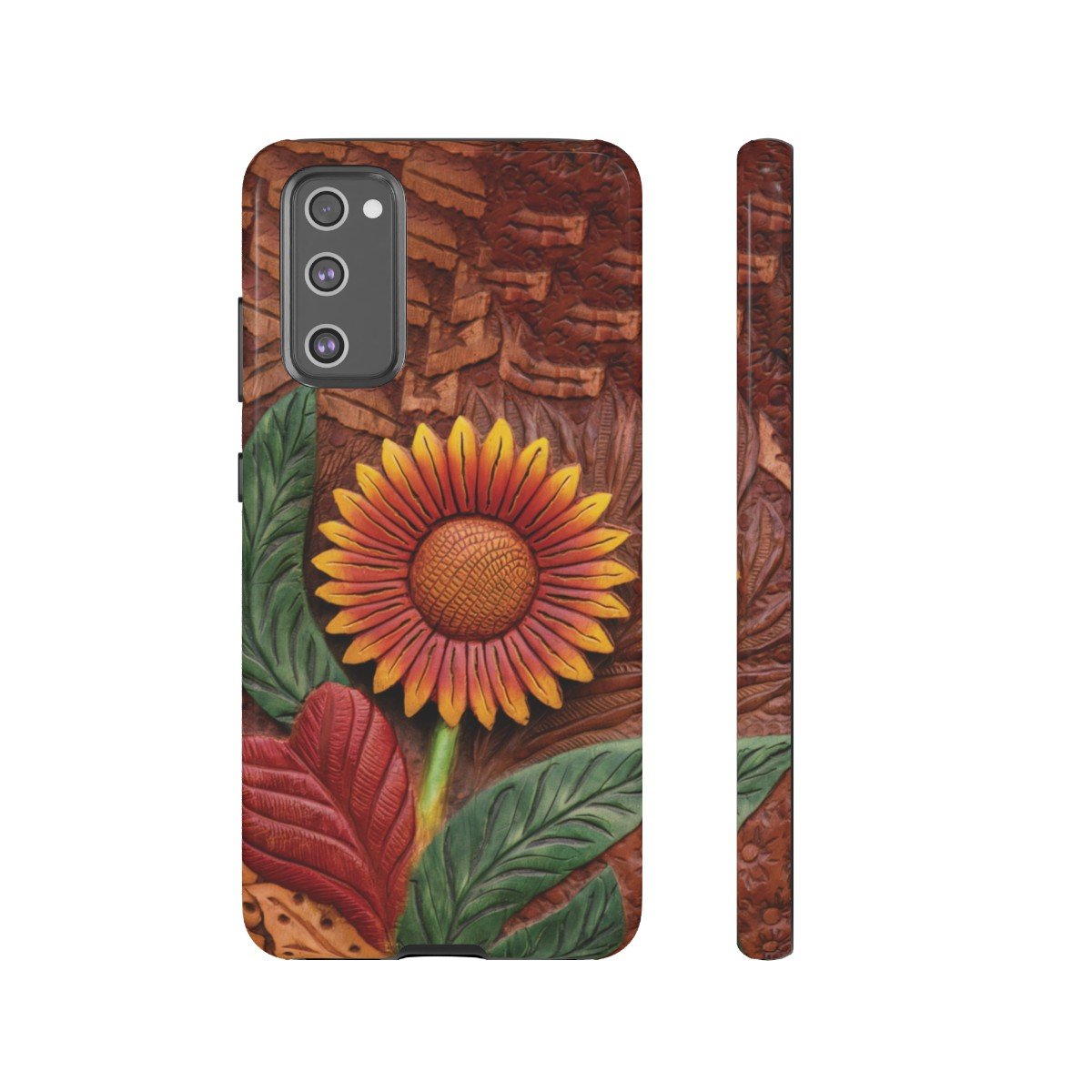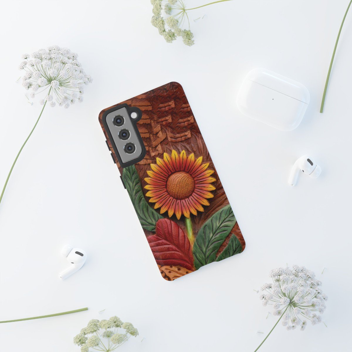 DESIGN: A beautiful hand tooled leather look on this print of a colorful Sunflower. Colors are yellow, orange, red, brown, and green. These have the look of texture and 3D but this is a print only, the phone case will be smooth.  We hope you love it! Super fresh design and also very cheerful to look at.
