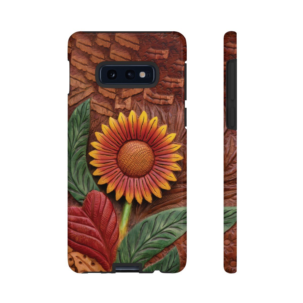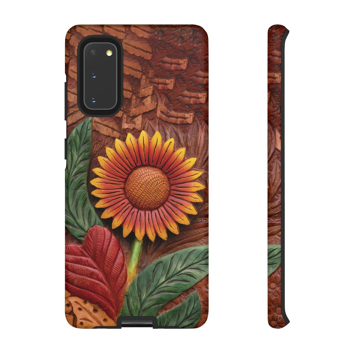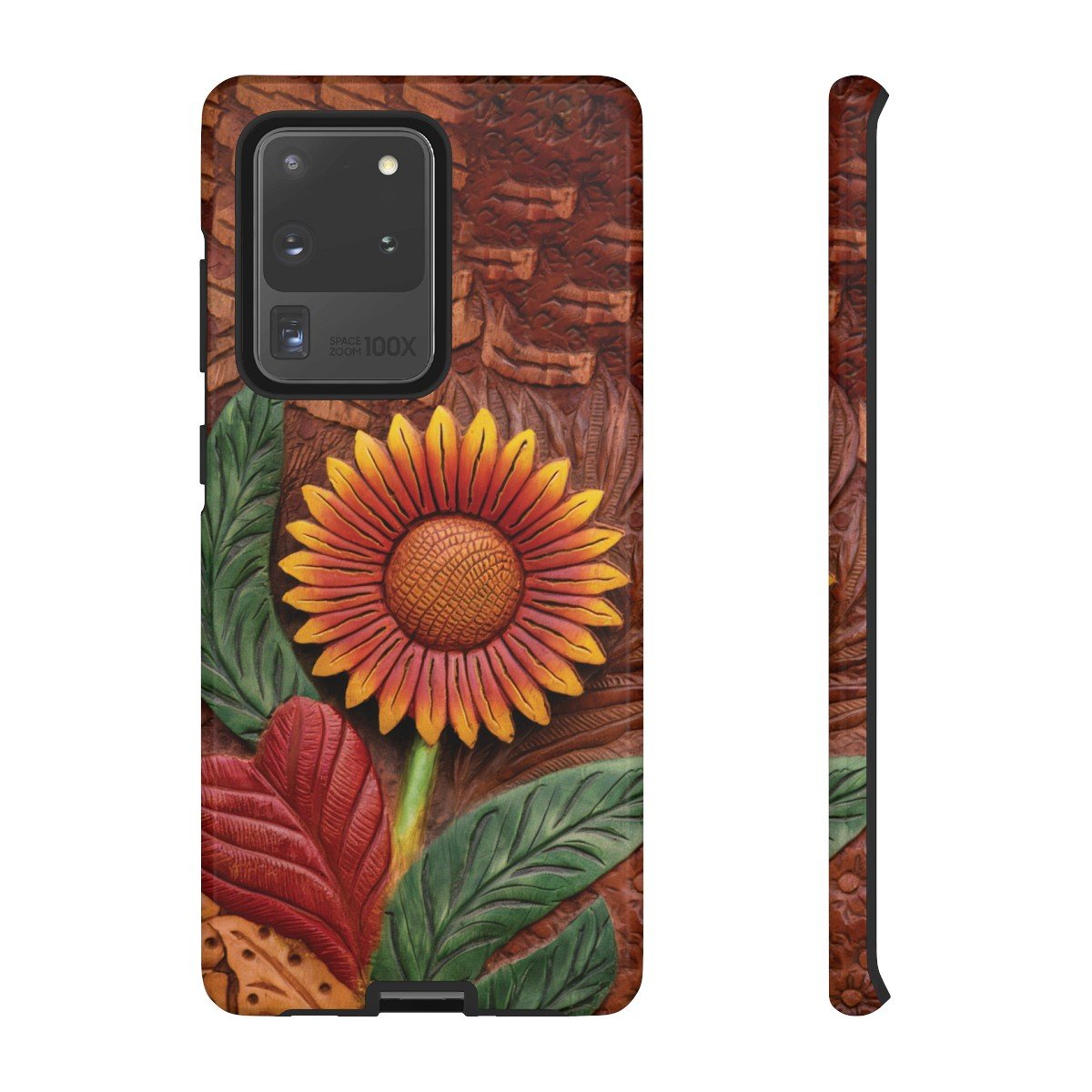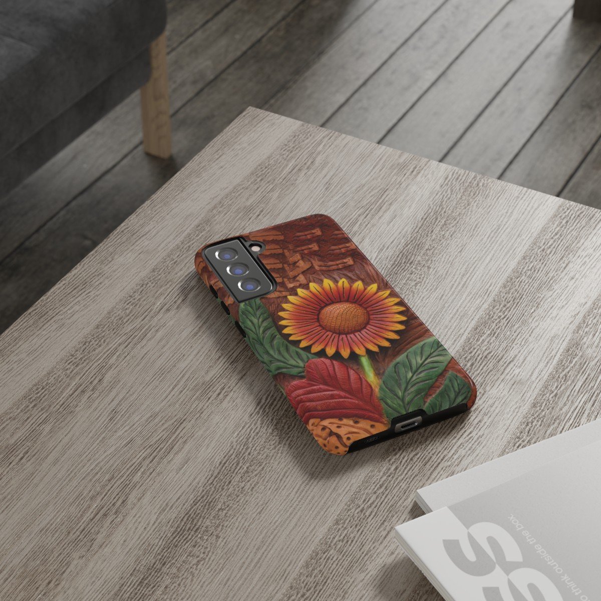 DESIGN: A beautiful hand tooled leather look on this print of a colorful Sunflower. Colors are yellow, orange, red, brown, and green. These have the look of texture and 3D but this is a print only, the phone case will be smooth.  We hope you love it! Super fresh design and also very cheerful to look at.