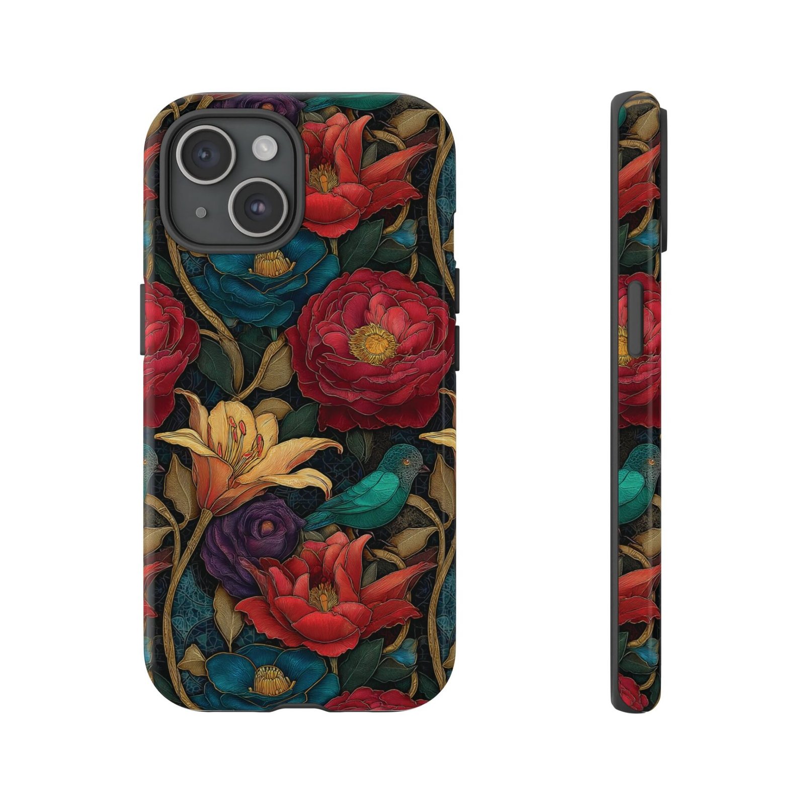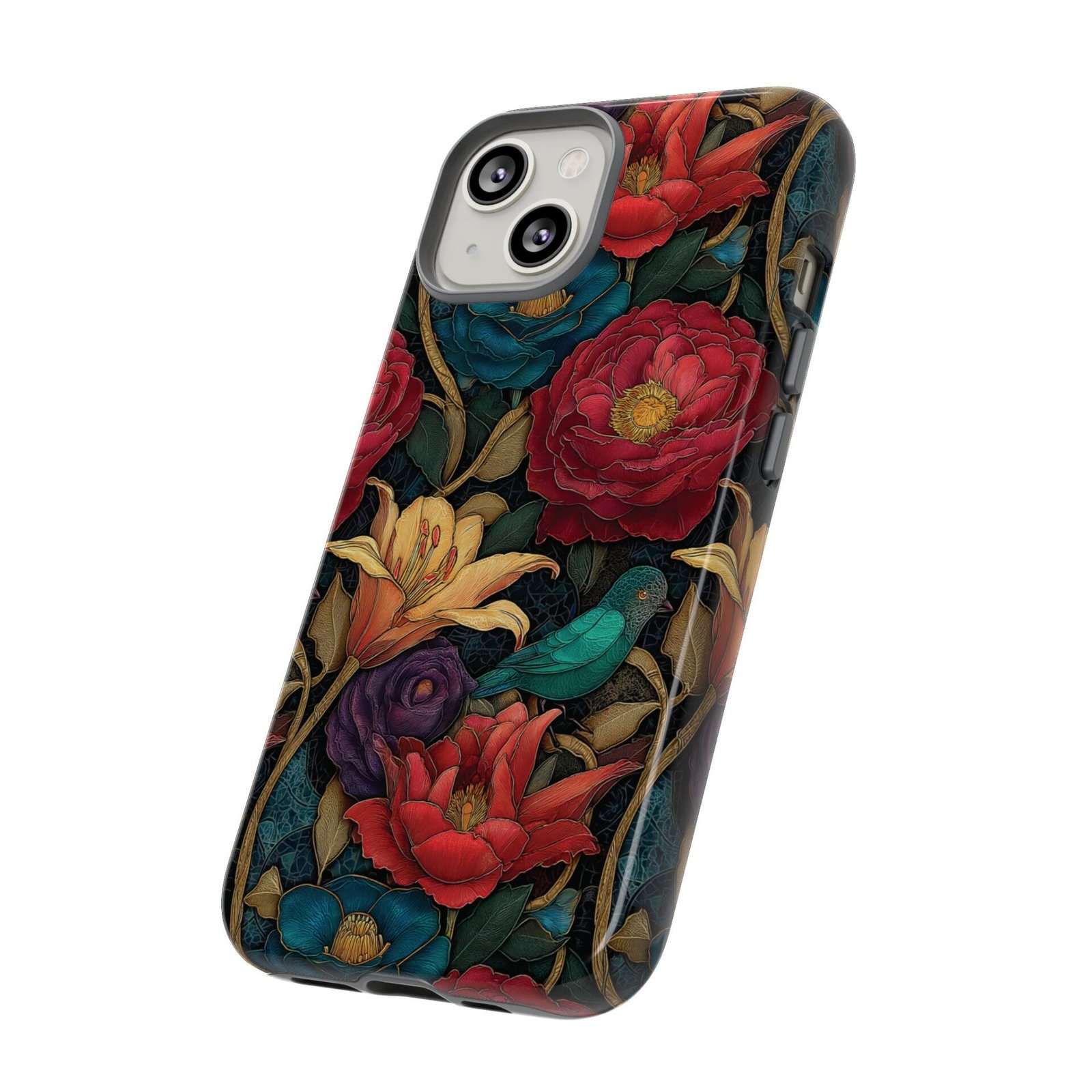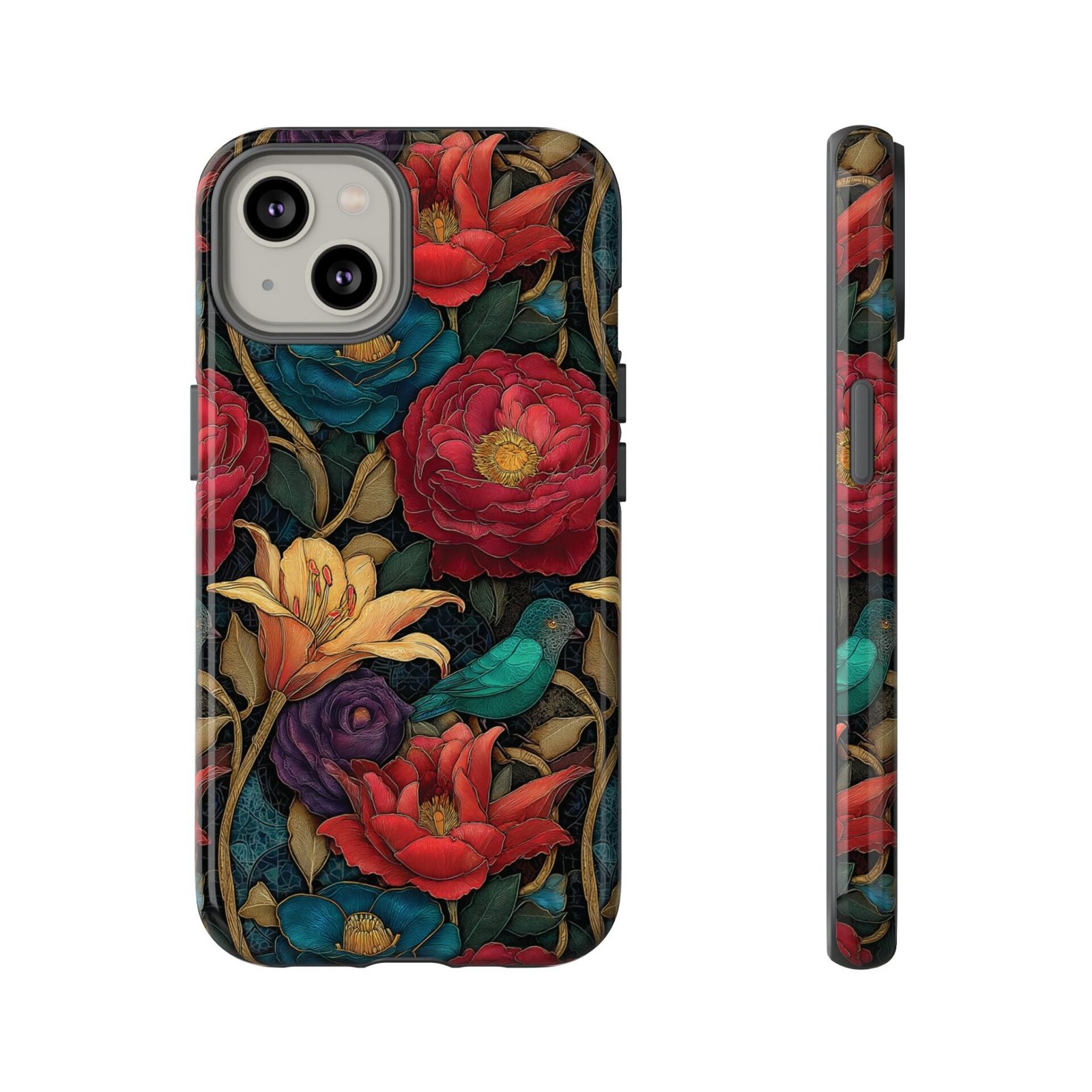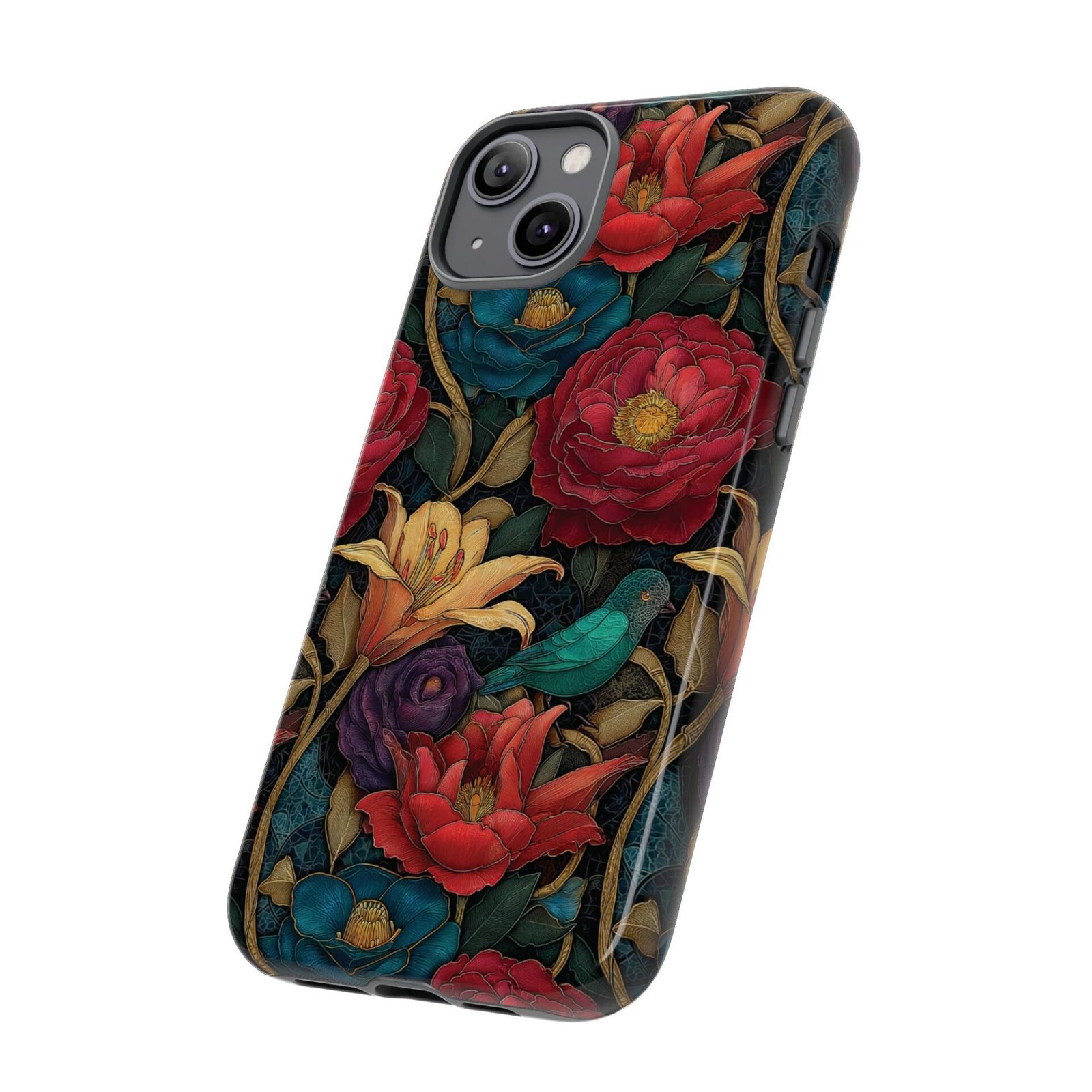 Phone Cases – Stained Glass – Floral with Bird – iPhone 14 15 – Cell Phone – Tough Cases.