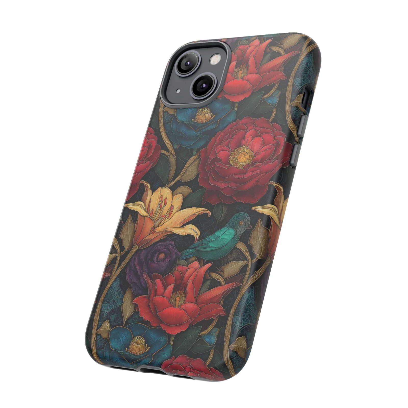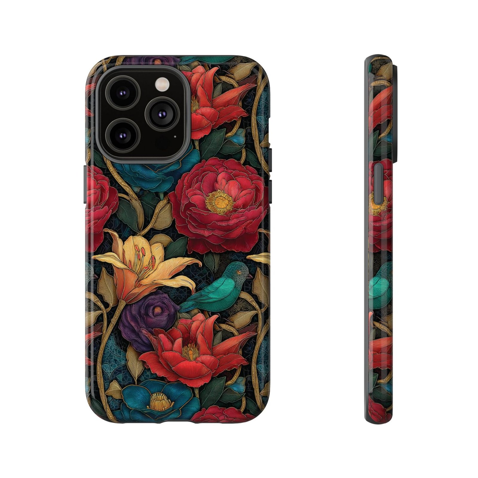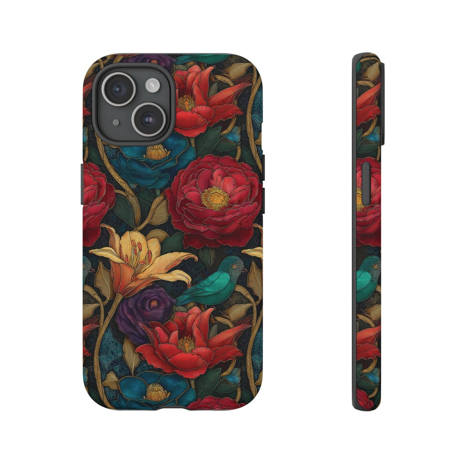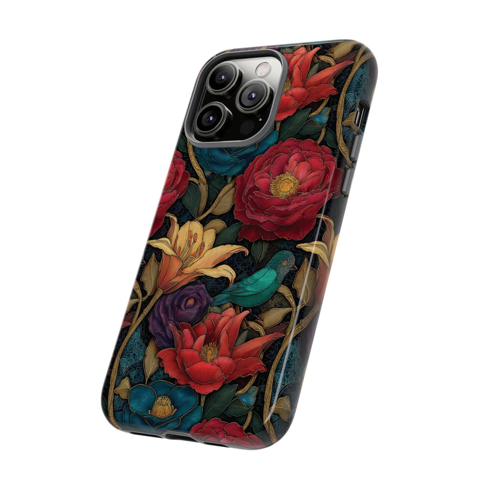 Phone Cases – Stained Glass – Floral with Bird – iPhone 14 15 – Cell Phone – Tough Cases.