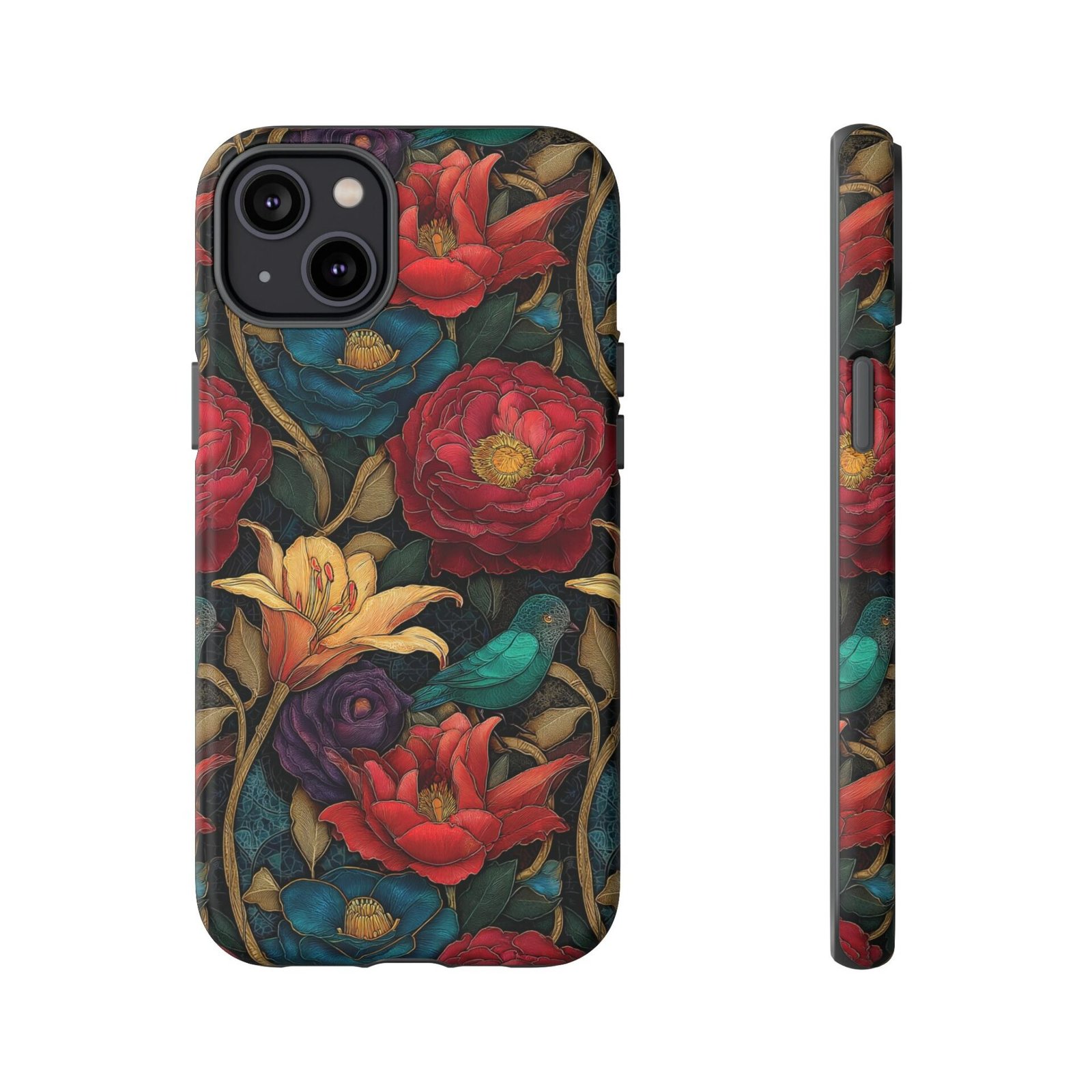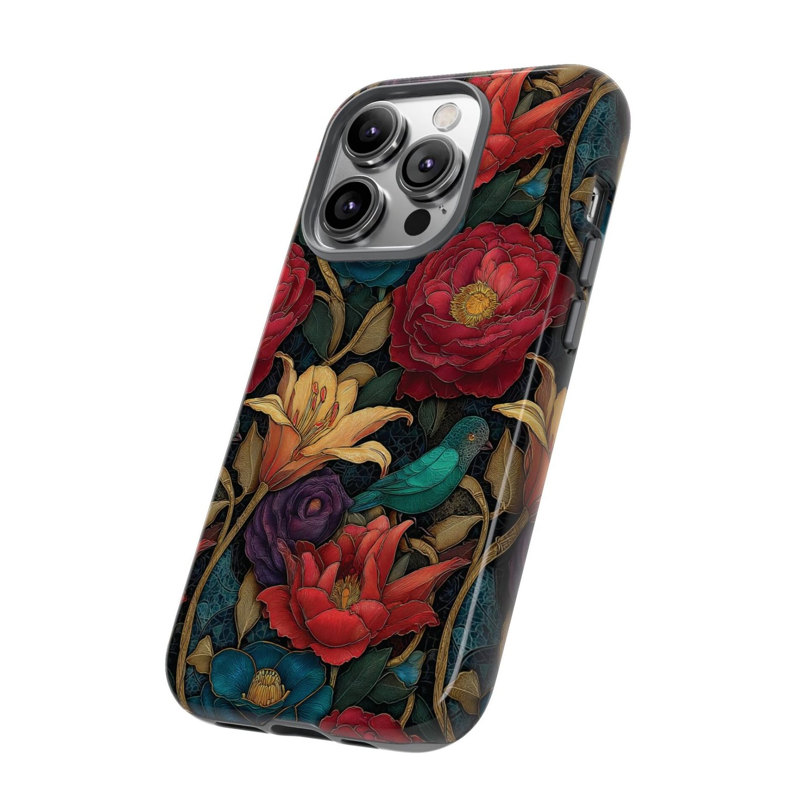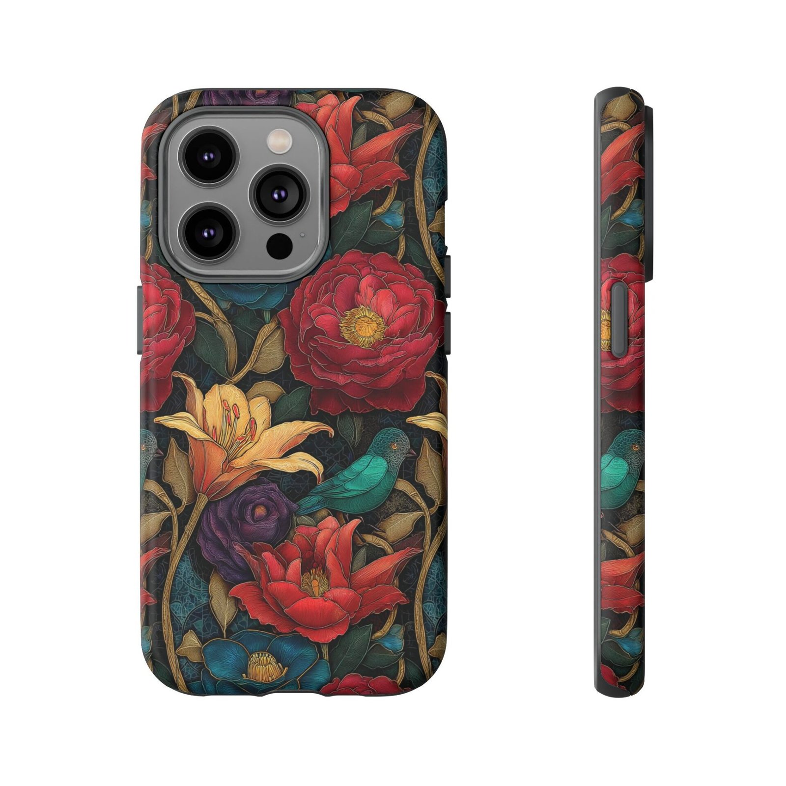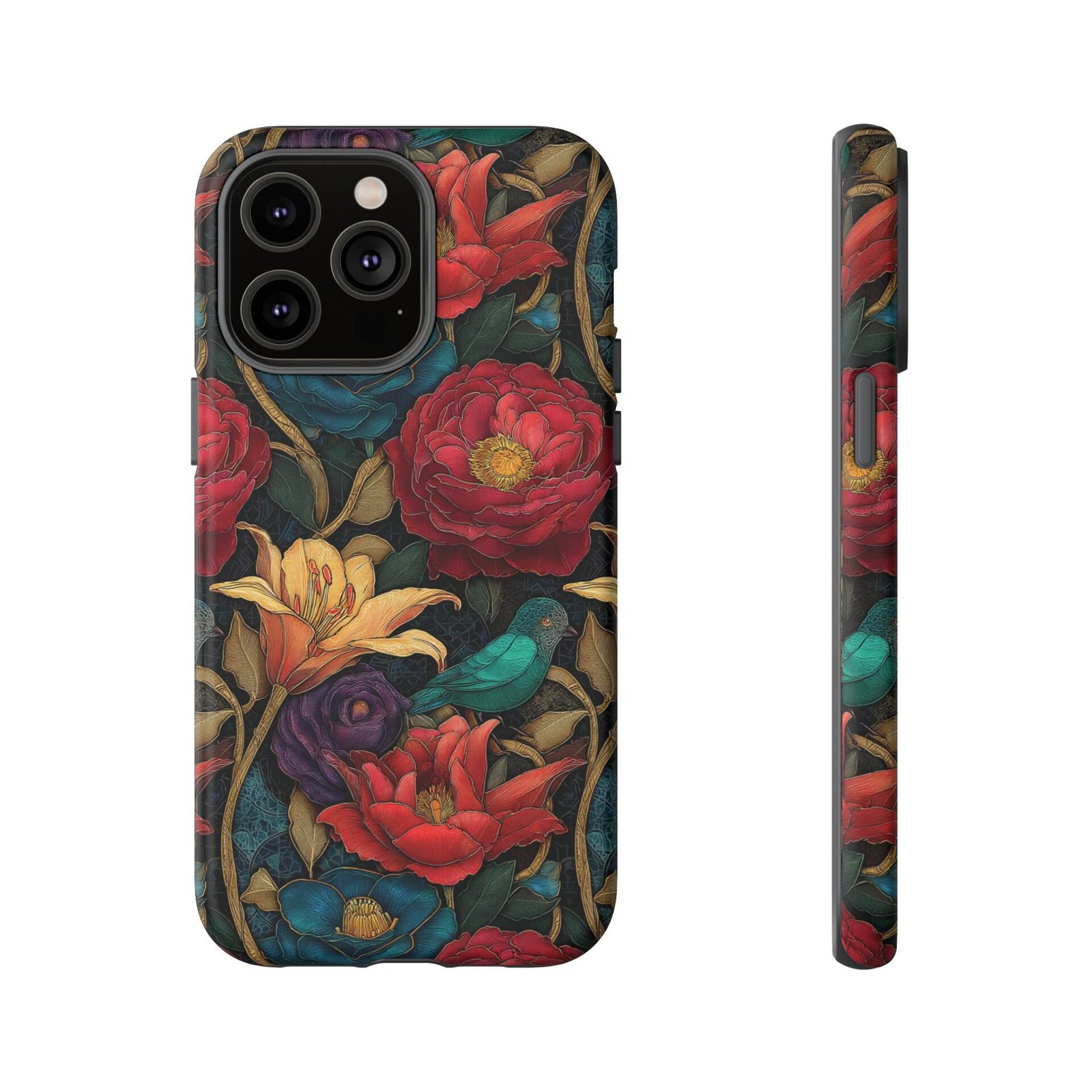 Phone Cases – Stained Glass – Floral with Bird – iPhone 14 15 – Cell Phone – Tough Cases.