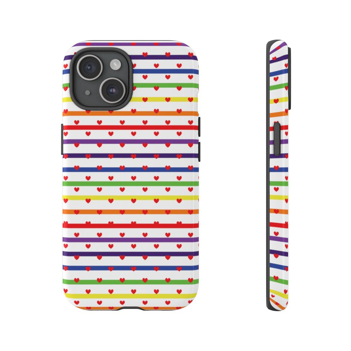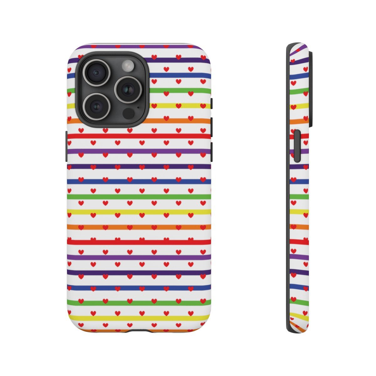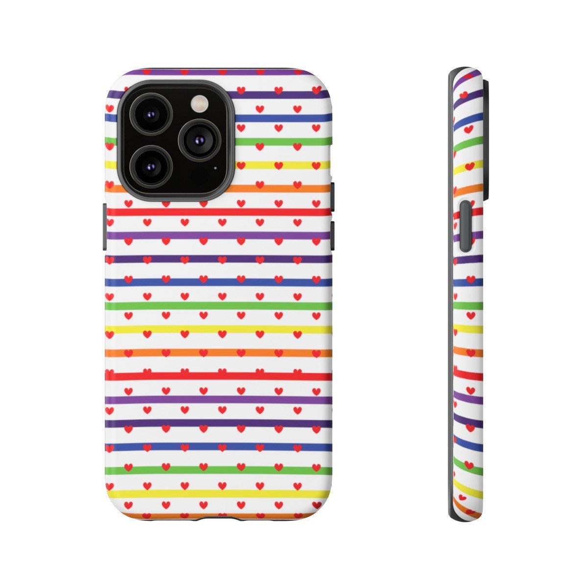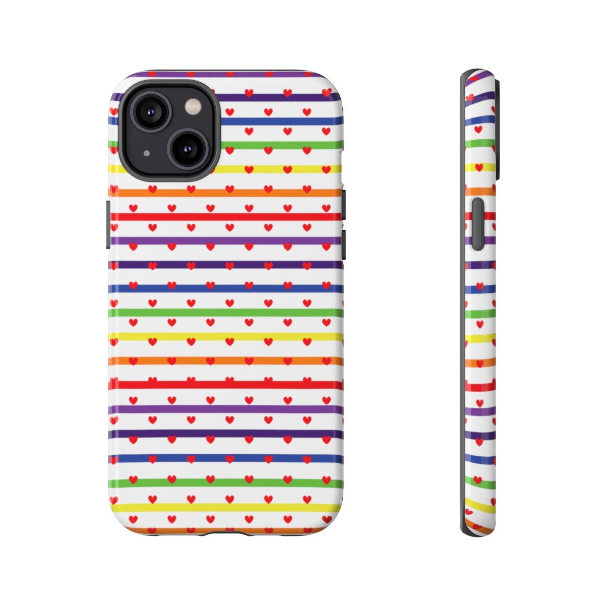 Rainbow and White Stripes With Hearts – iPhone 14 15 – Cell Phone – Tough Cases.