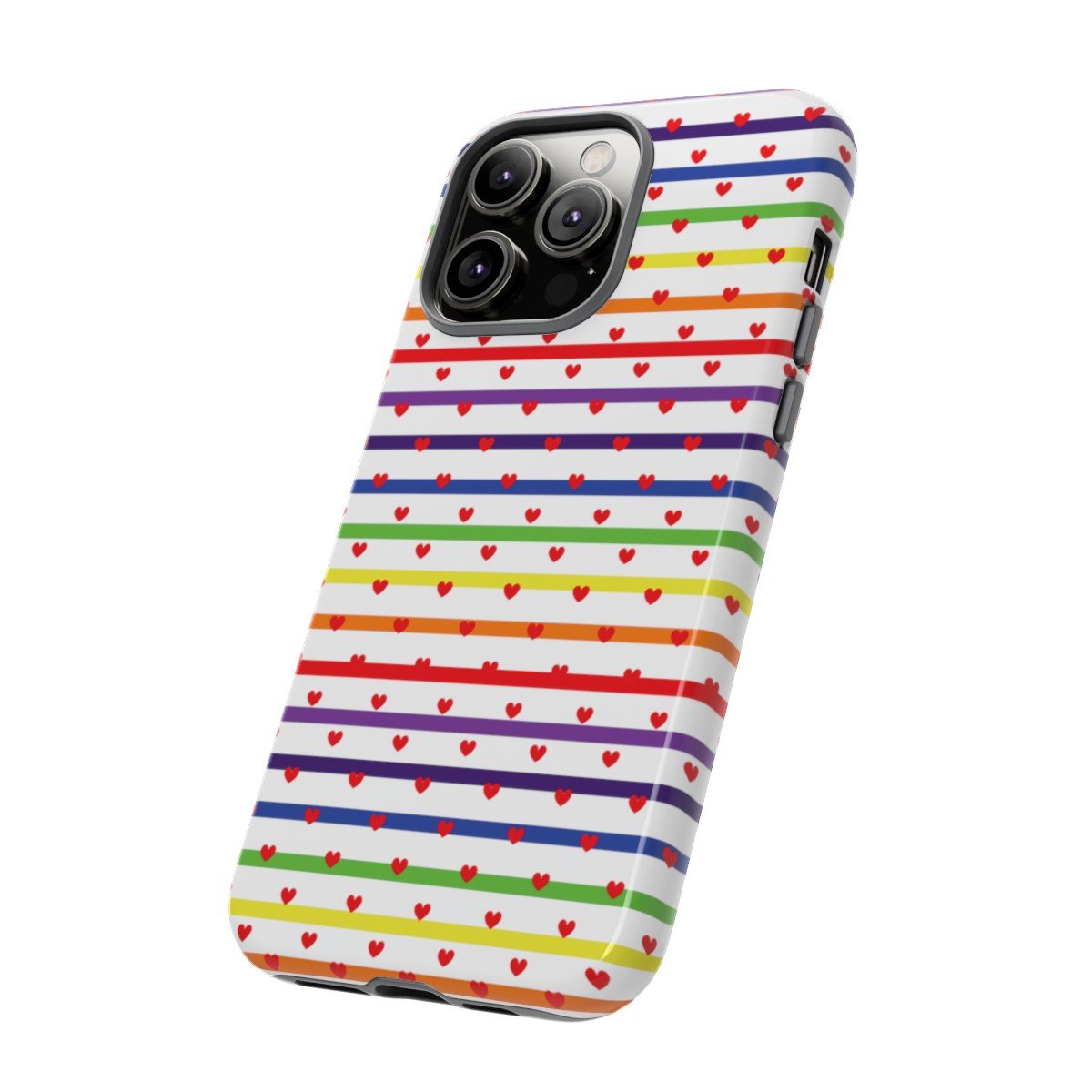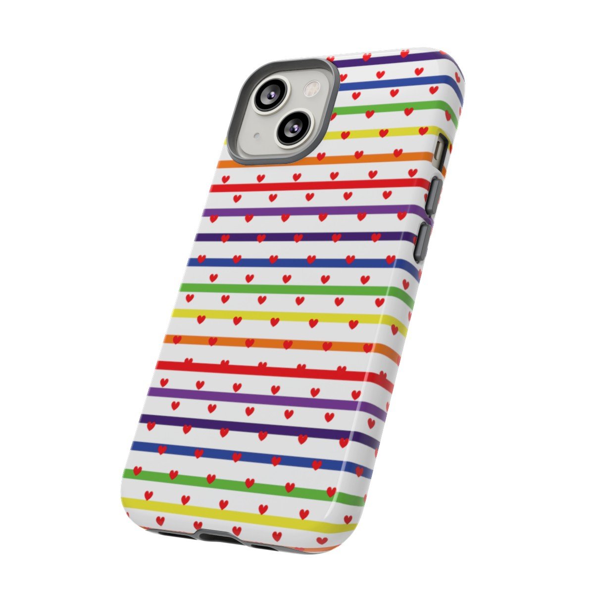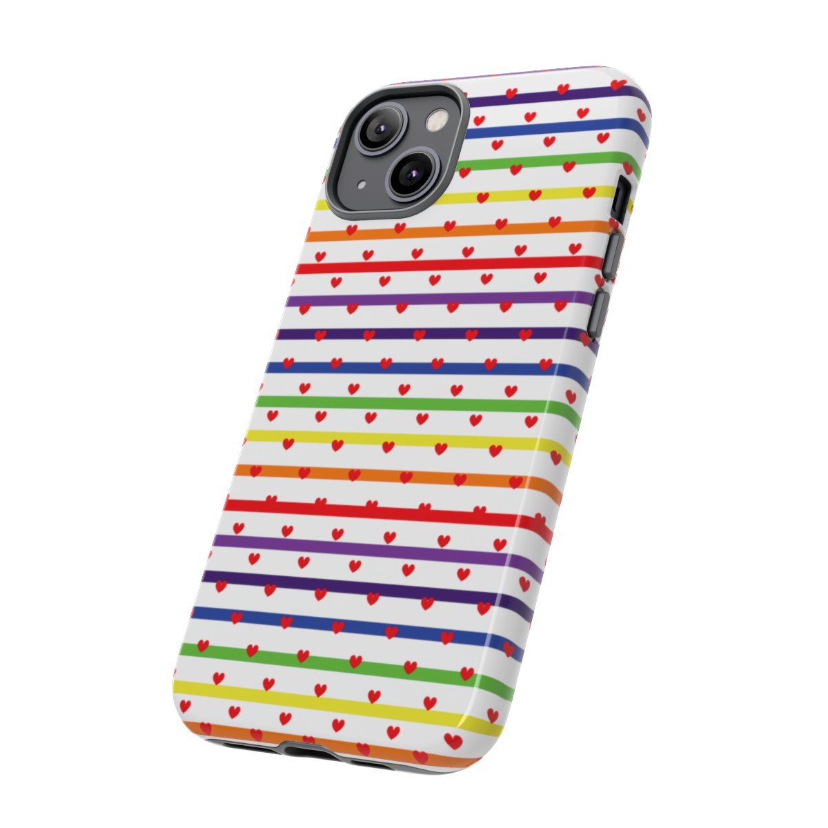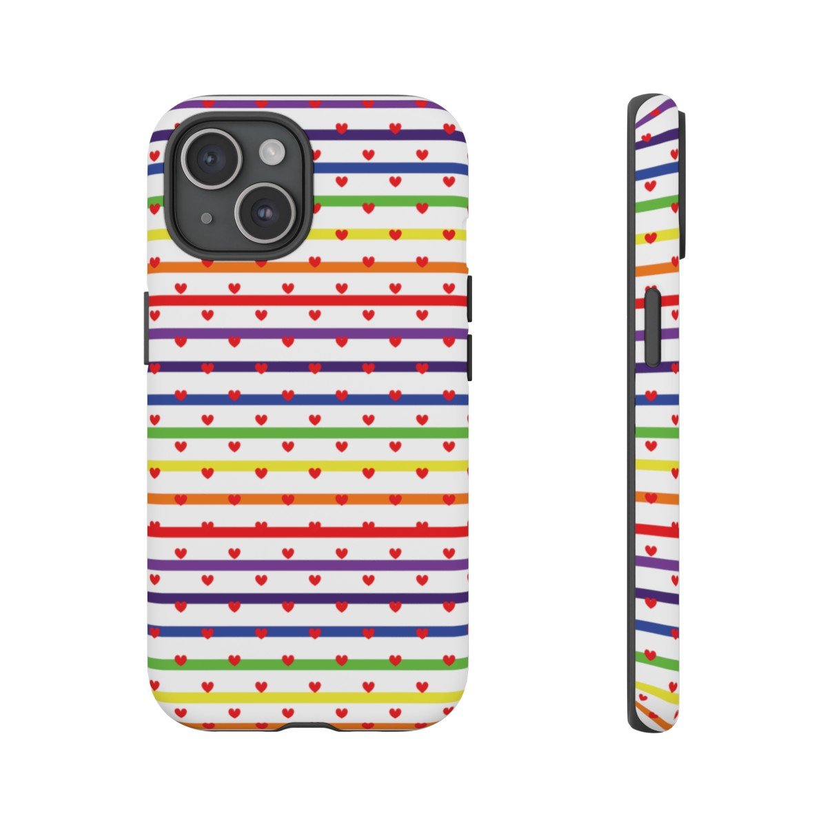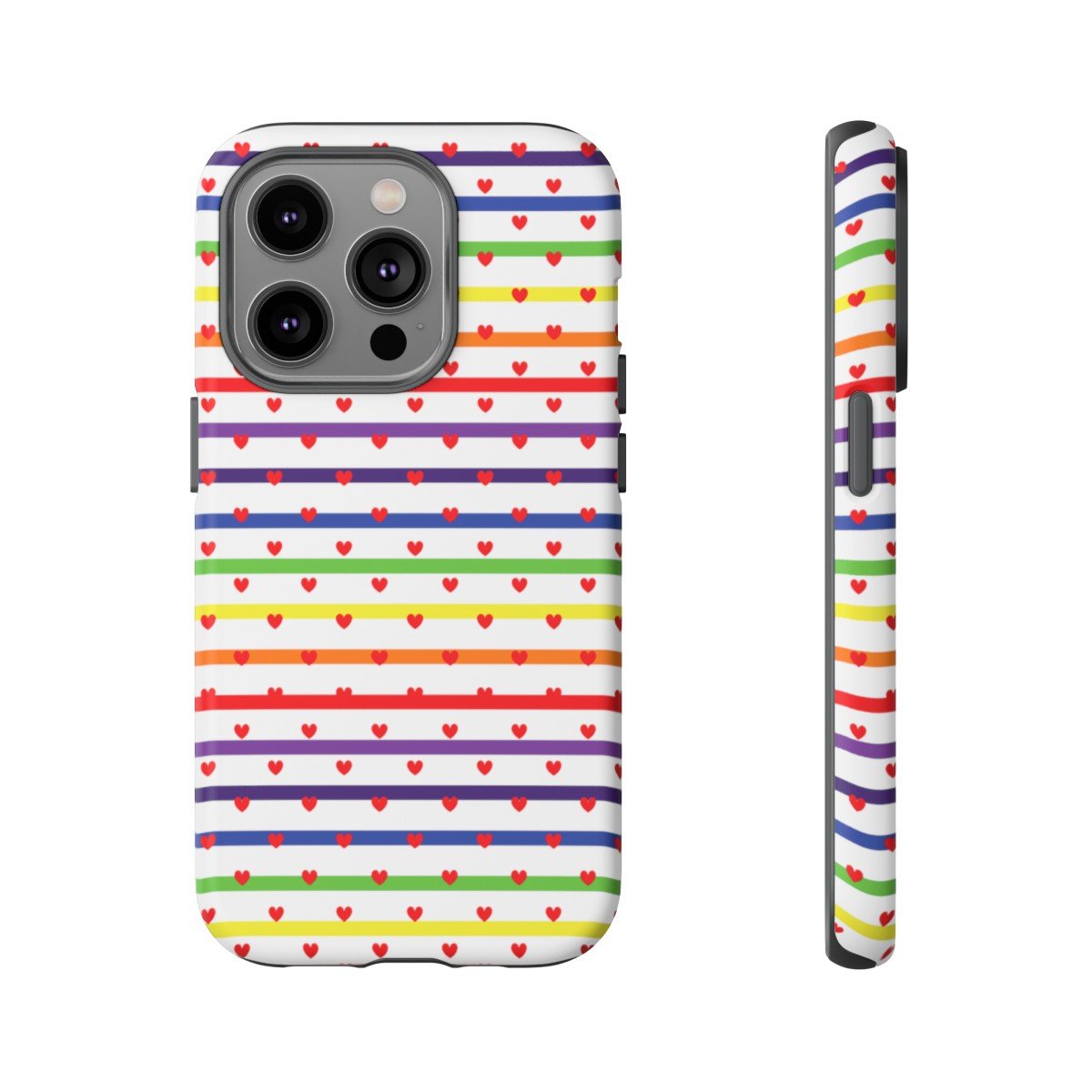 Rainbow and White Stripes With Hearts – iPhone 14 15 – Cell Phone – Tough Cases.