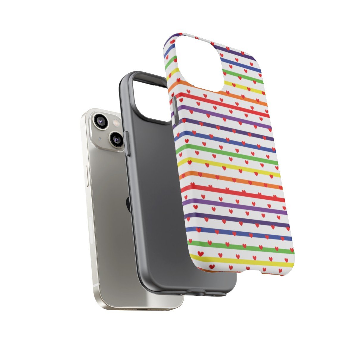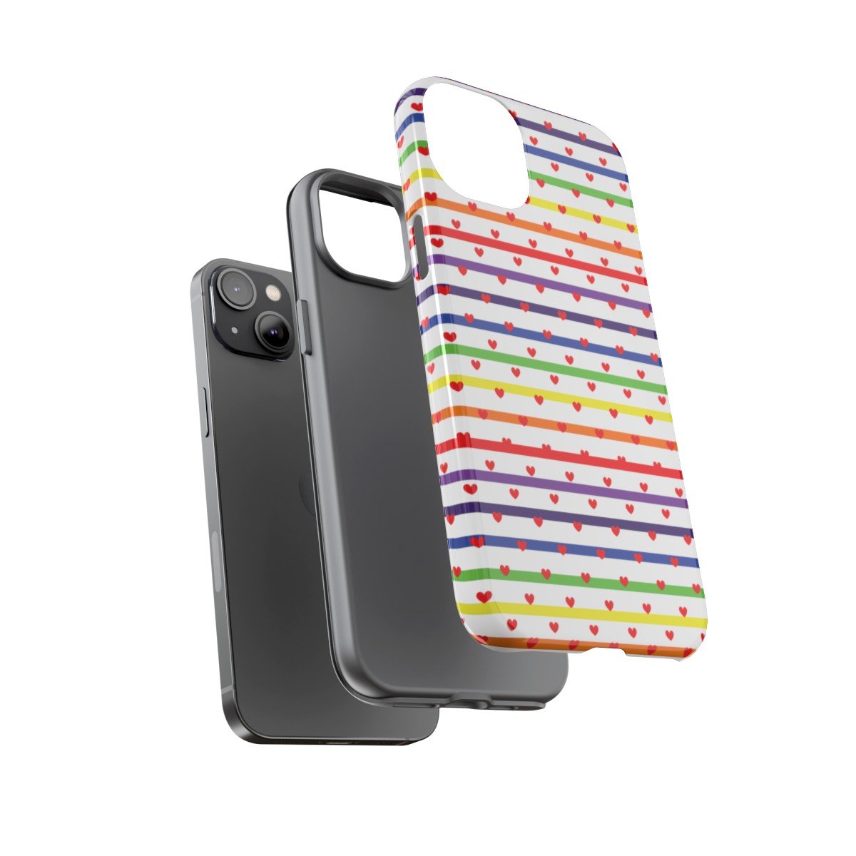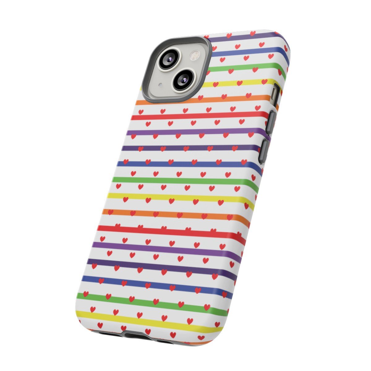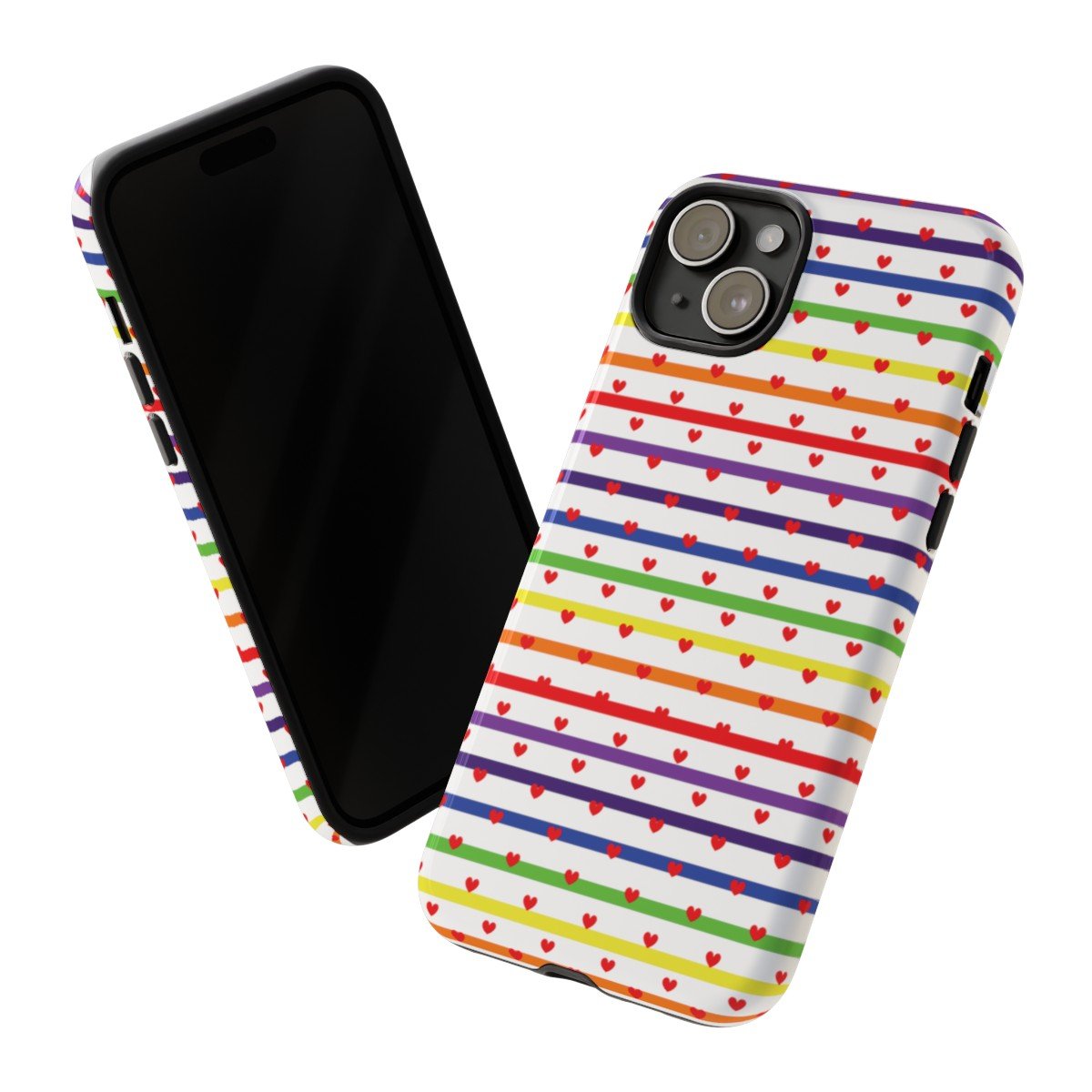 Rainbow and White Stripes With Hearts – iPhone 14 15 – Cell Phone – Tough Cases.