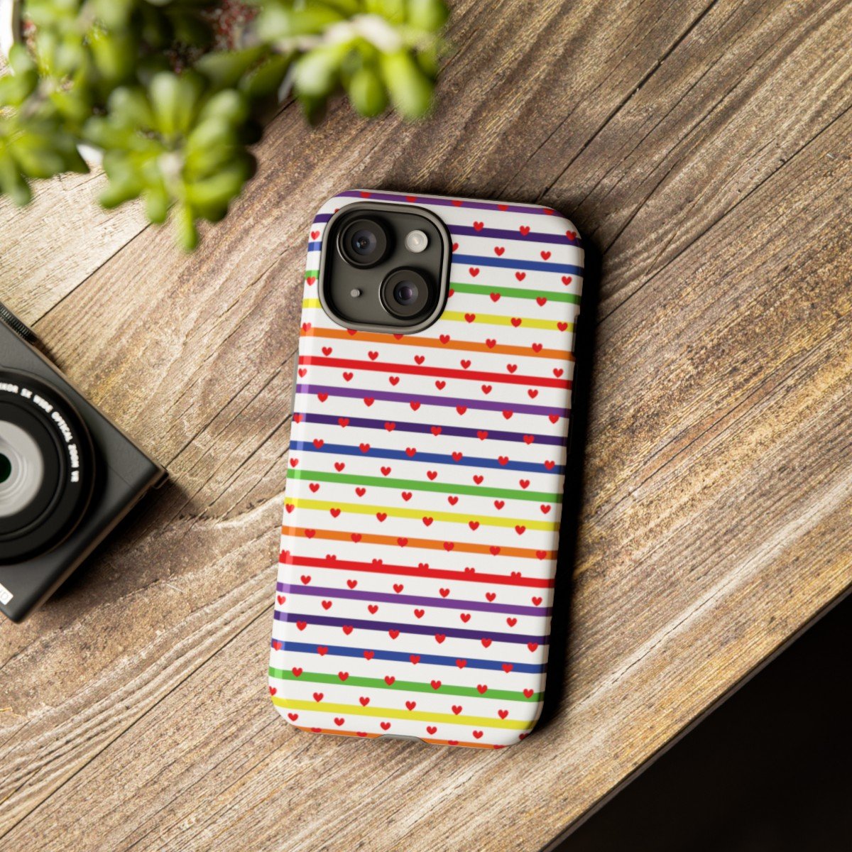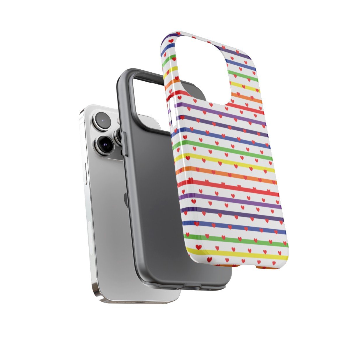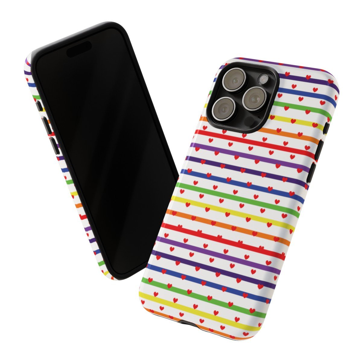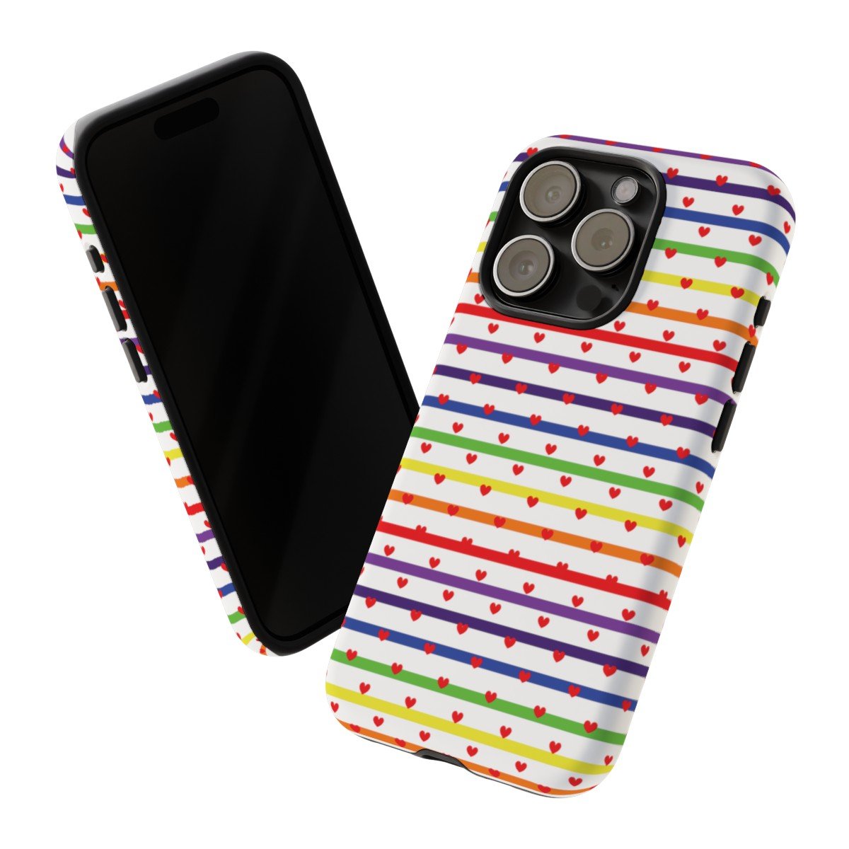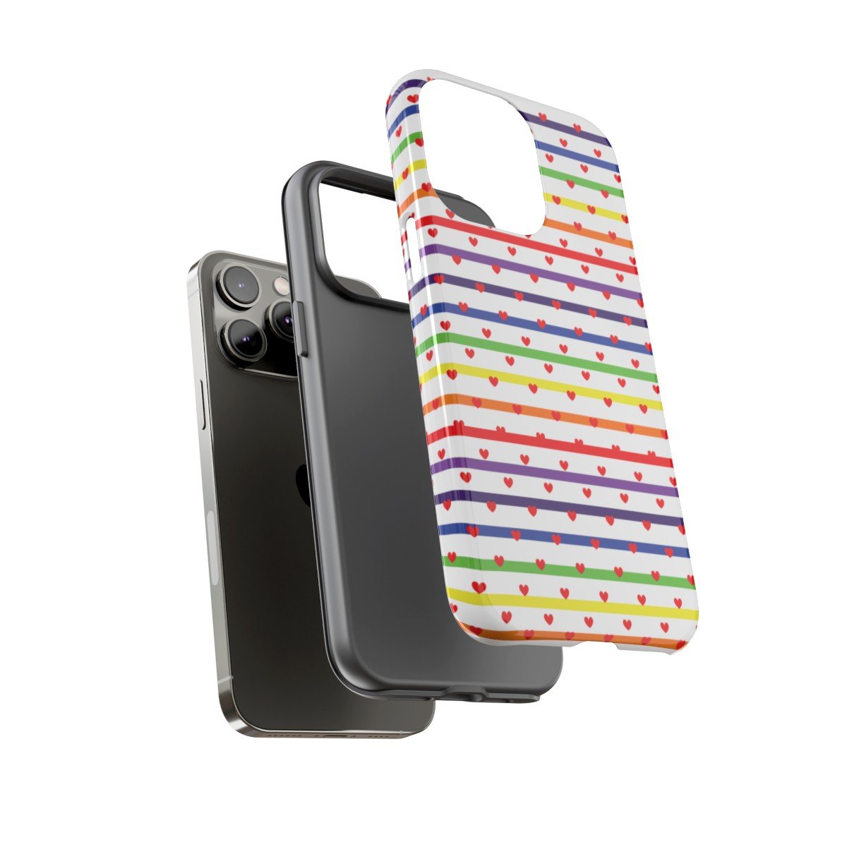 Rainbow and White Stripes With Hearts – iPhone 14 15 – Cell Phone – Tough Cases.