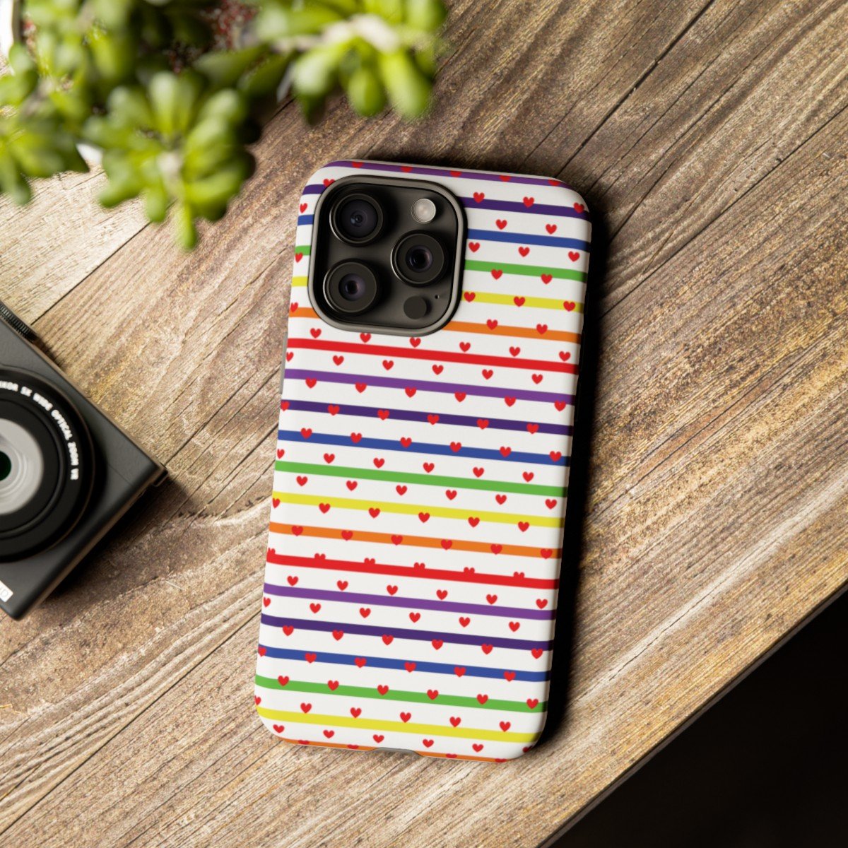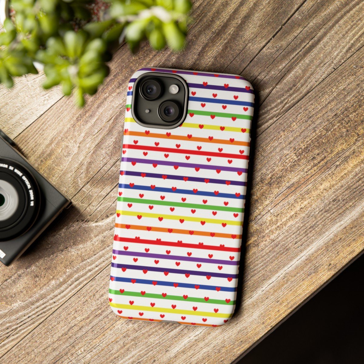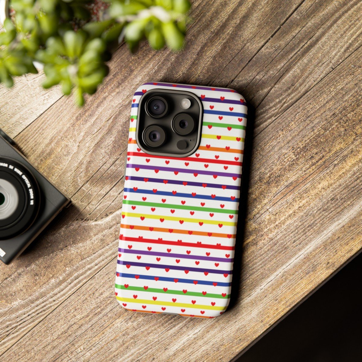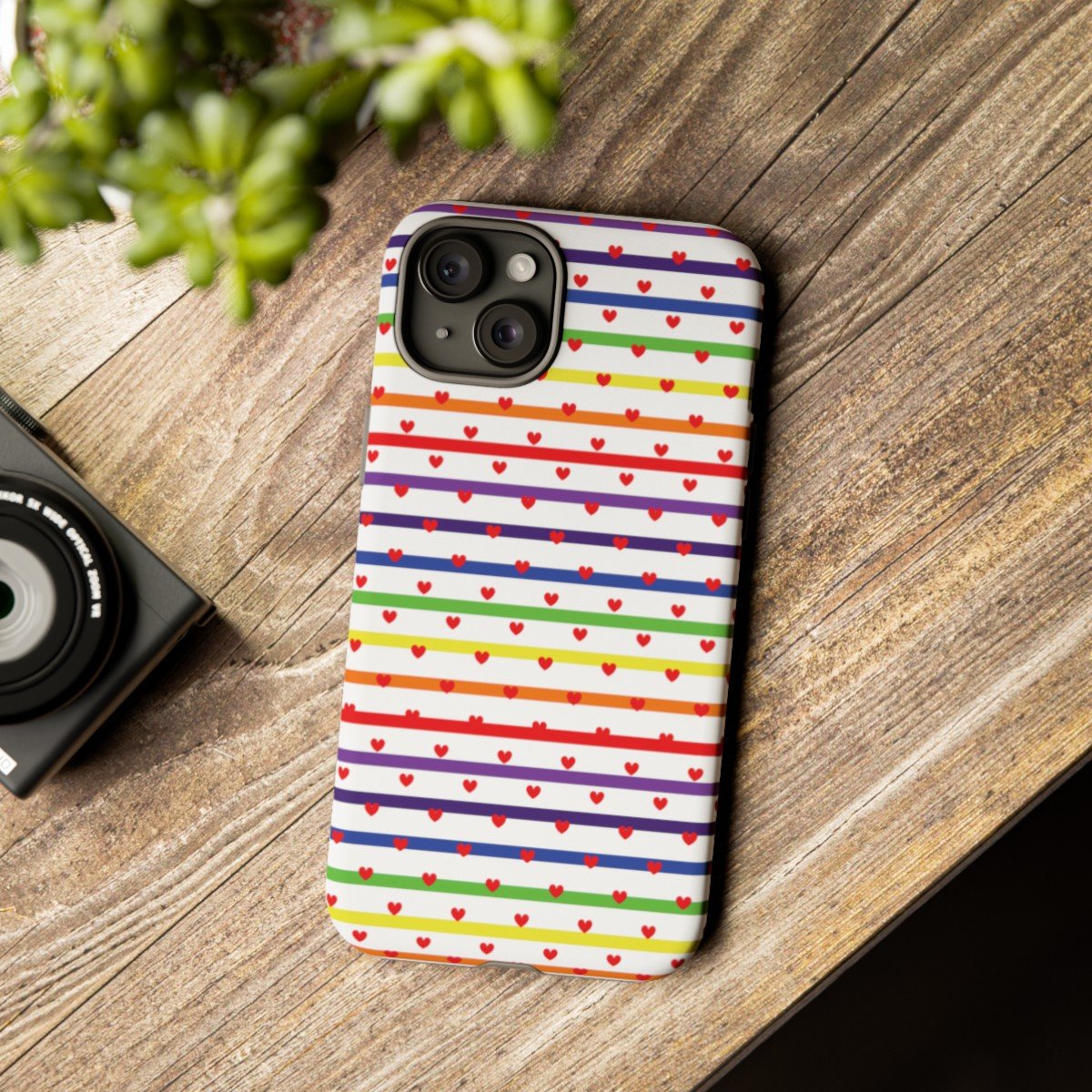 Rainbow and White Stripes With Hearts – iPhone 14 15 – Cell Phone – Tough Cases.