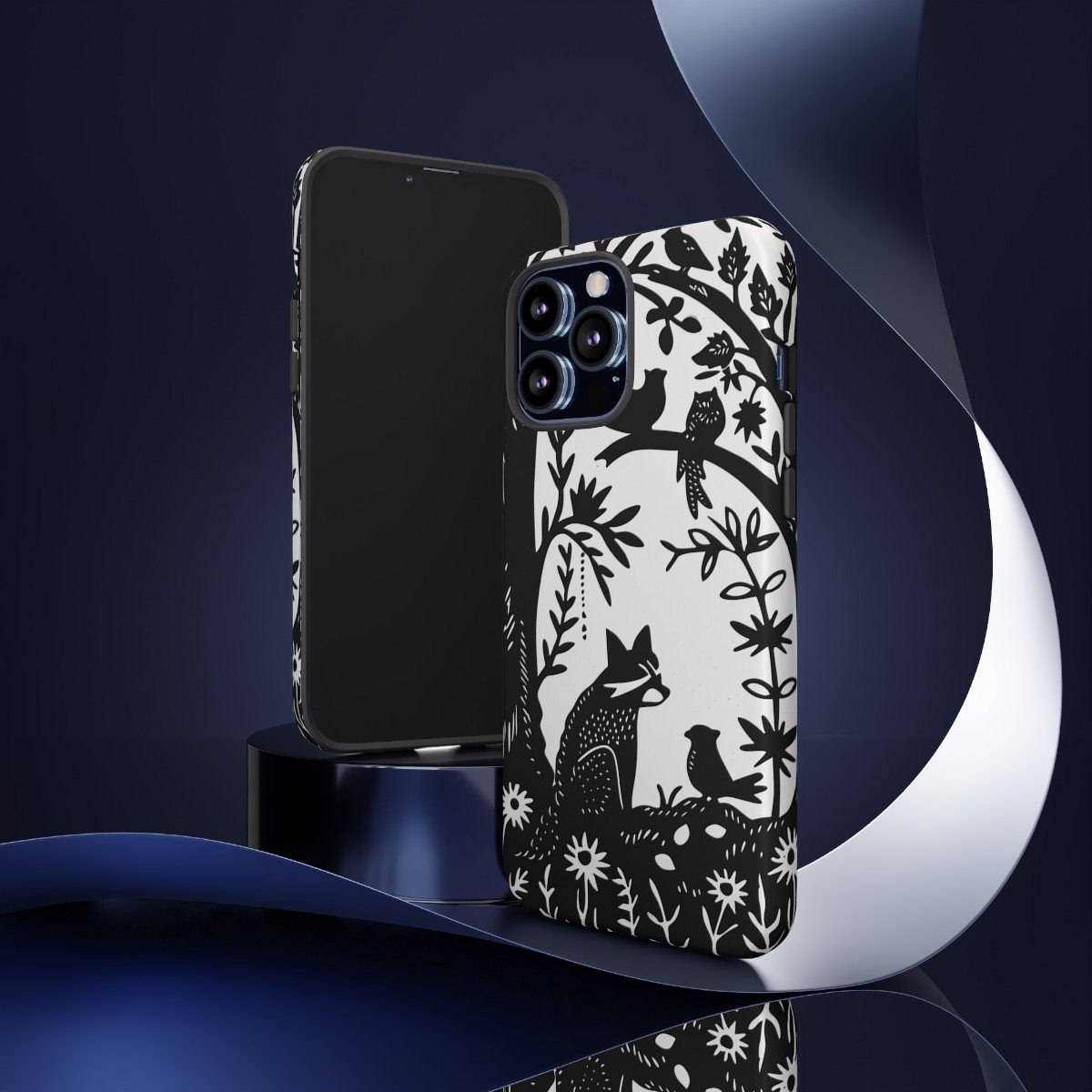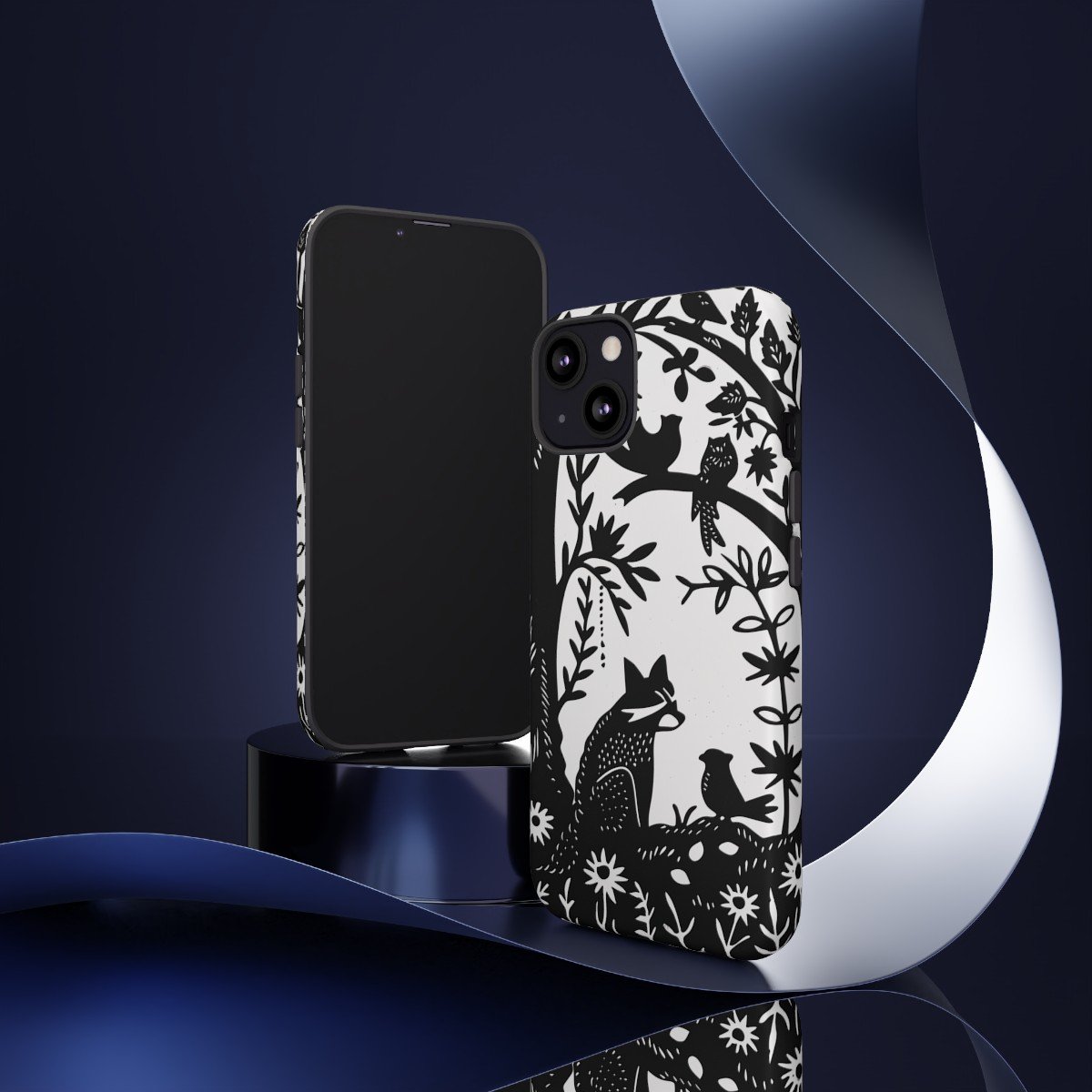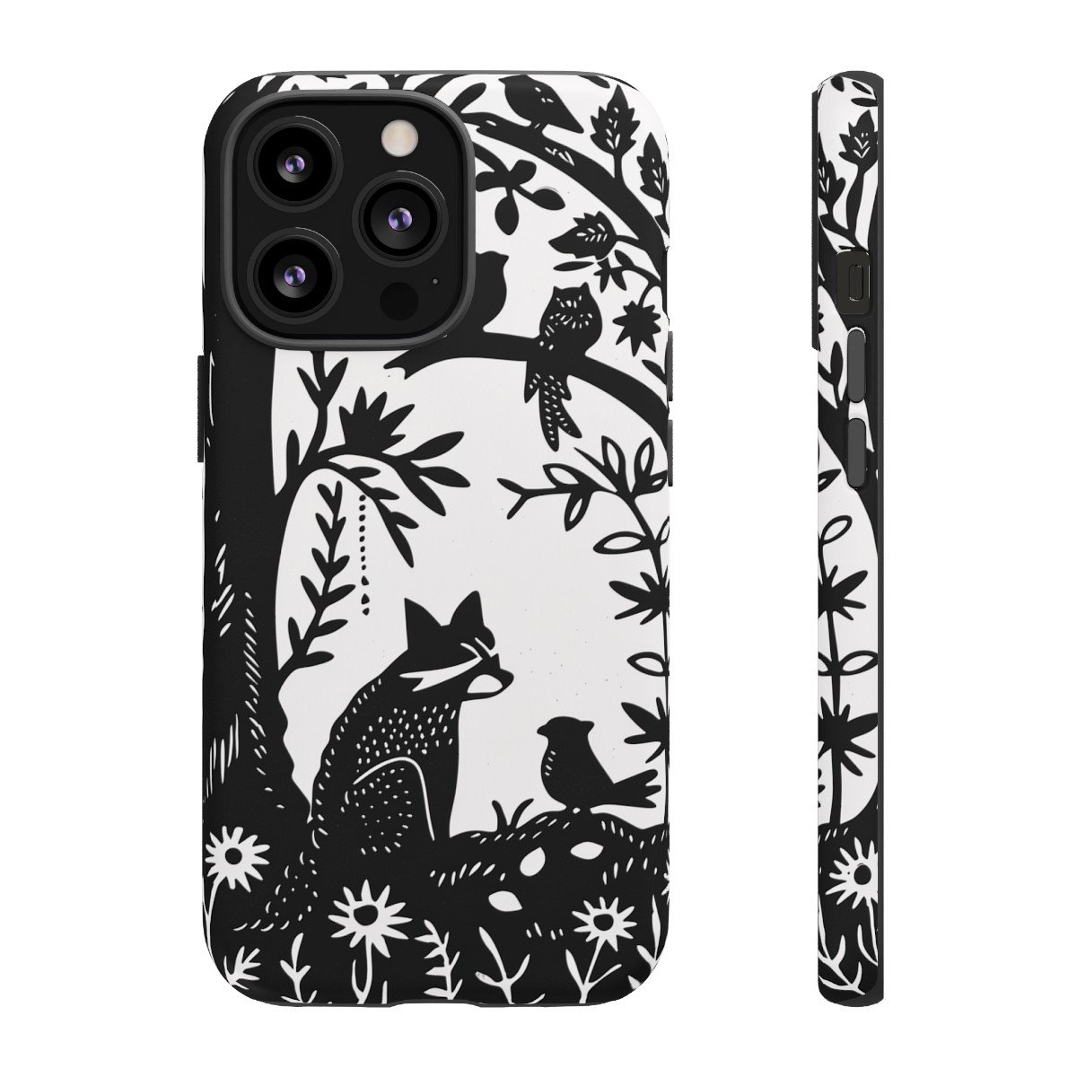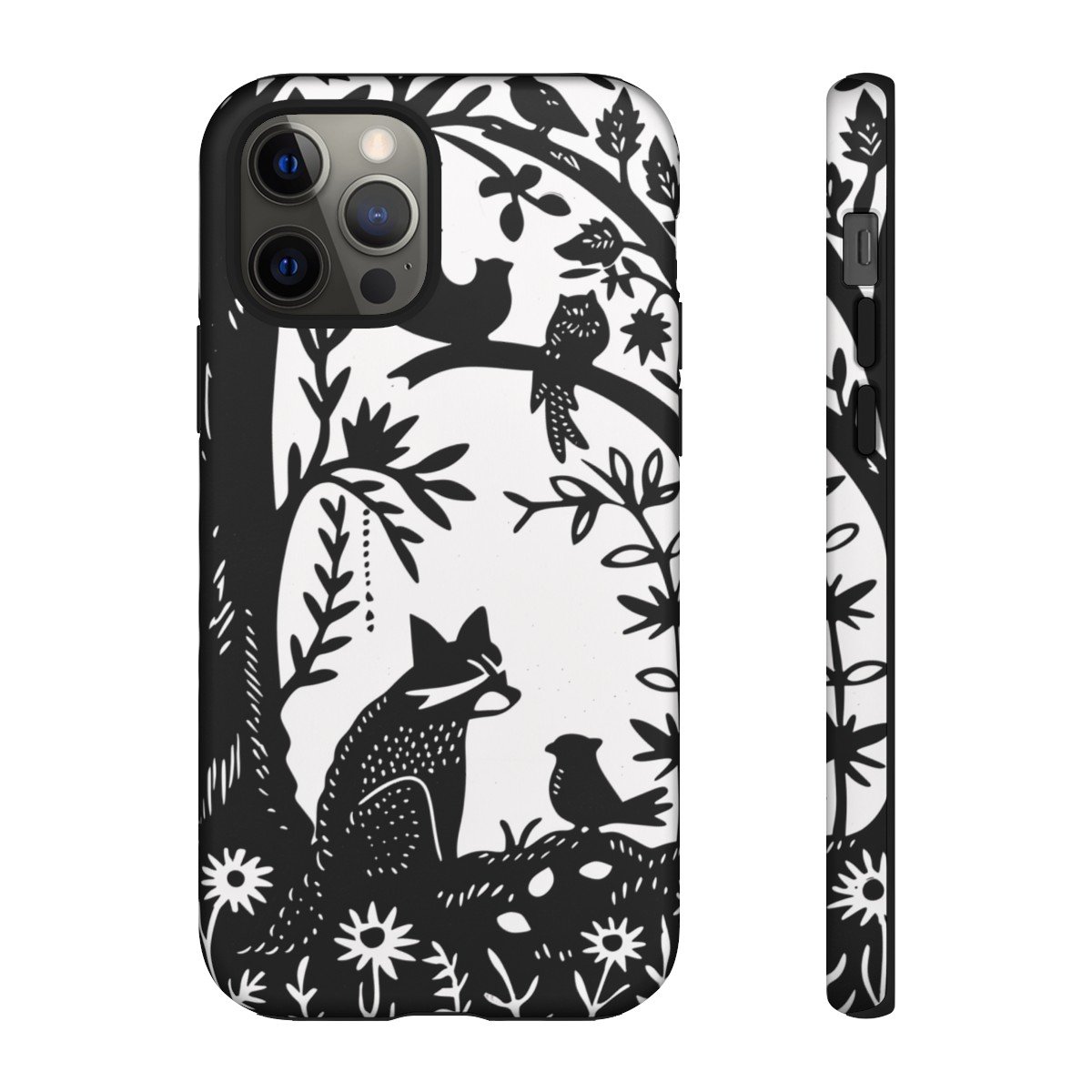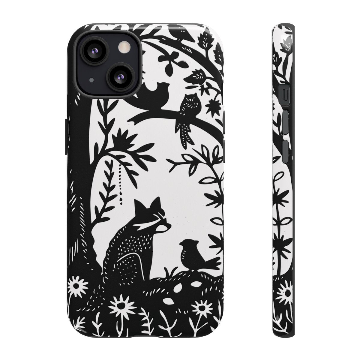 Retro Linocut Raccoon Birds Tree Flowers – iPhone 12 13 – Cell Phone – Tough Cases.