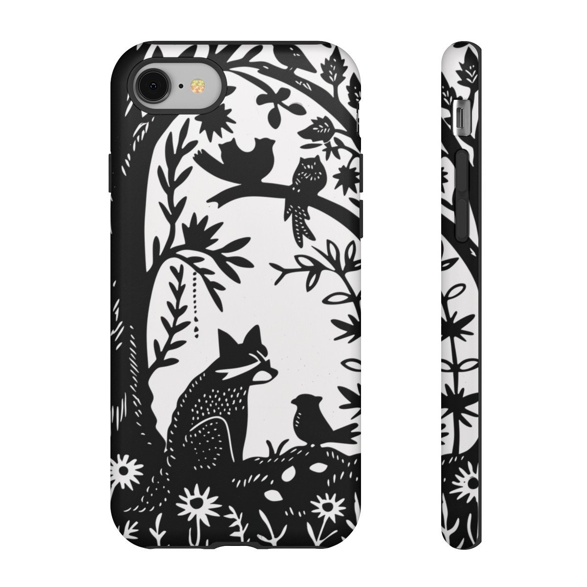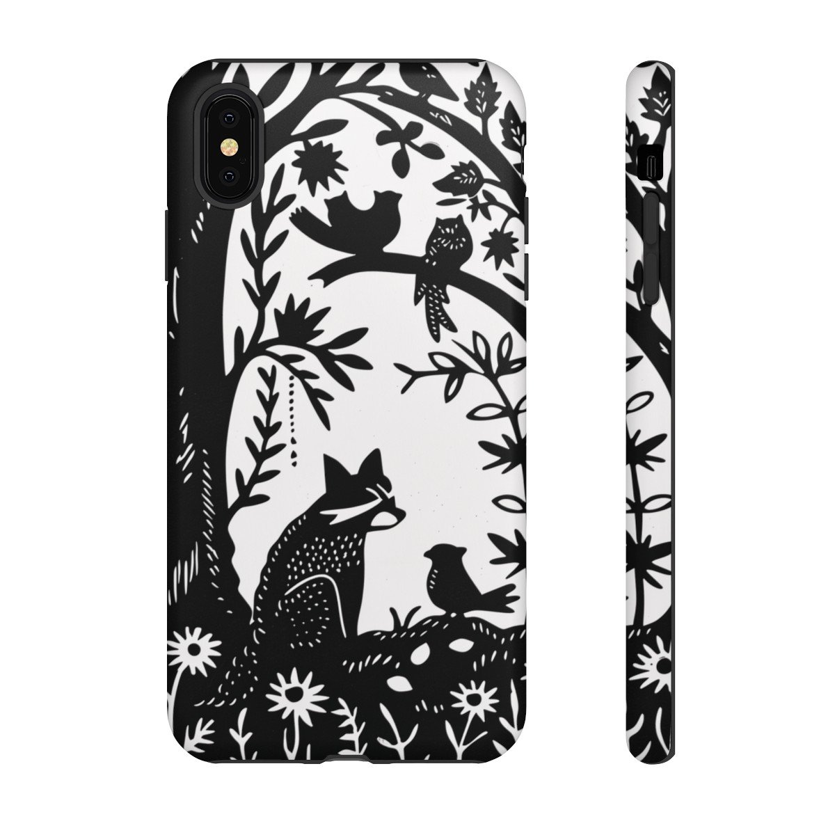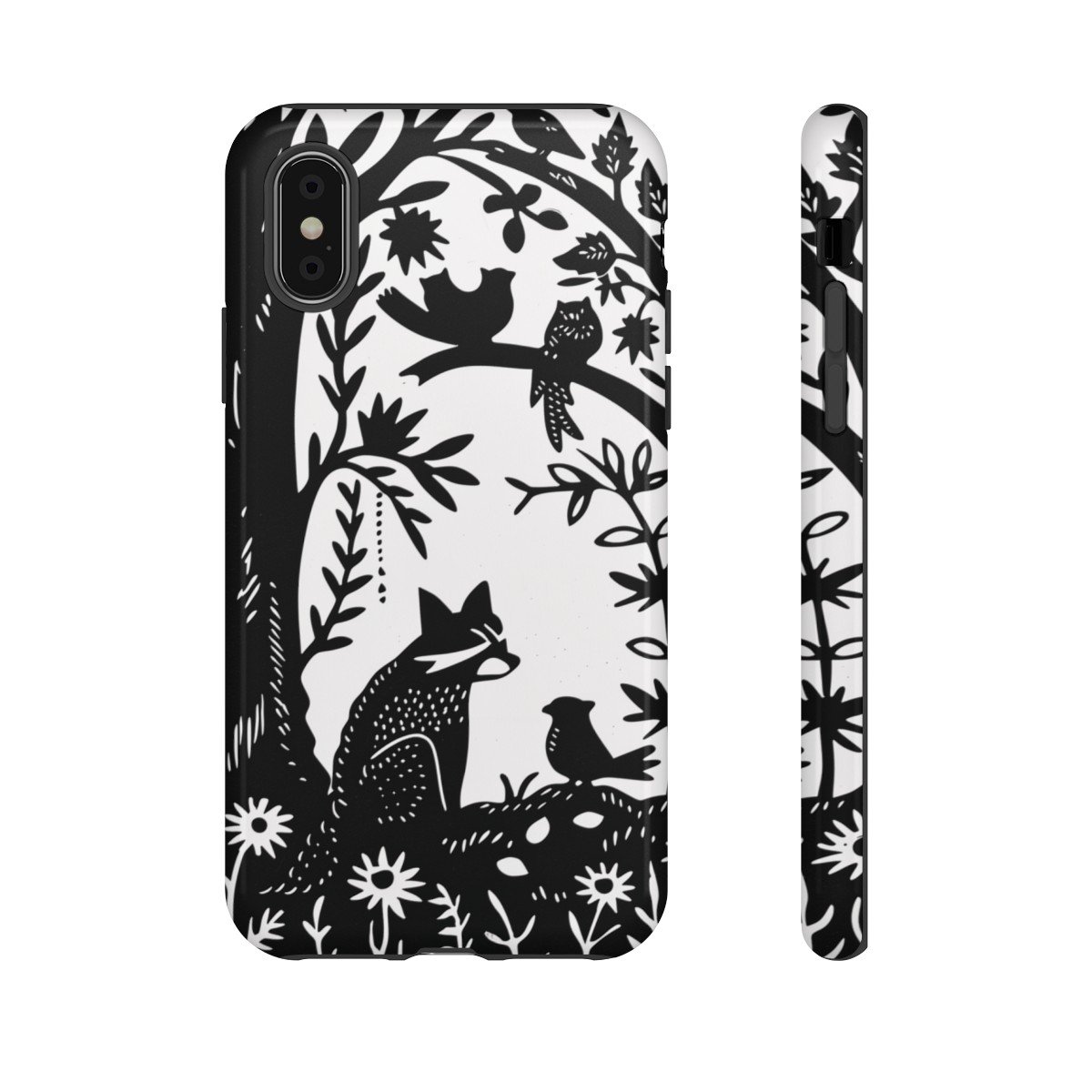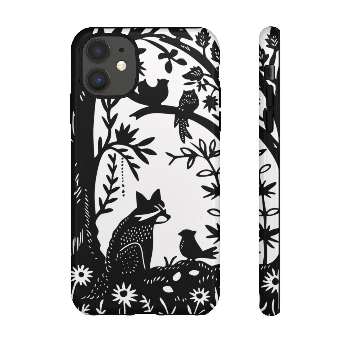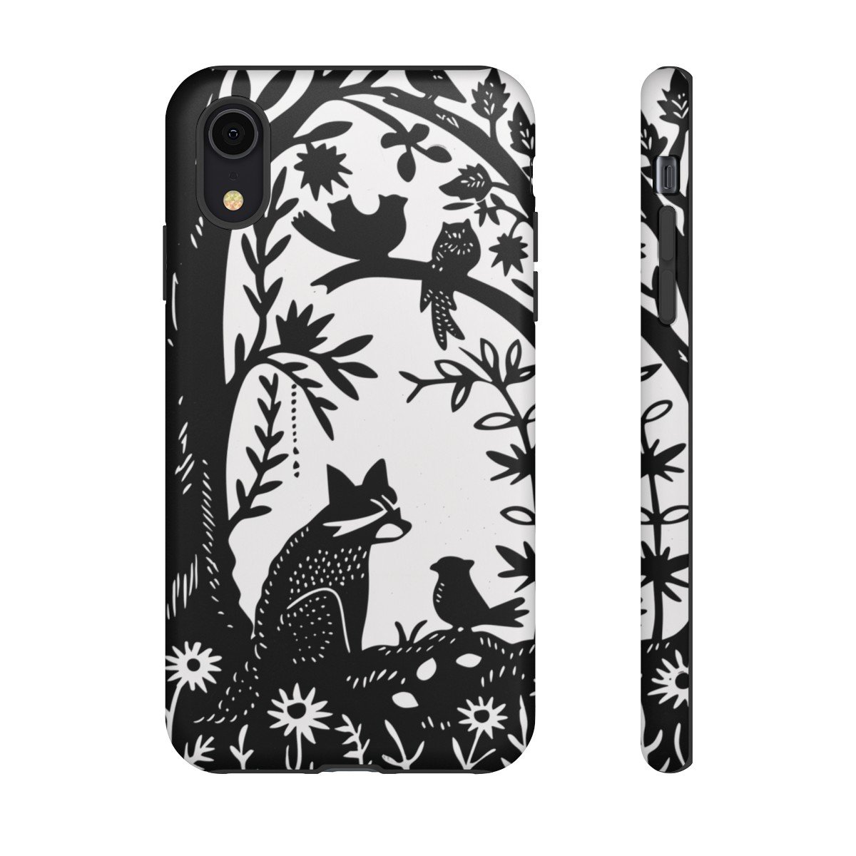 Retro Linocut Raccoon Birds Tree Flowers – iPhone 8 X 11 – Cell Phone – Tough Cases.