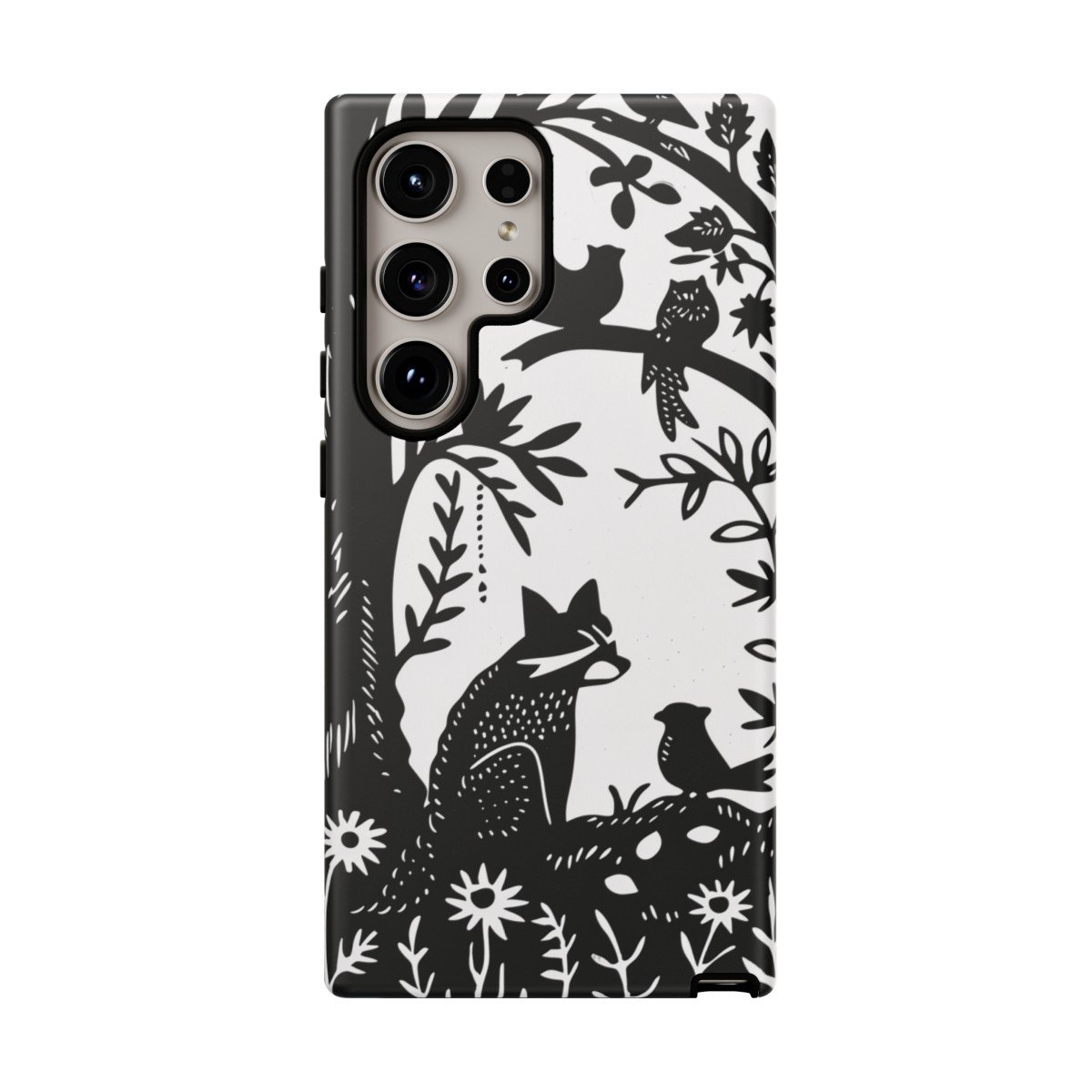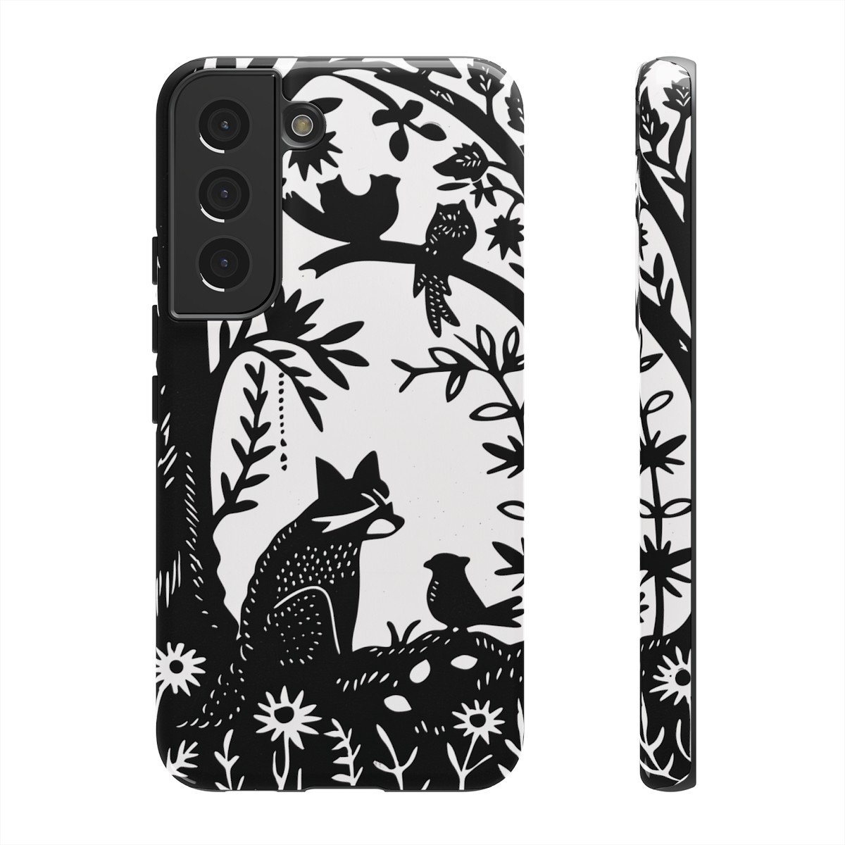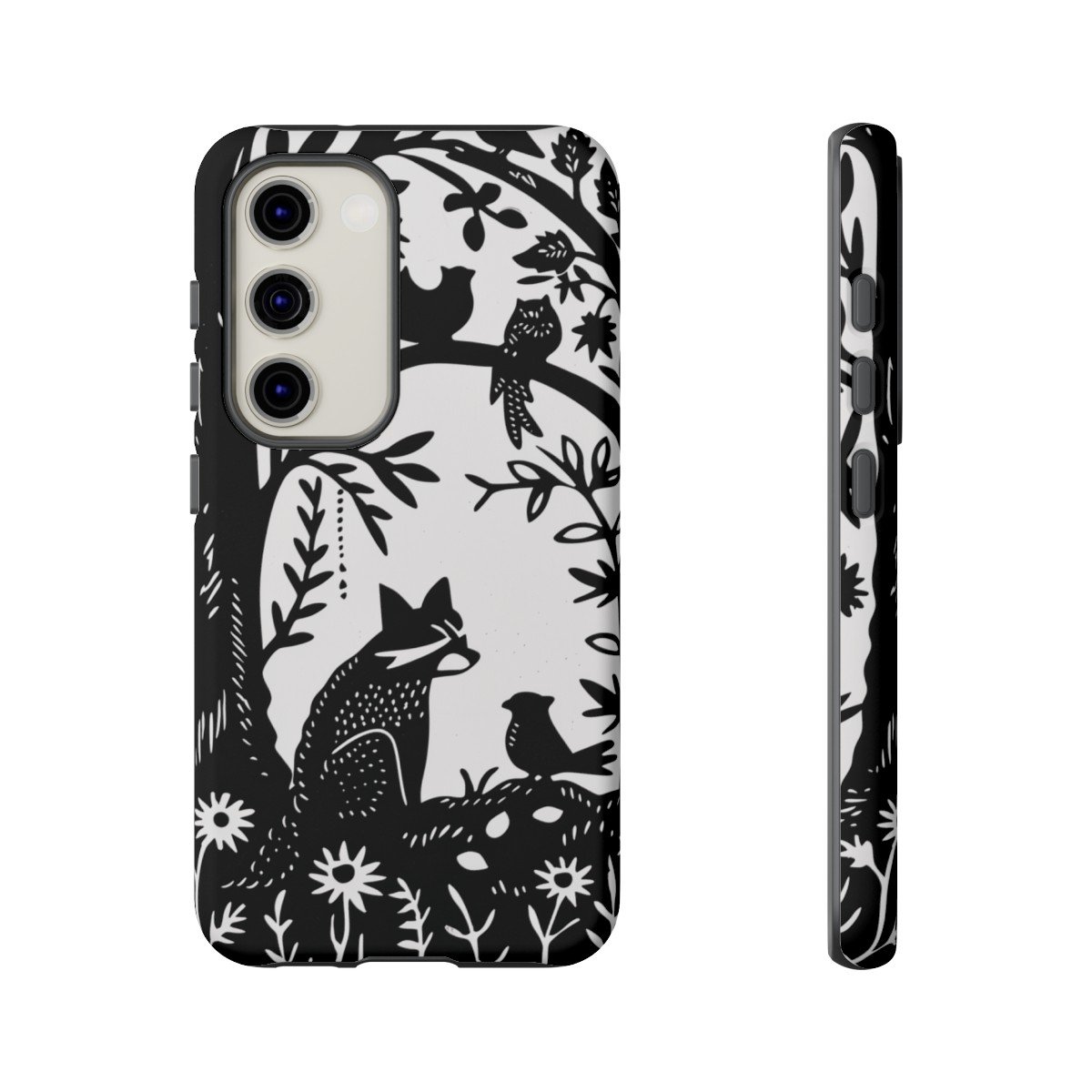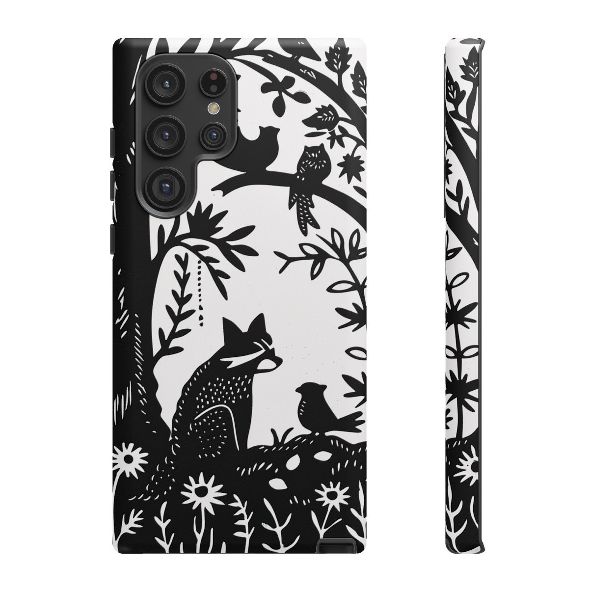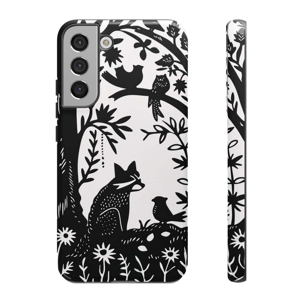Retro Linocut Raccoon Birds Tree Flowers – Samsung Galaxy S22 S23 S24 – Cell Phone – Tough Cases.