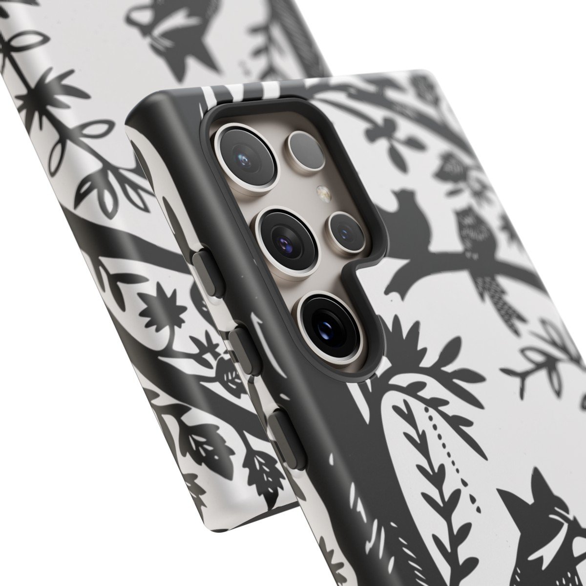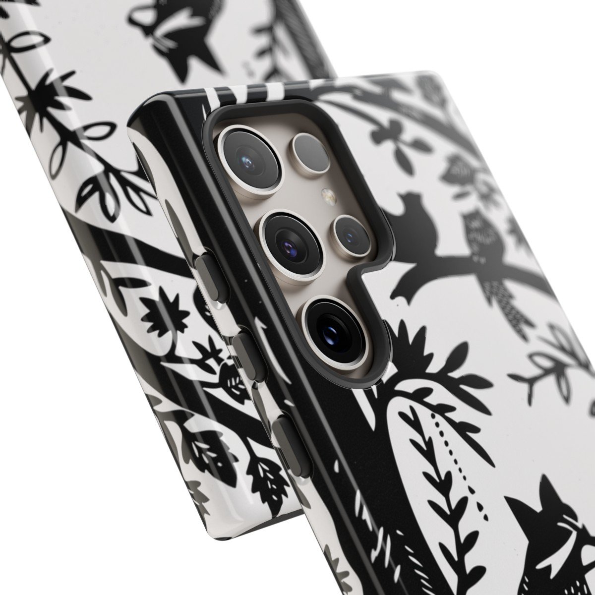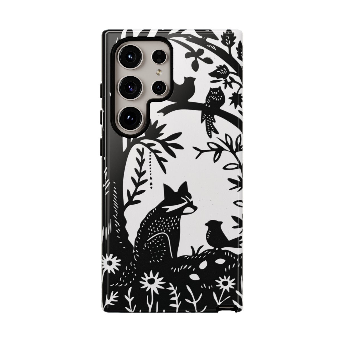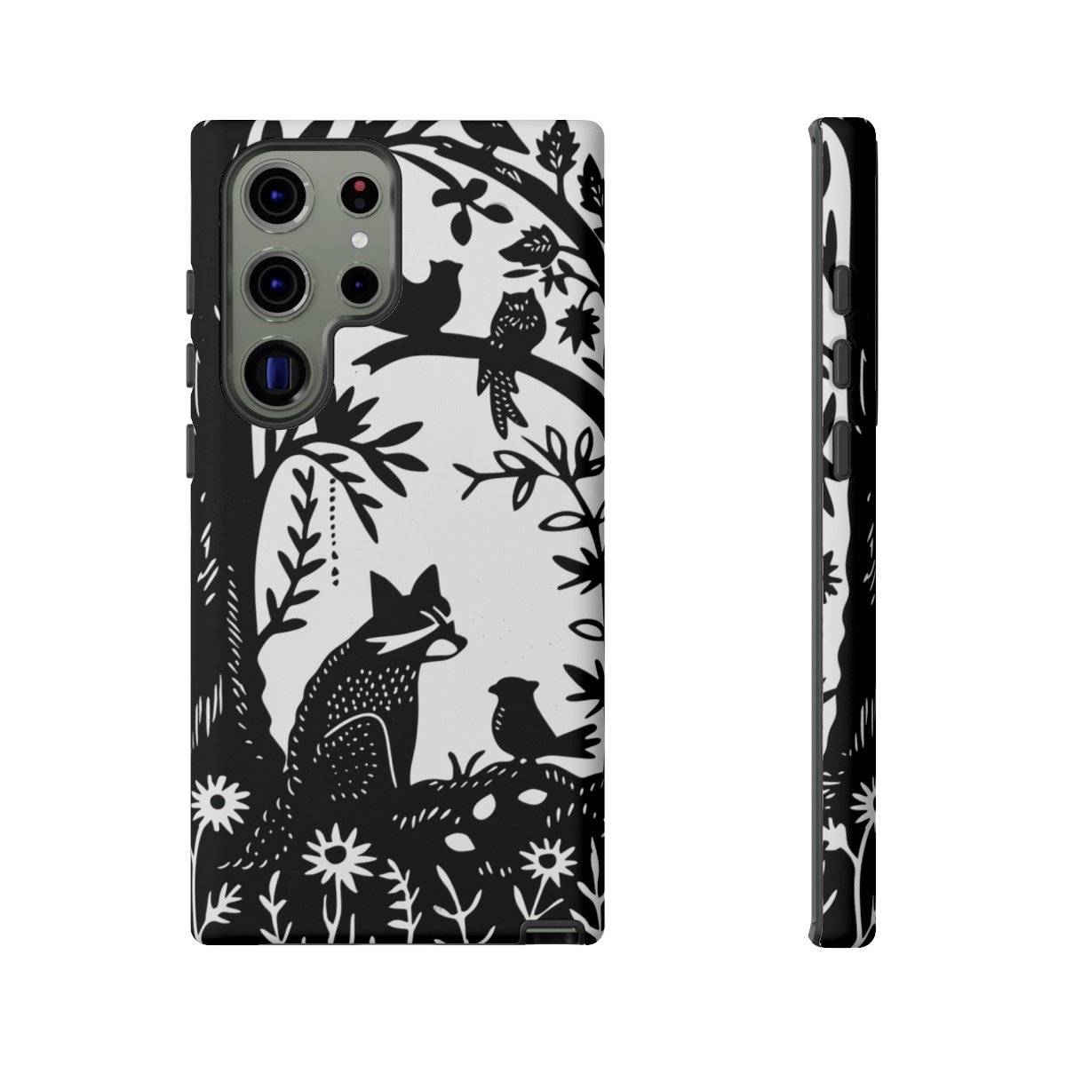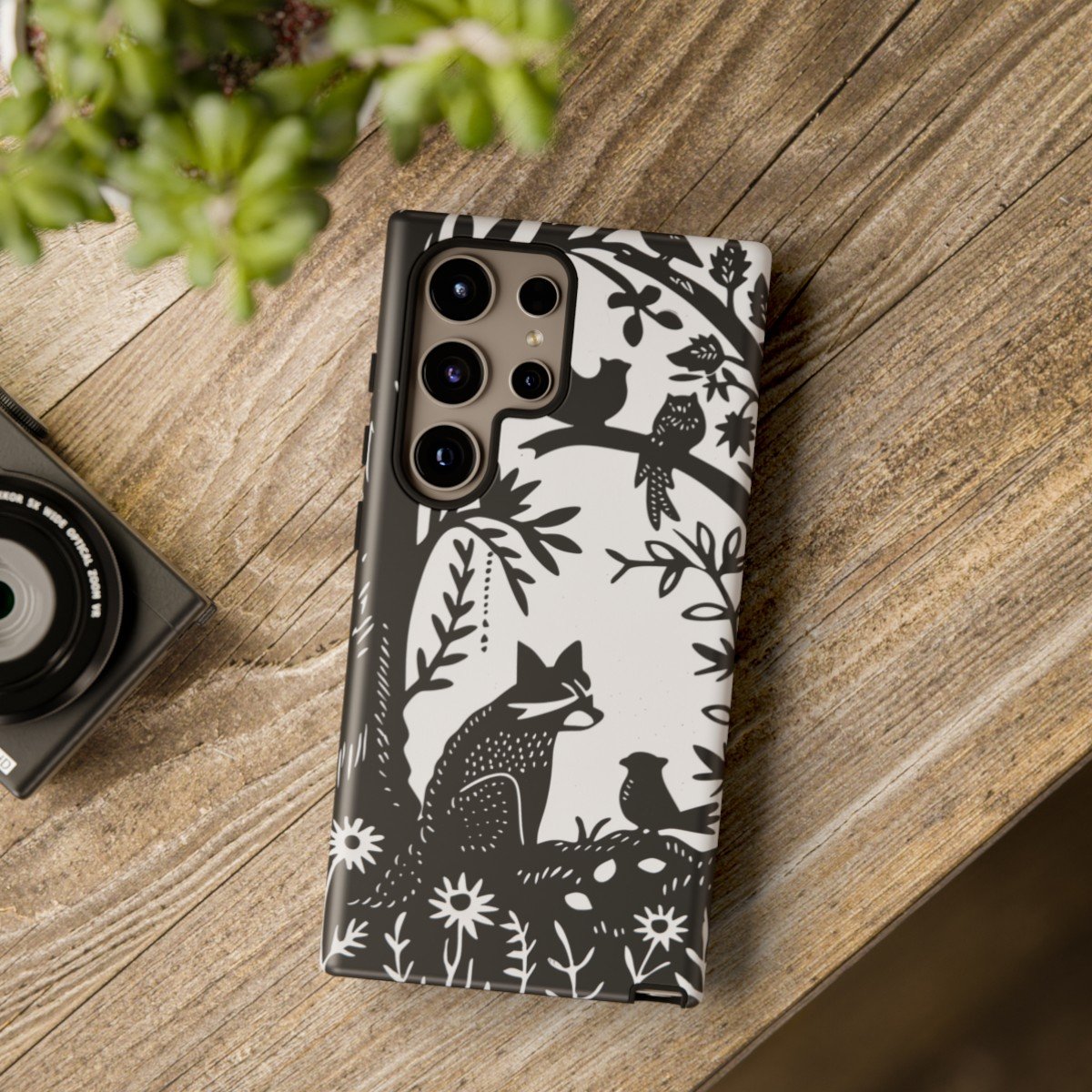 Retro Linocut Raccoon Birds Tree Flowers – Samsung Galaxy S22 S23 S24 – Cell Phone – Tough Cases.