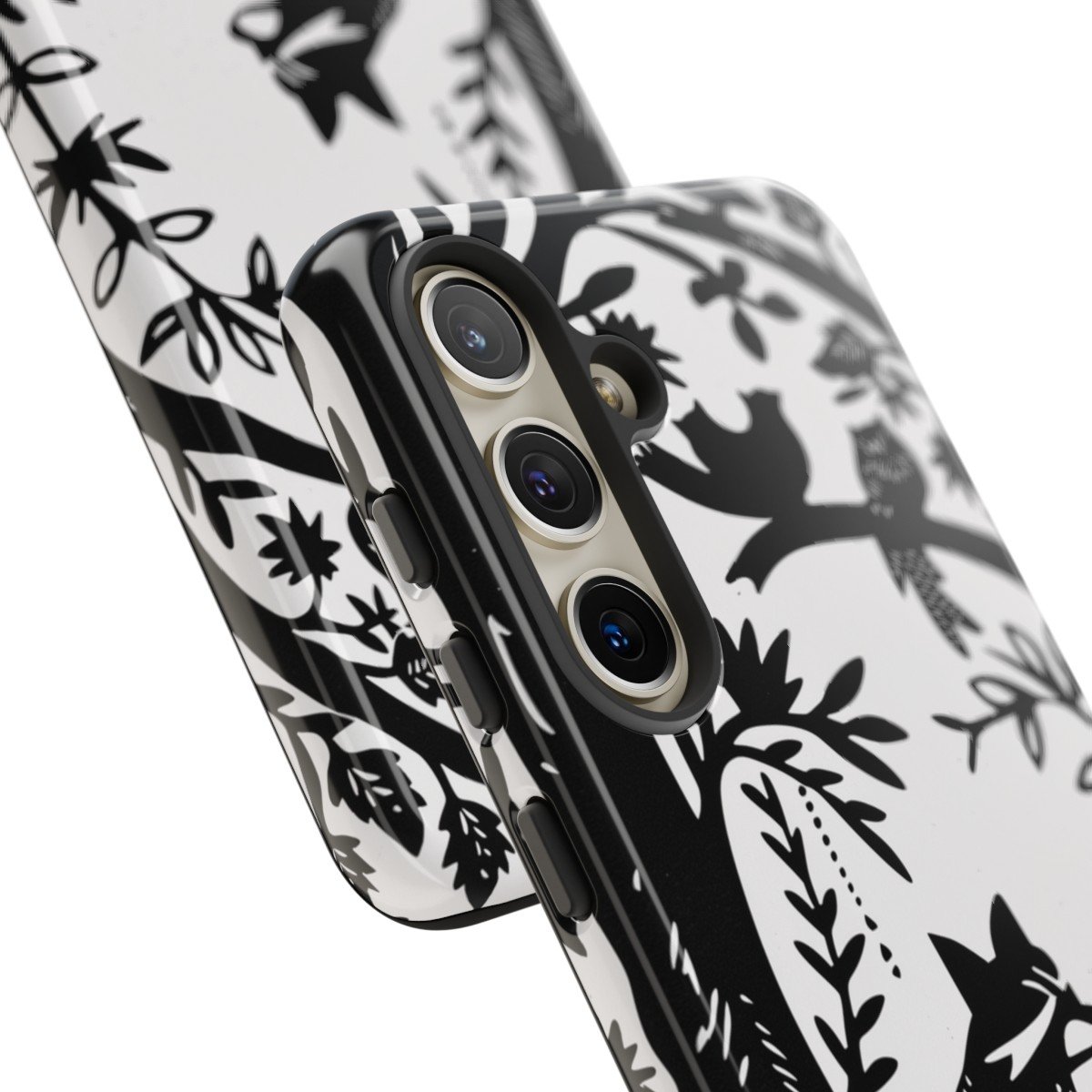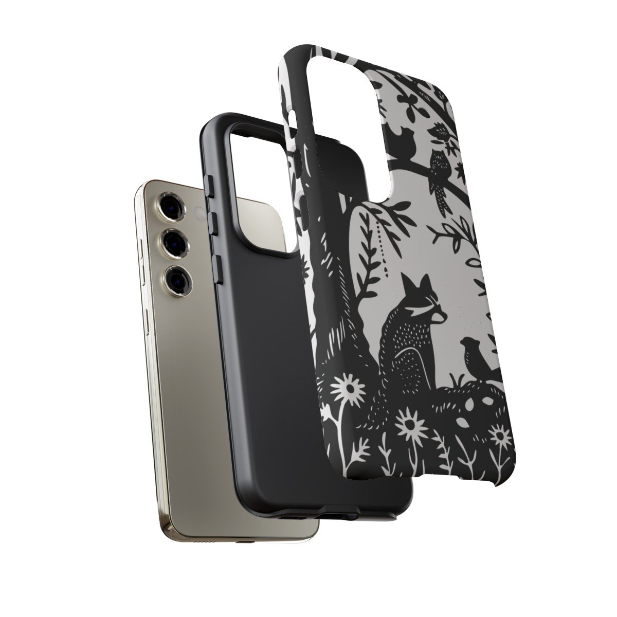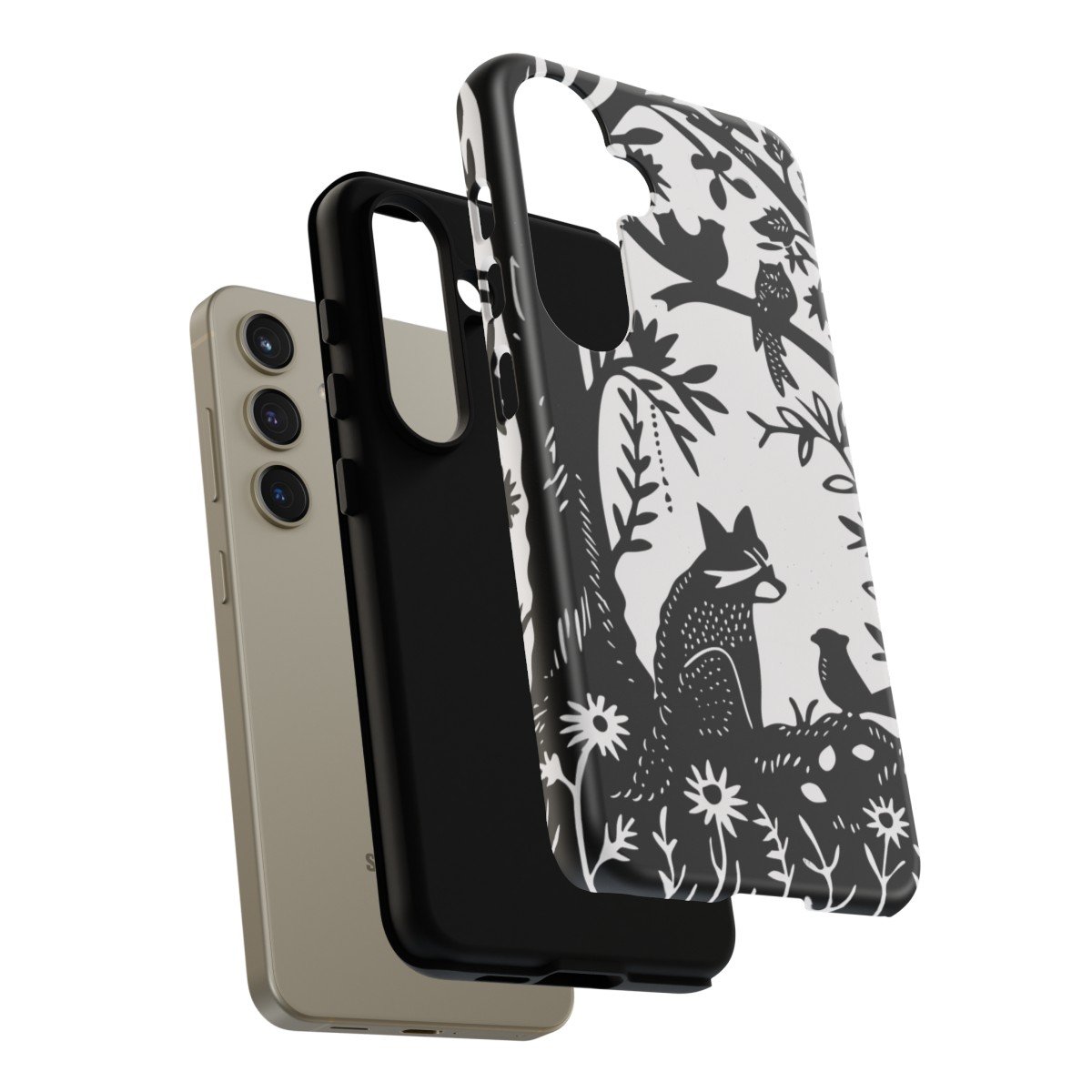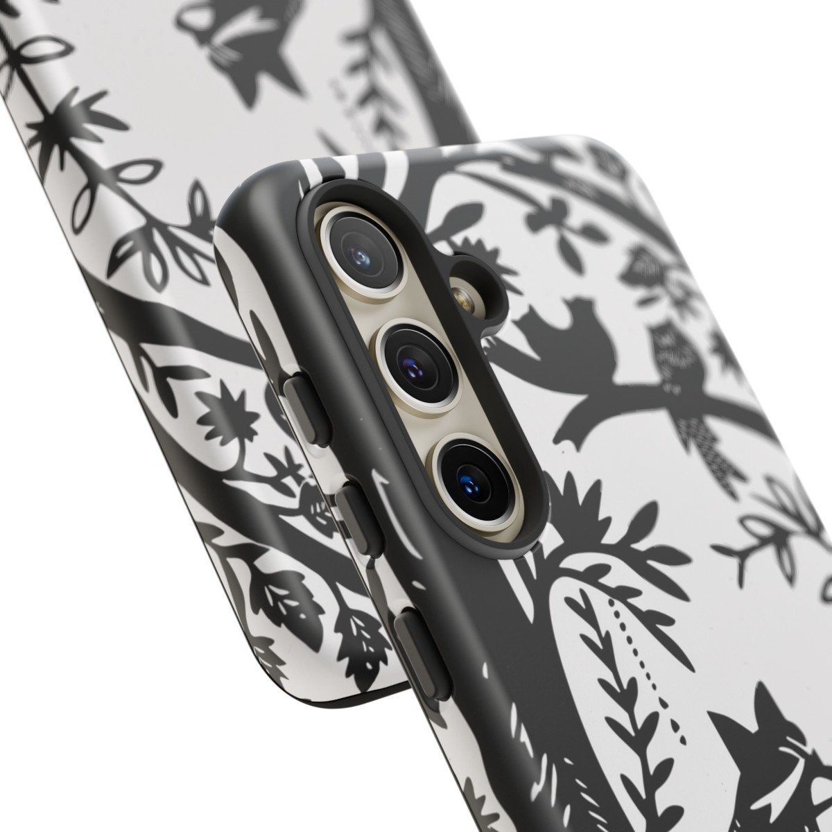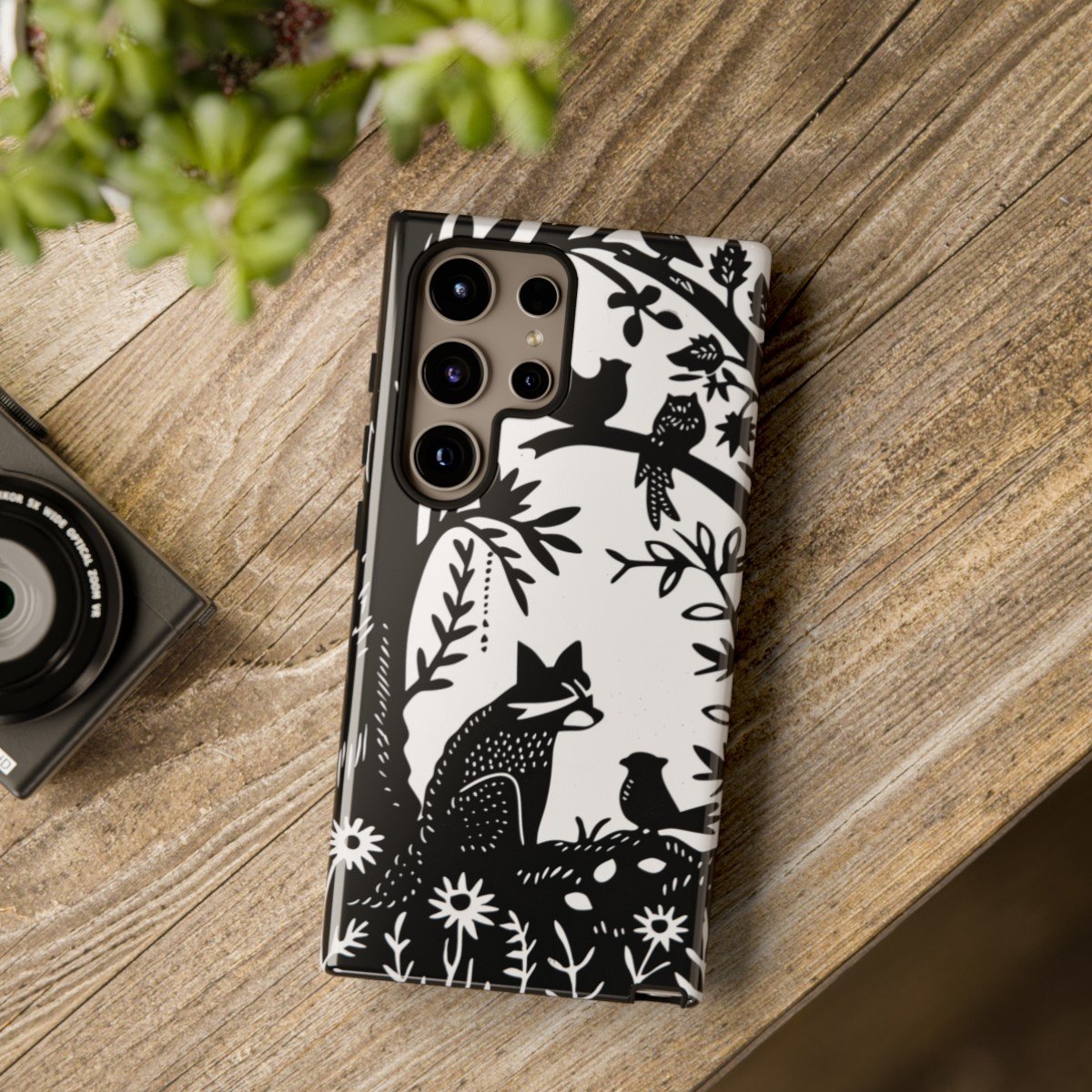 Retro Linocut Raccoon Birds Tree Flowers – Samsung Galaxy S22 S23 S24 – Cell Phone – Tough Cases.