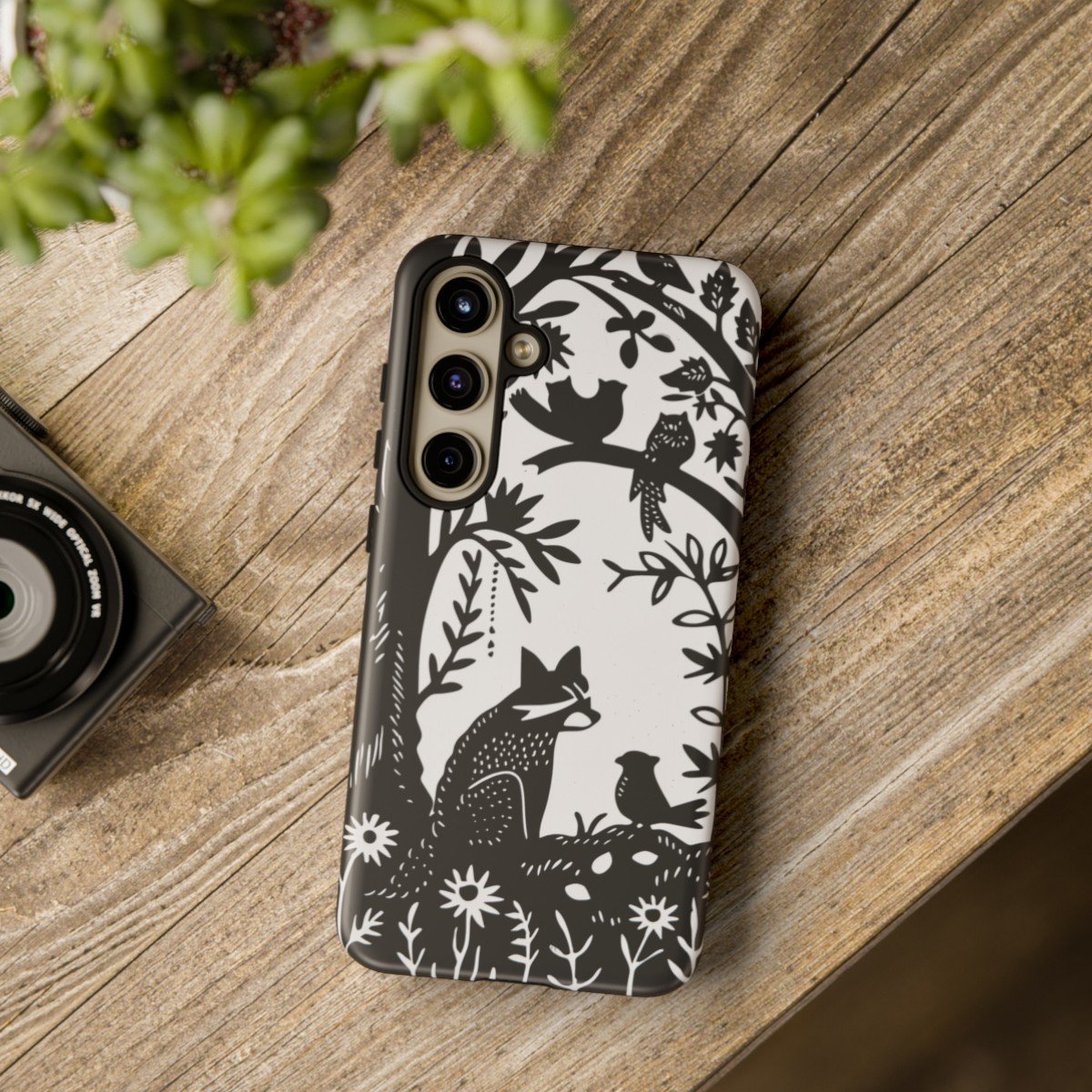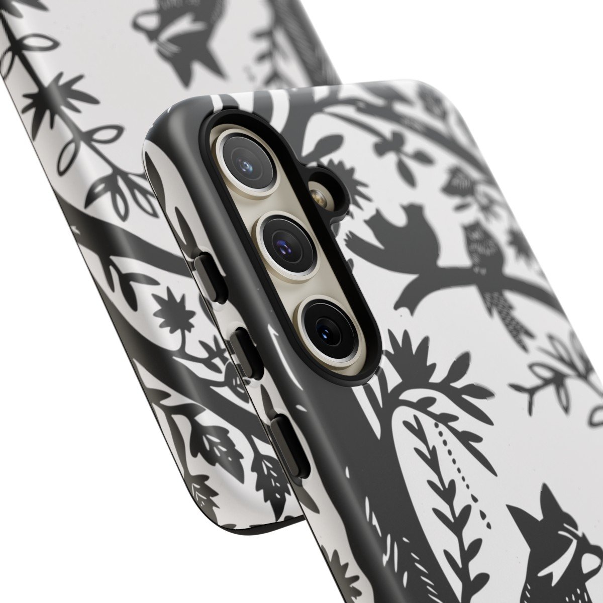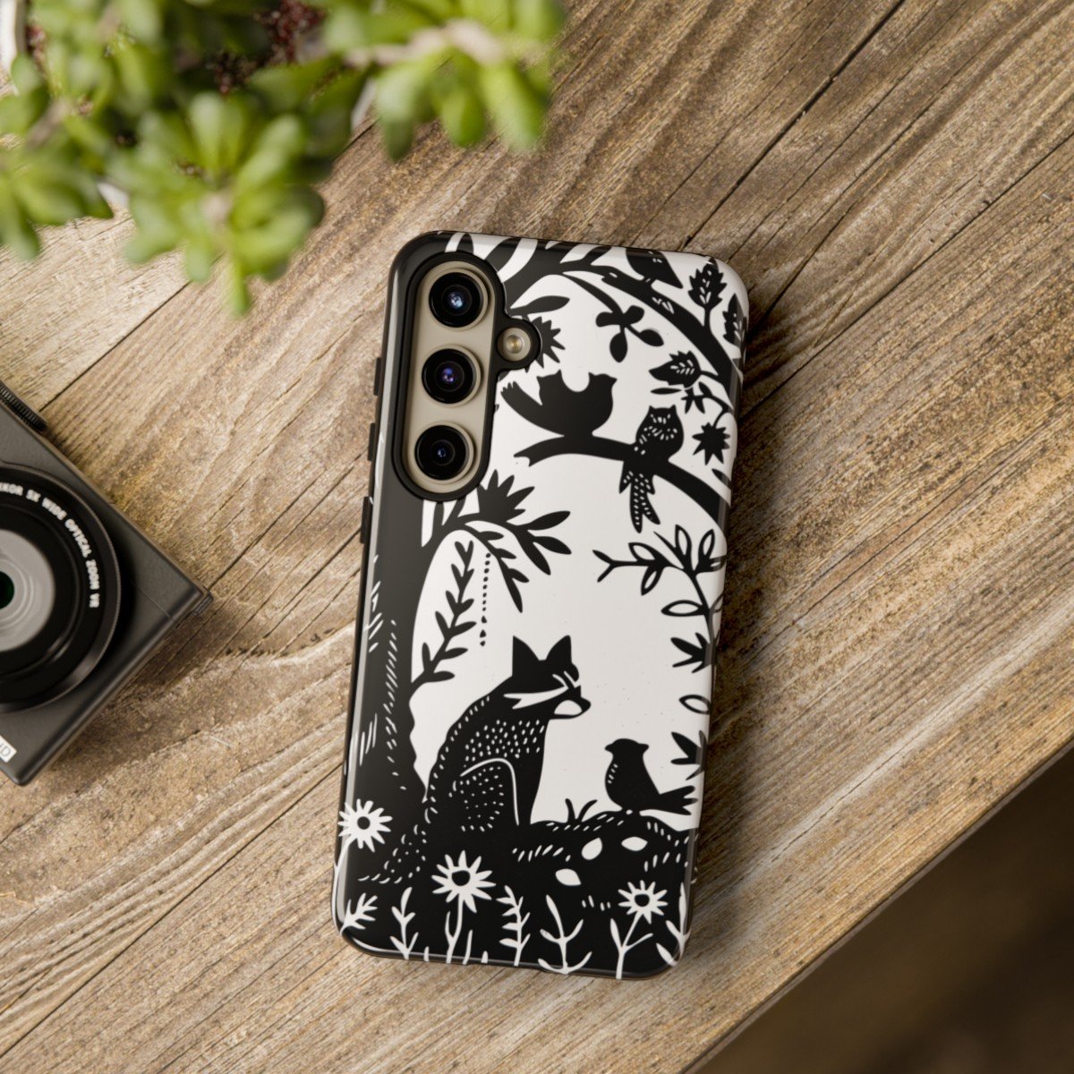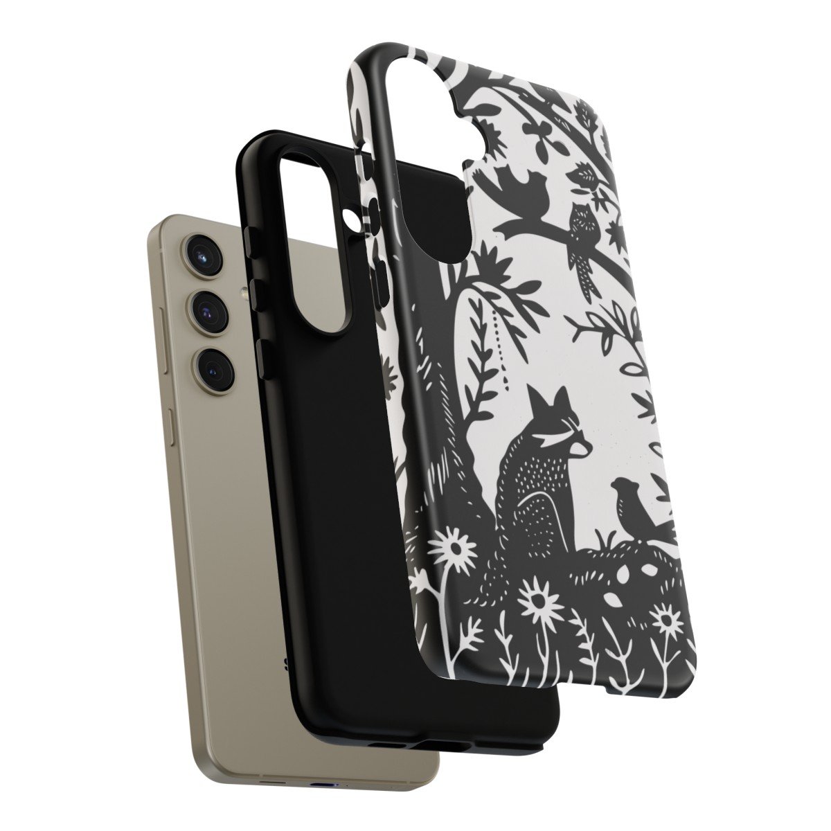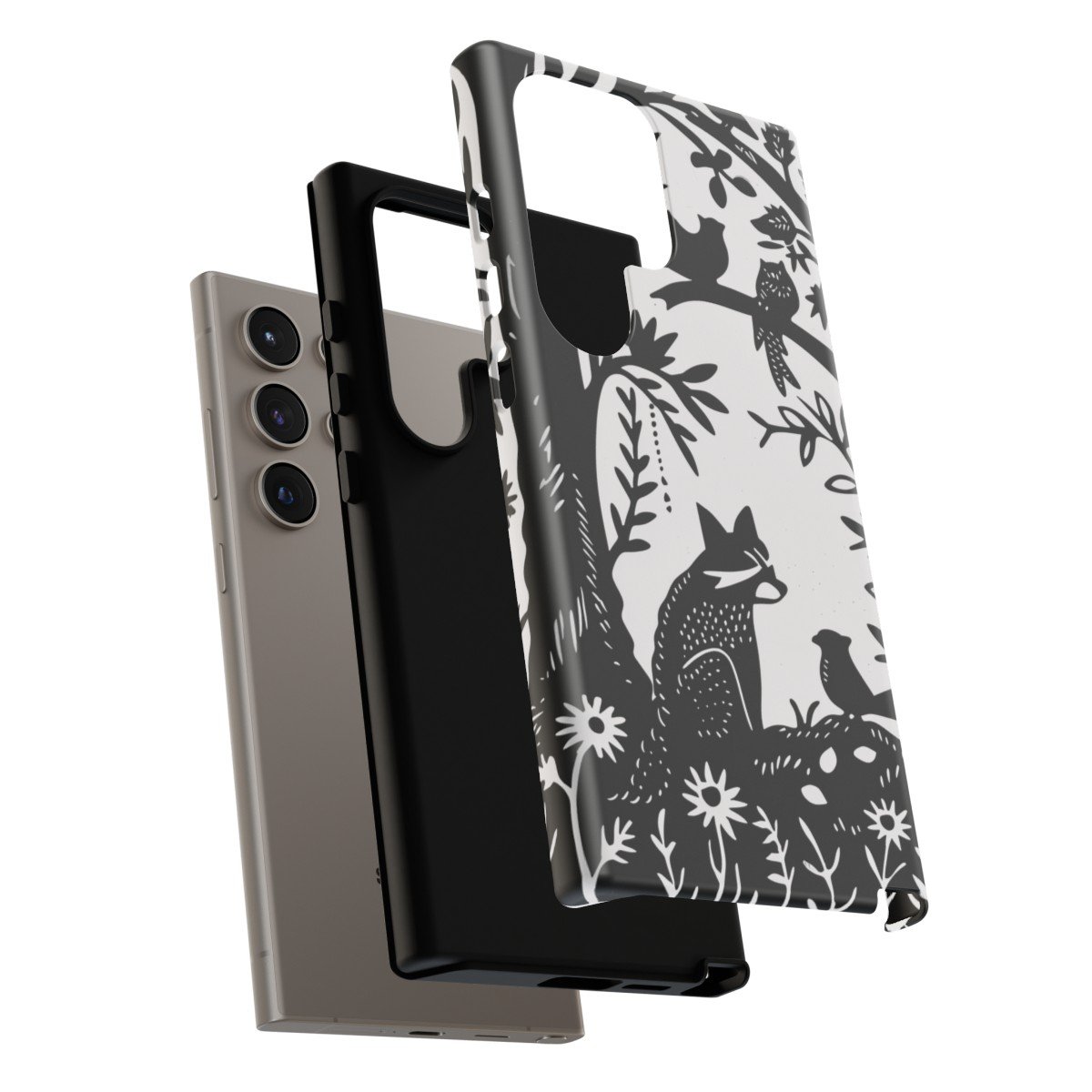 Retro Linocut Raccoon Birds Tree Flowers – Samsung Galaxy S22 S23 S24 – Cell Phone – Tough Cases.