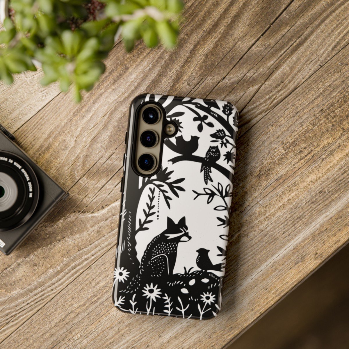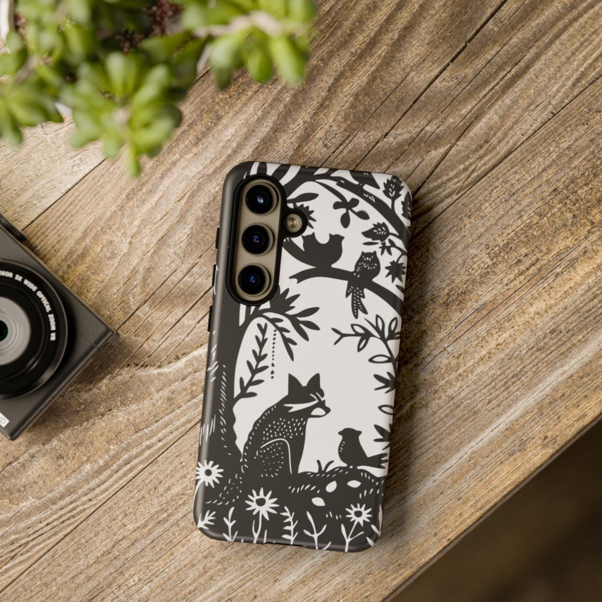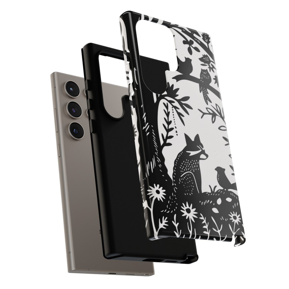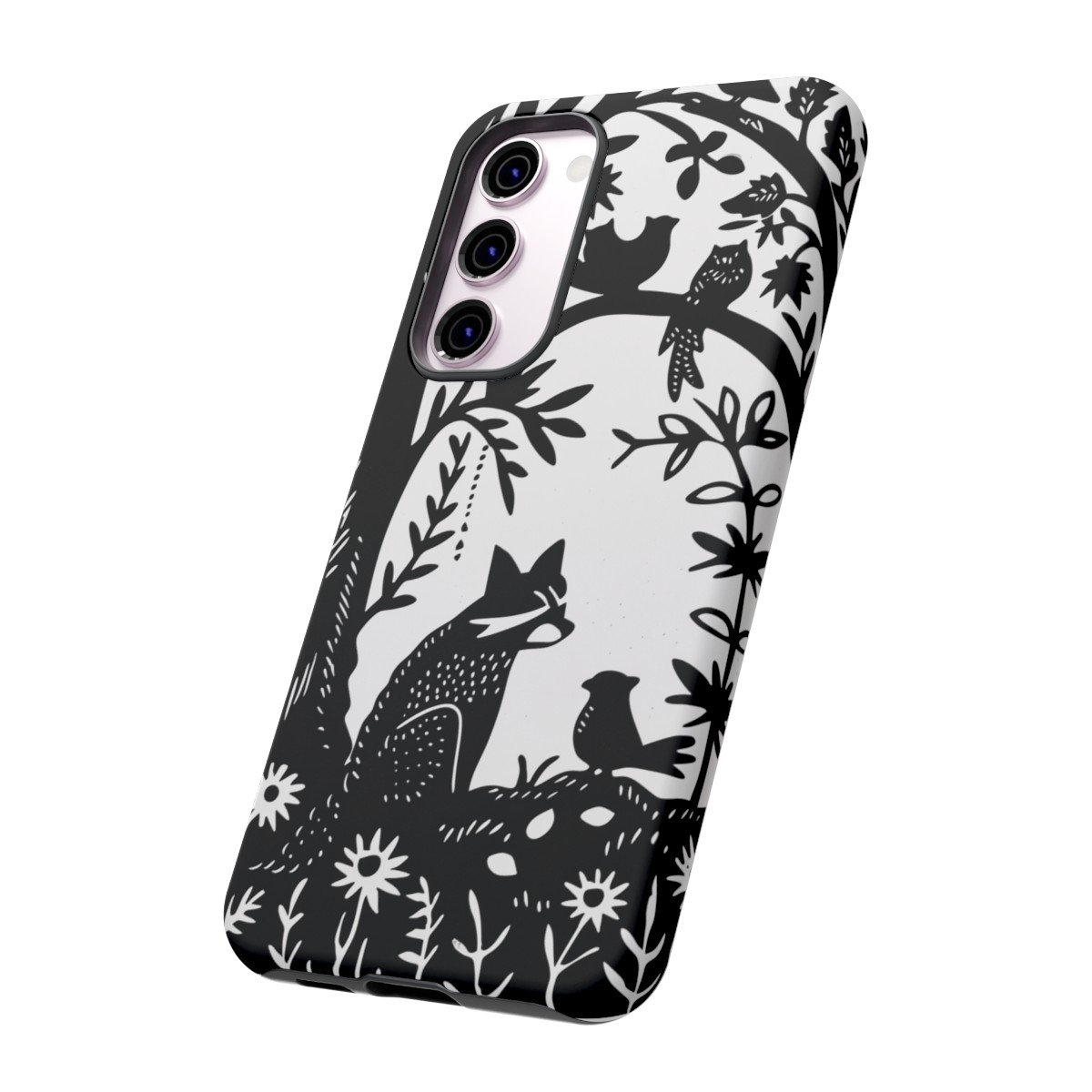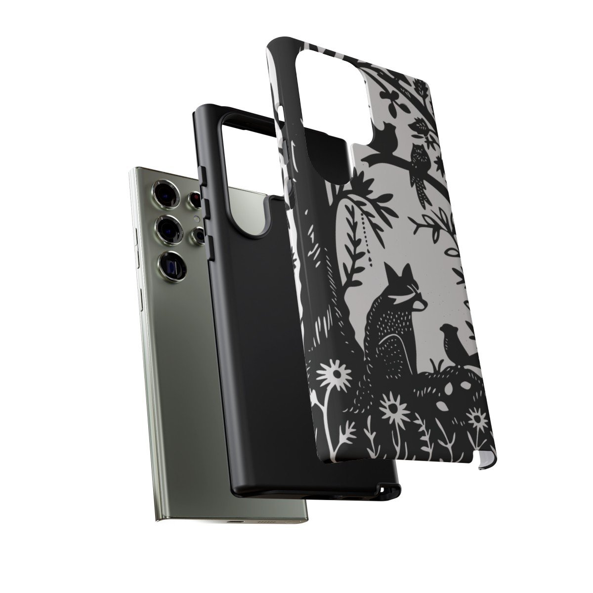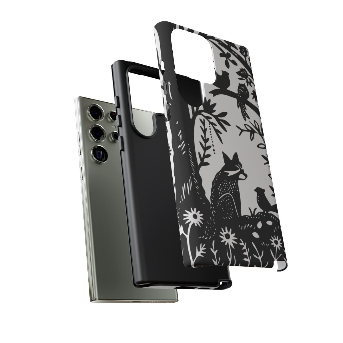 Retro Linocut Raccoon Birds Tree Flowers – Samsung Galaxy S22 S23 S24 – Cell Phone – Tough Cases.